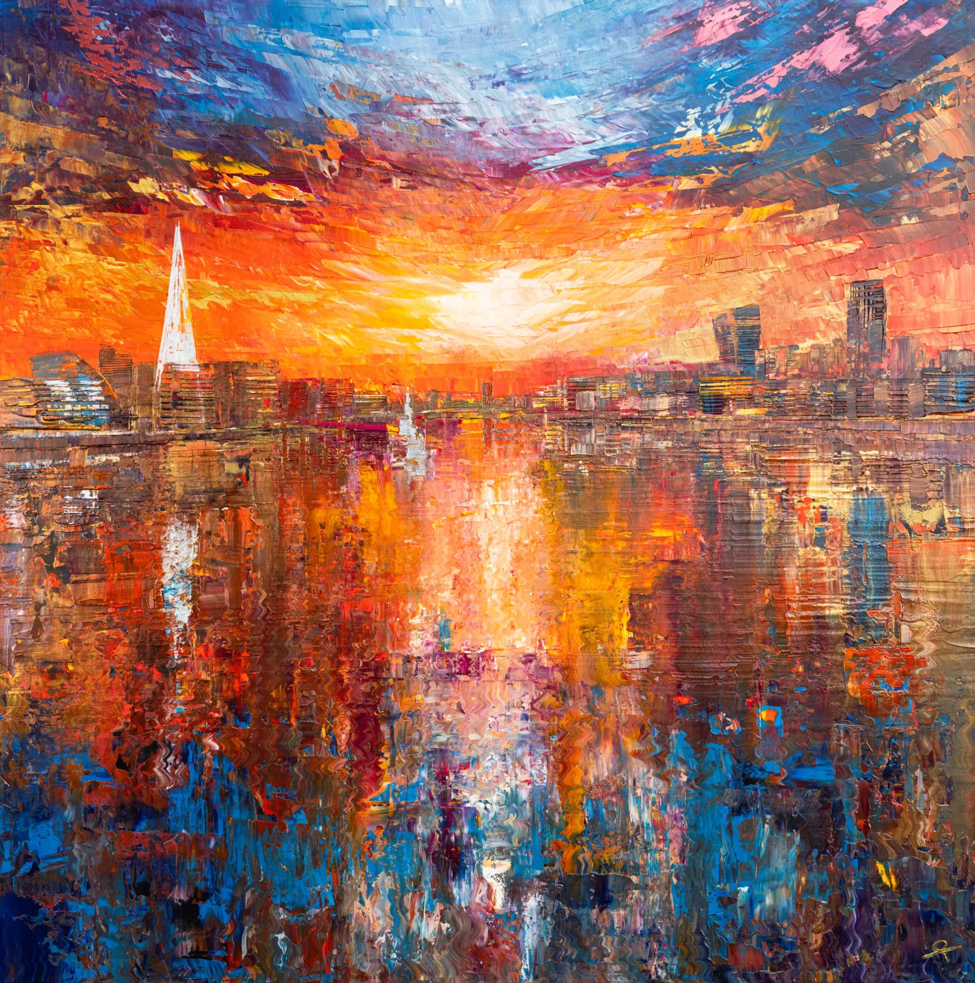 Kenton's paintings are built through an instinctive, physical process — throwing, dripping and scraping layers of oil and acrylic across aluminium, canvas and wood. From that initial chaos, vivid impressionistic cityscapes emerge. His work captures the restless energy of cities, making rigid urban structures feel alive with colour, movement and light.