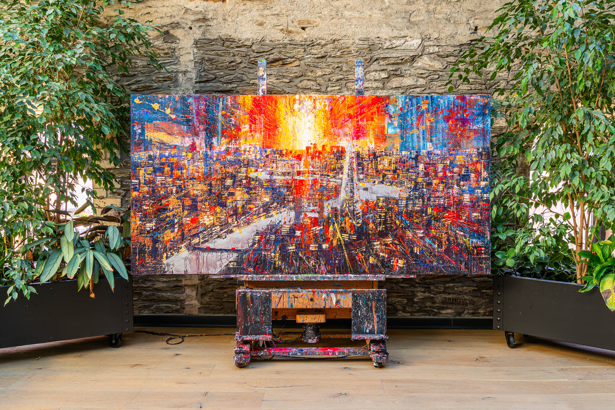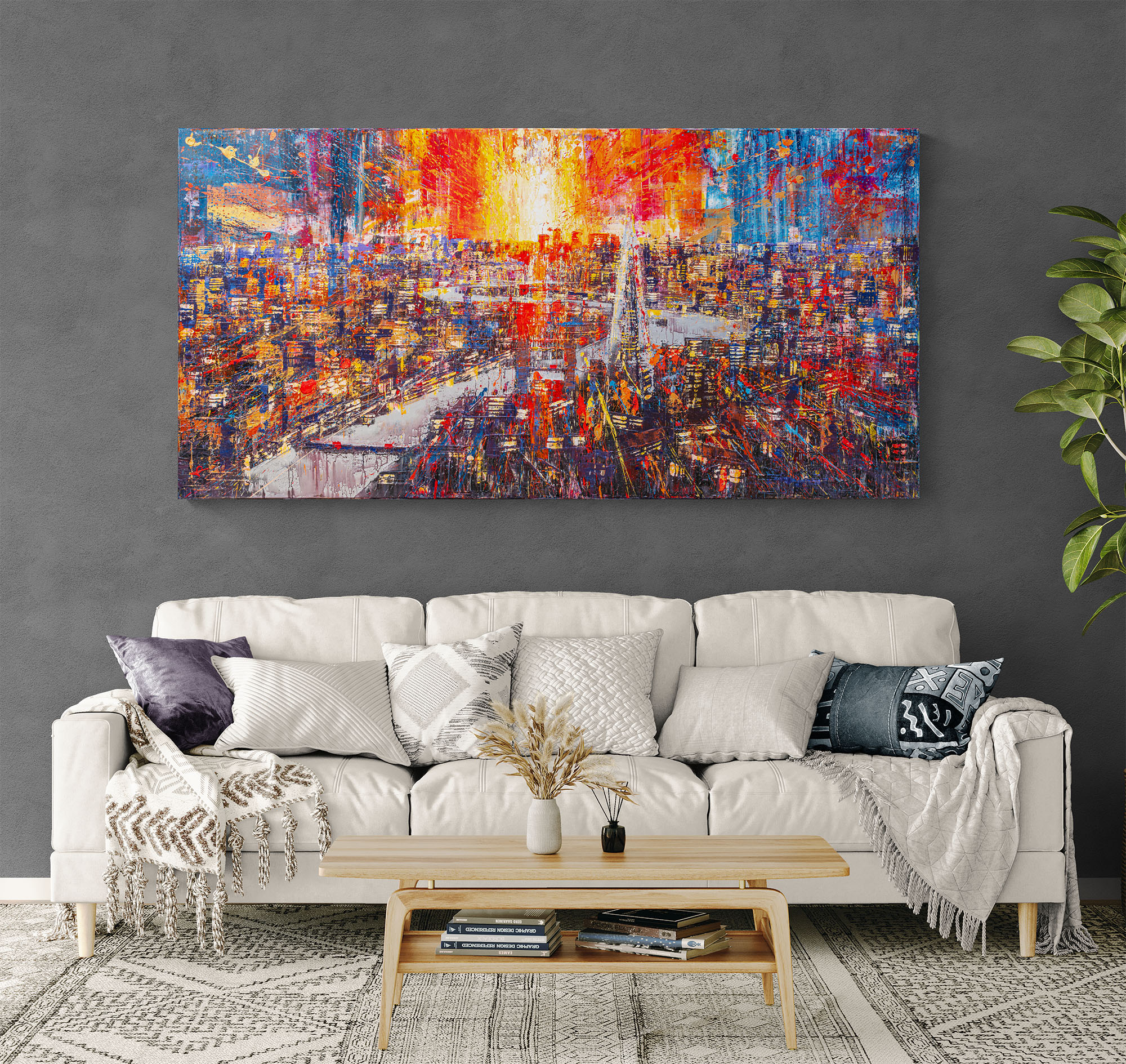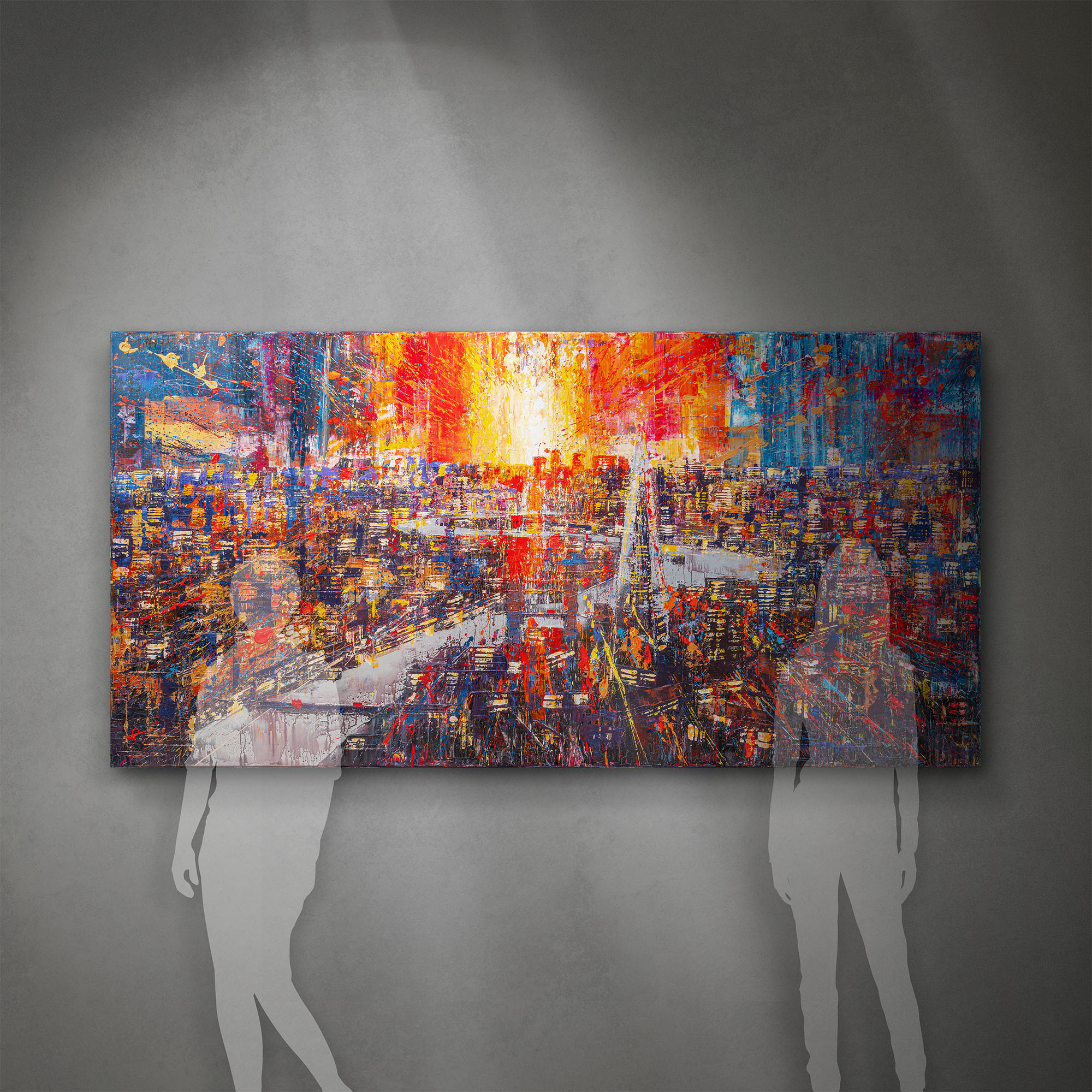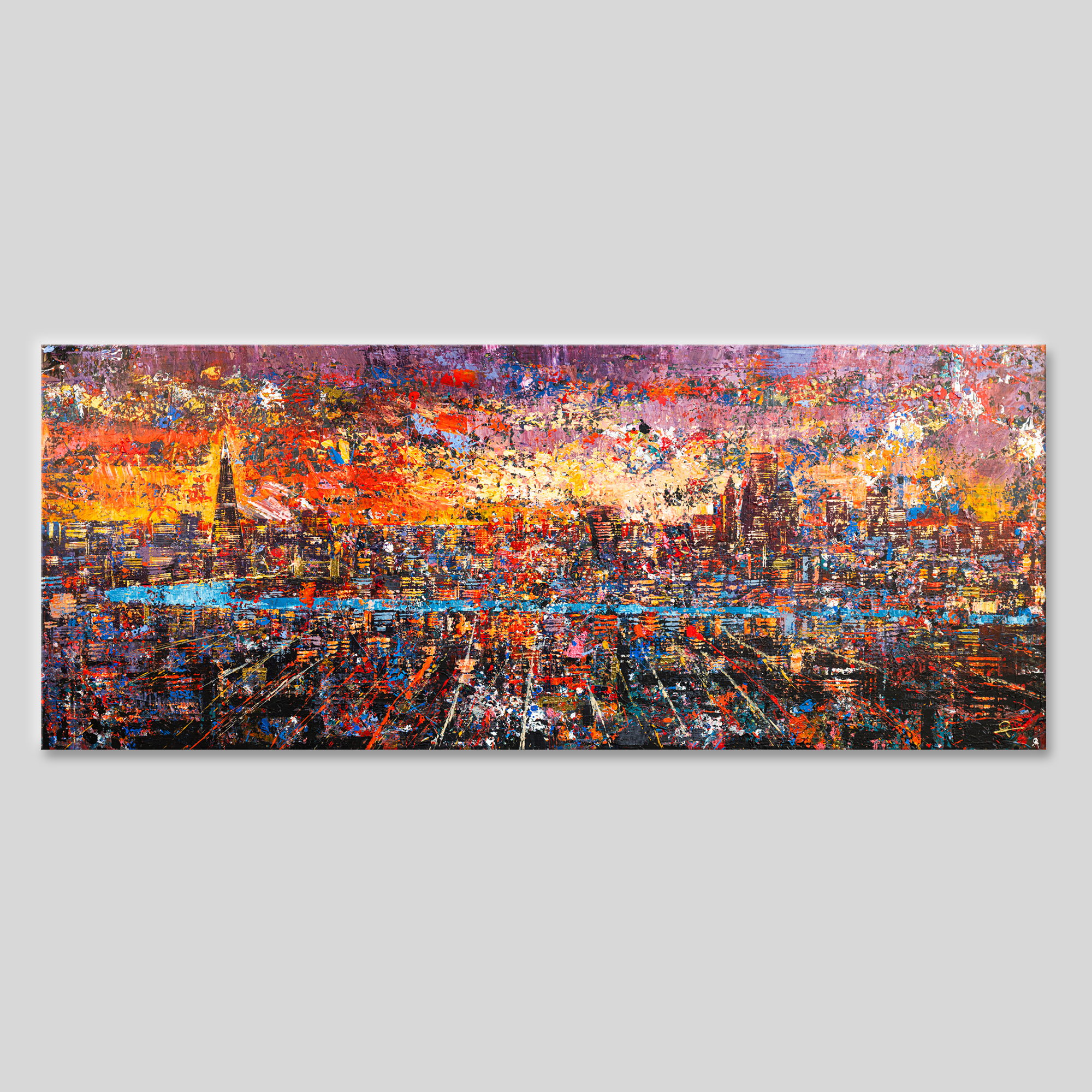 122 x 244 cm | 48 x 96 in [media]. A dramatic London skyline transformed by a blazing, impasto-textured sunset.. London Contemporary Art Original Painting by Contemporary Cityscape Artist Paul Kenton. Available to Purchase.