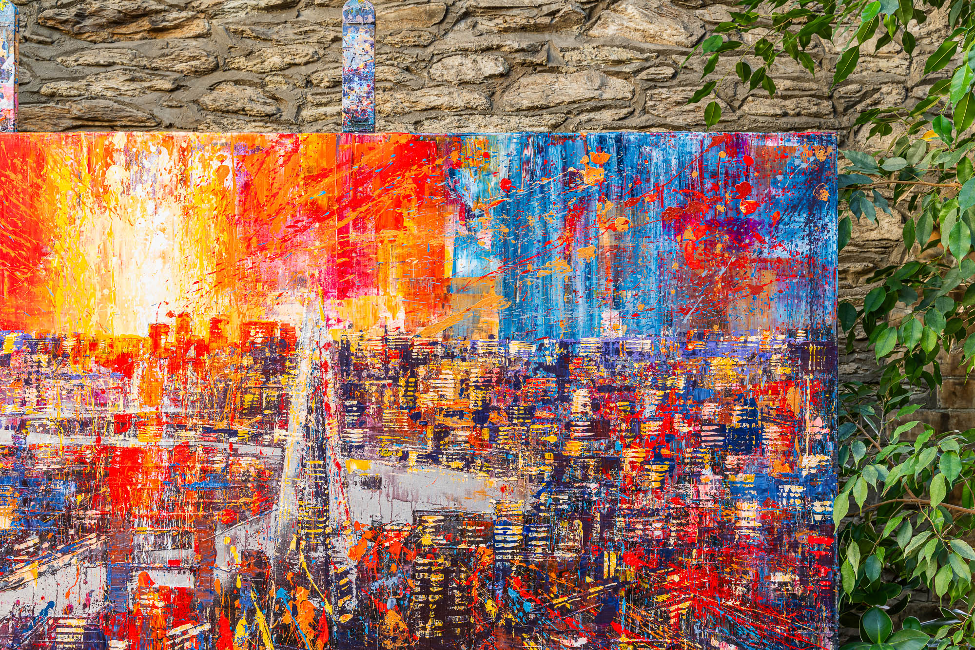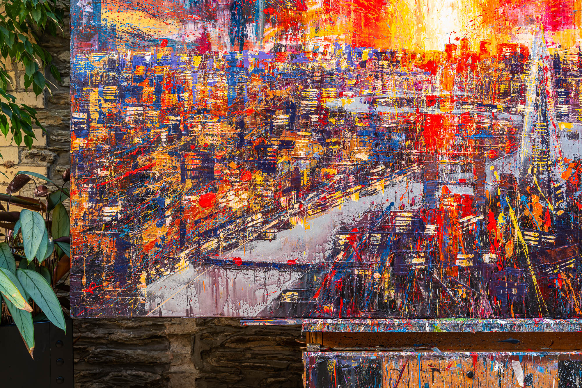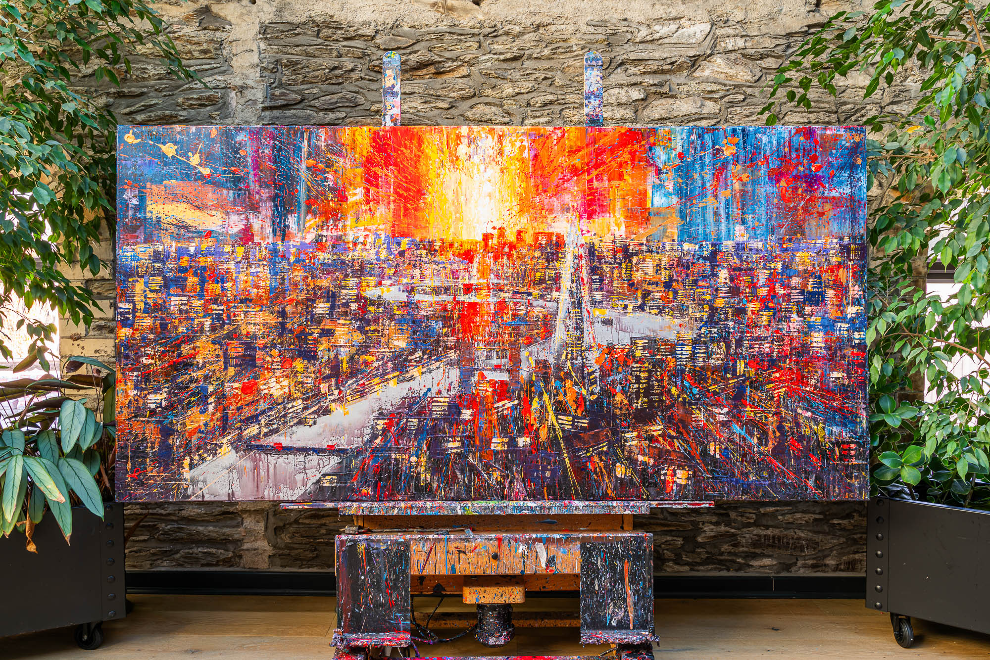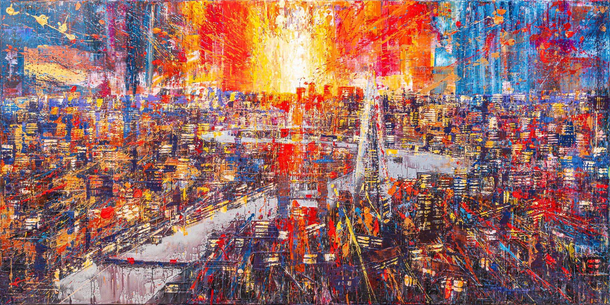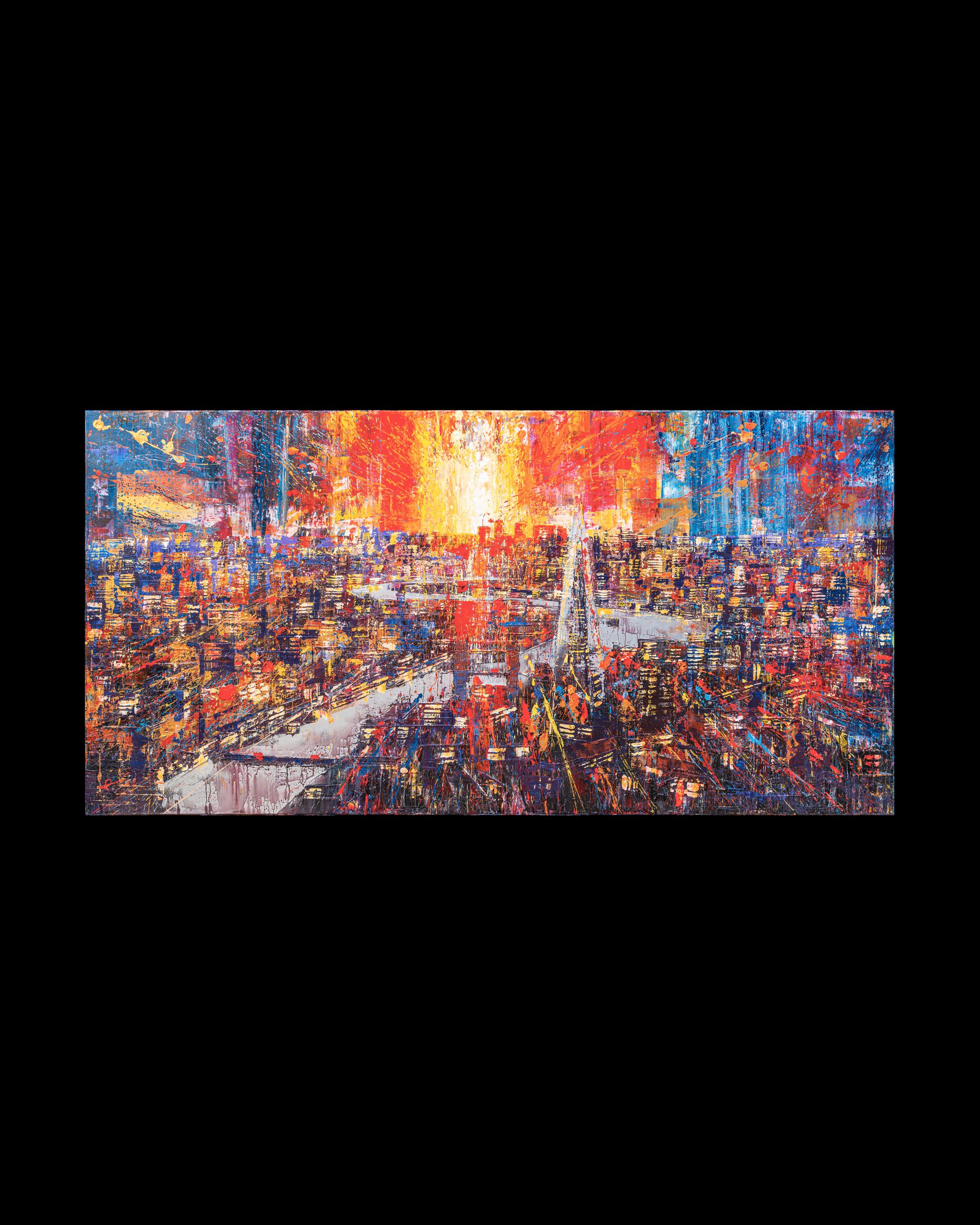A sweeping blaze of sunset colour rolls across London, casting the skyline in vivid reds, golds, and electric blues. Impasto textures and energetic splashes of paint amplify the sense of movement, while the Shard stands bright against the sky, reflected in the molten shimmer of the Thames.