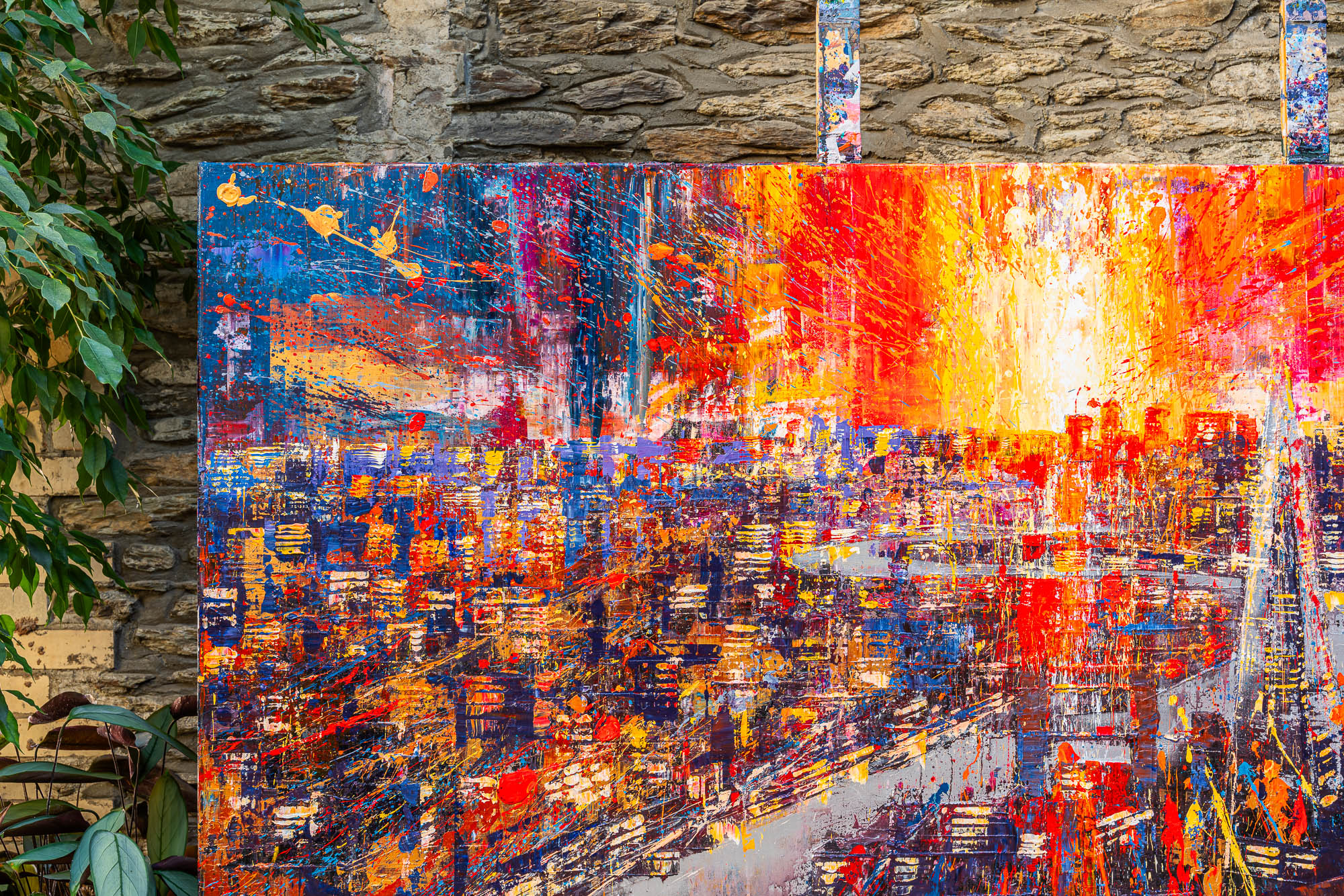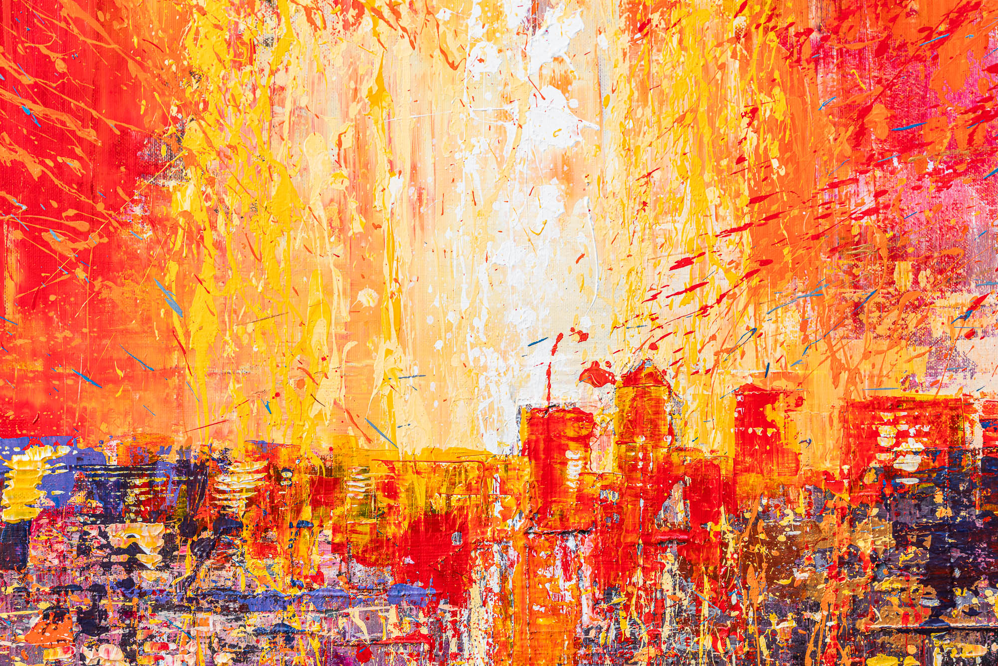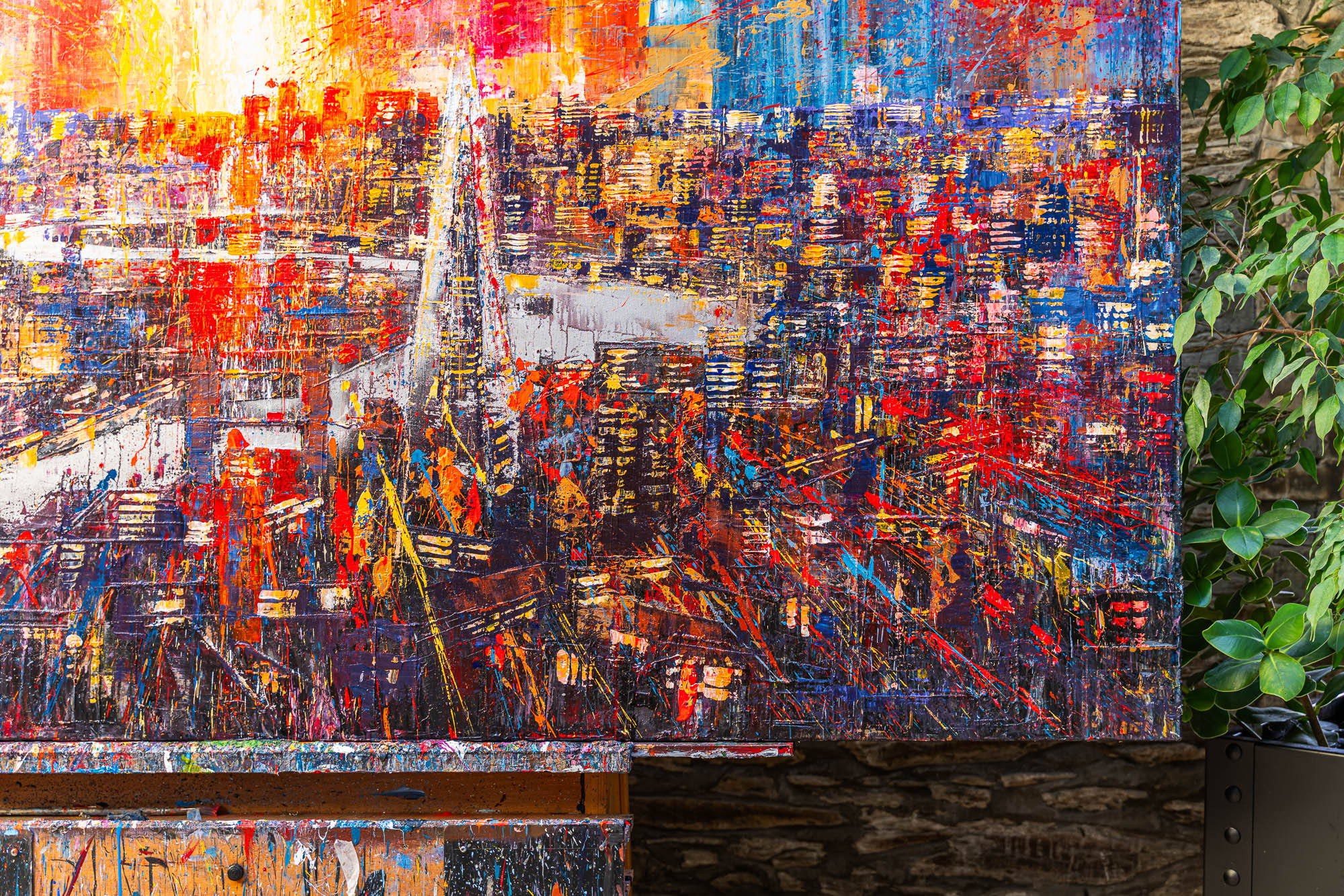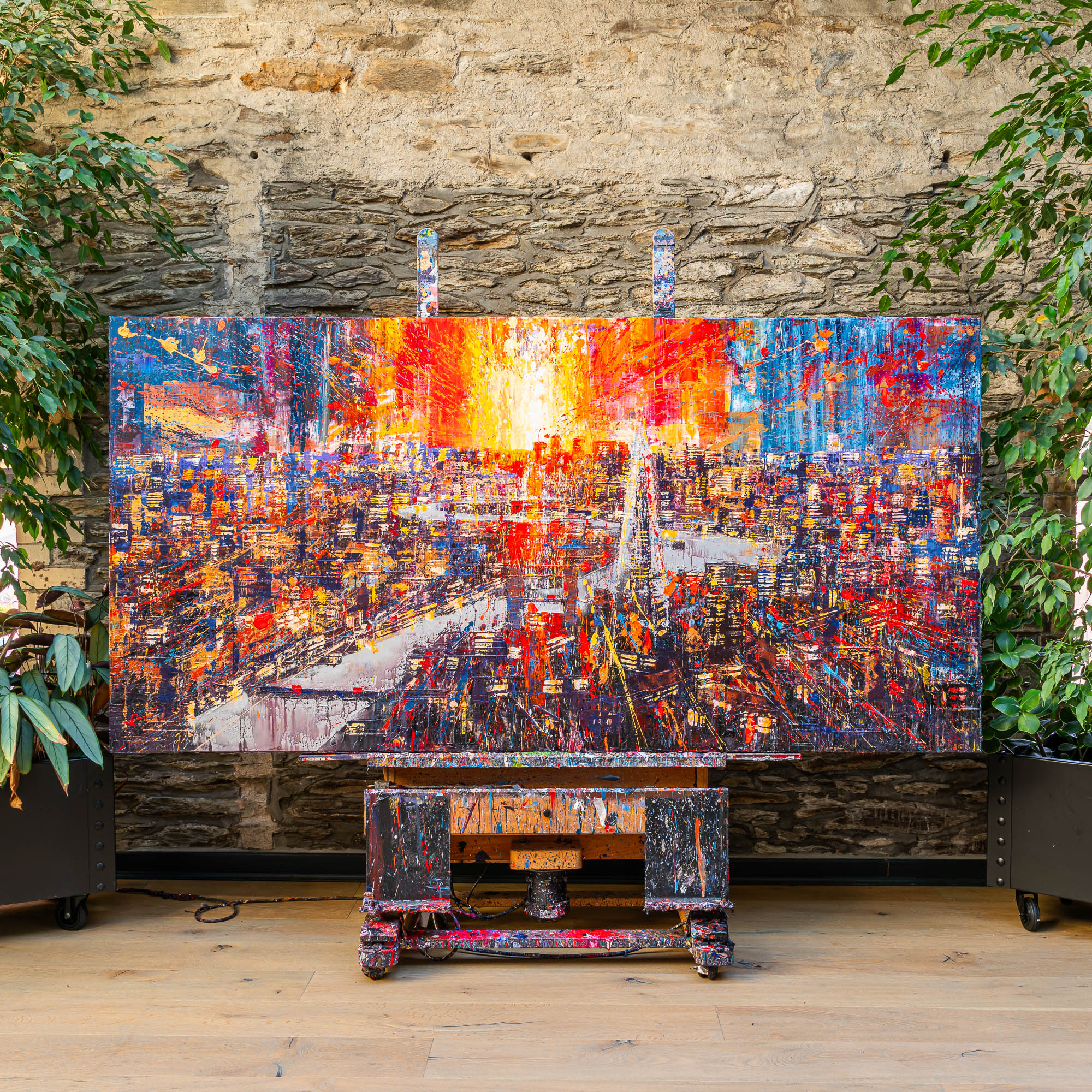 A sweeping blaze of sunset colour rolls across London, casting the skyline in vivid reds, golds, and electric blues. Impasto textures and energetic splashes of paint amplify the sense of movement, while the Shard stands bright against the sky, reflected in the molten shimmer of the Thames.