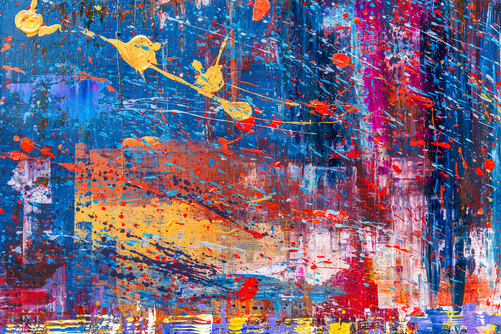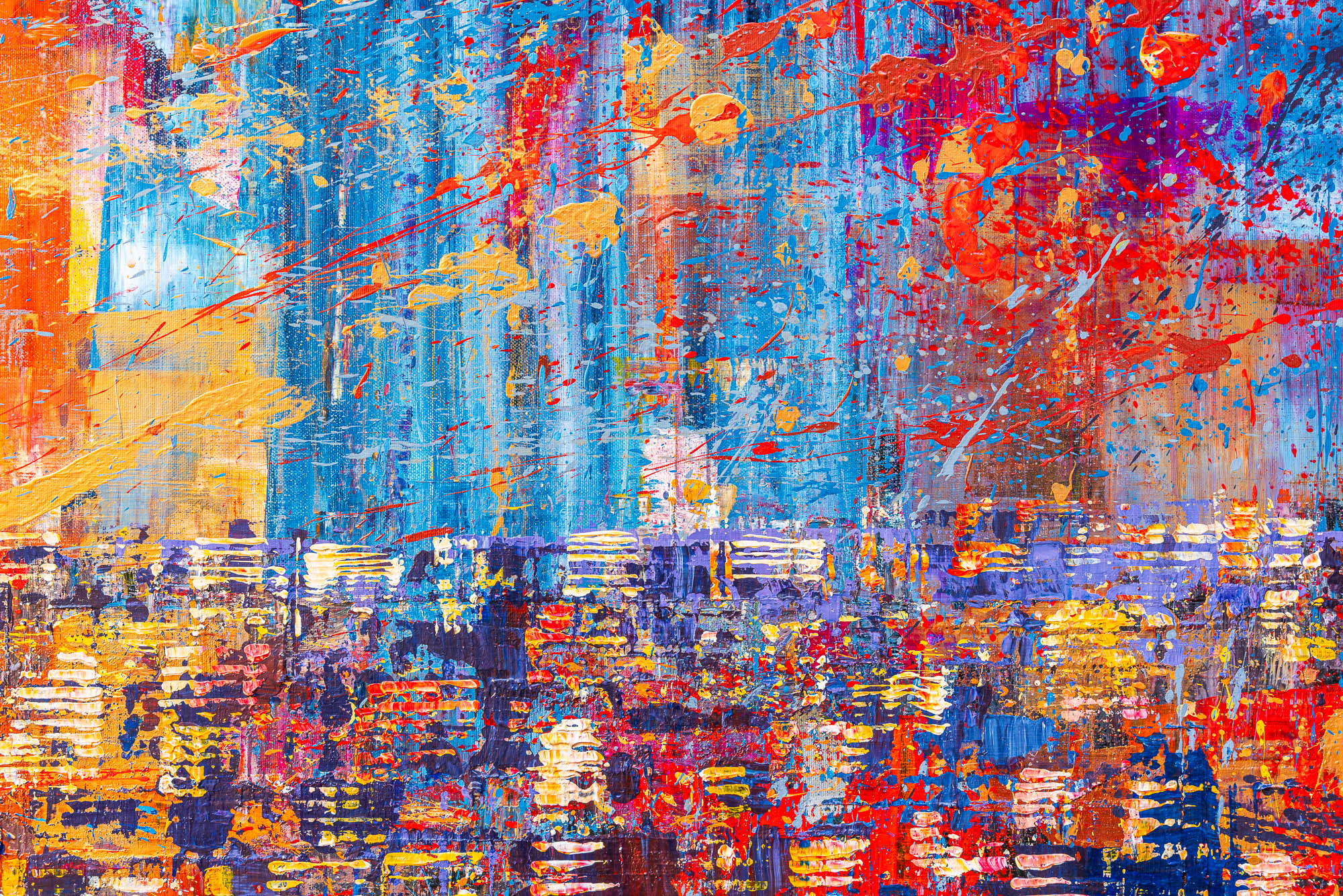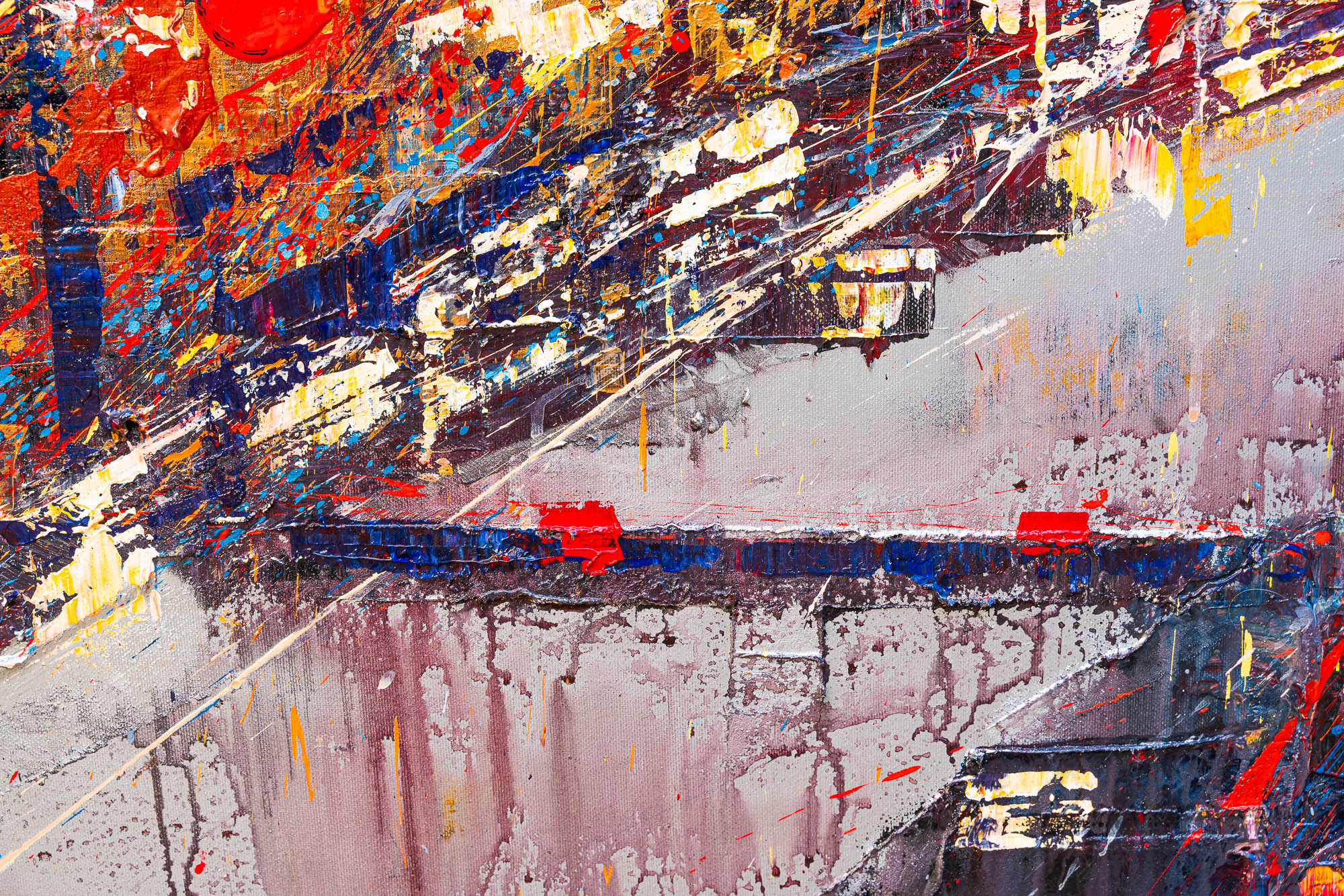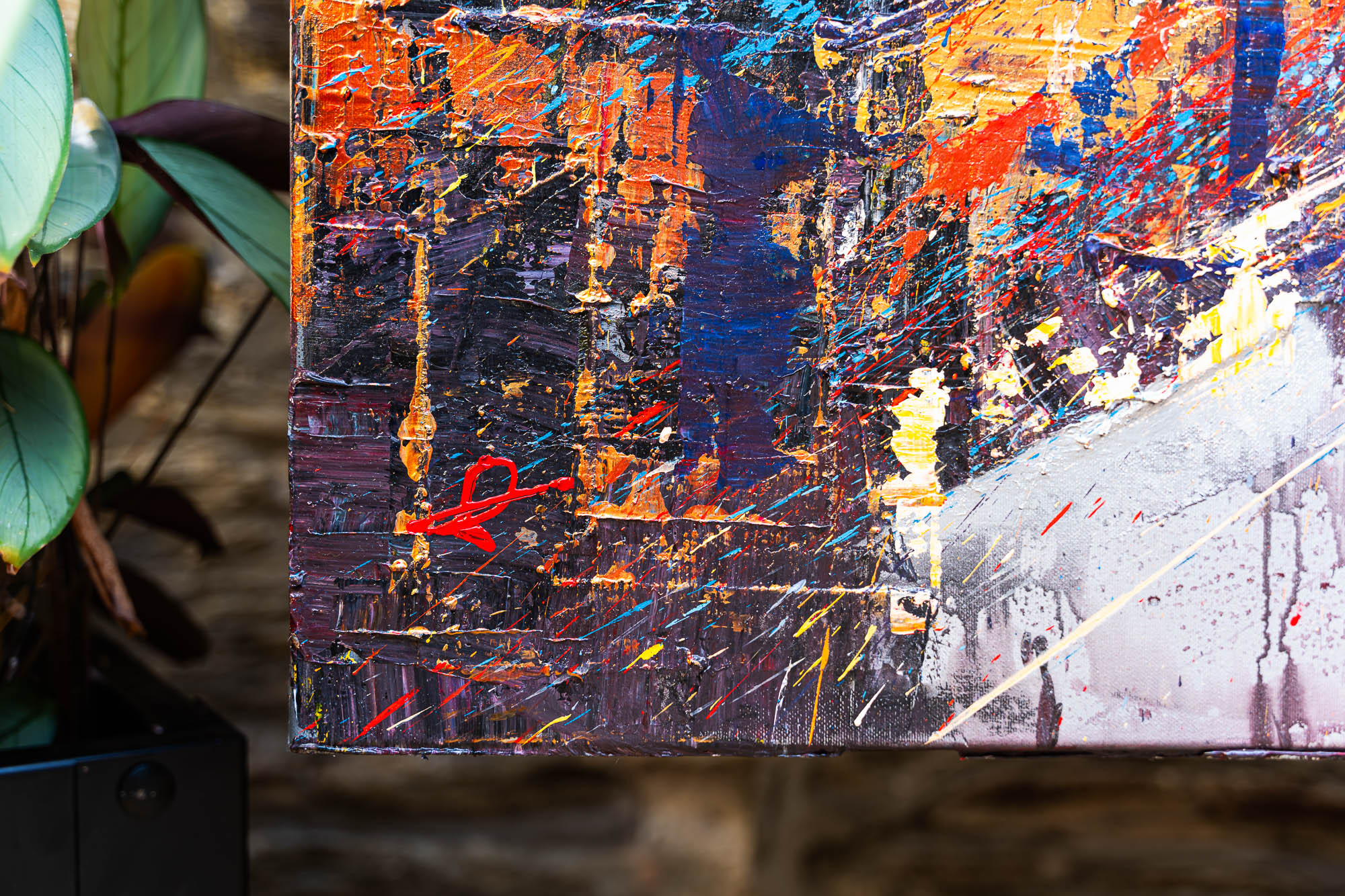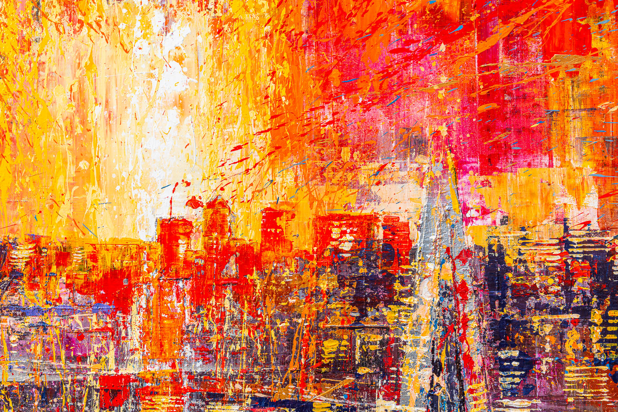 A sweeping blaze of sunset colour rolls across London, casting the skyline in vivid reds, golds, and electric blues. Impasto textures and energetic splashes of paint amplify the sense of movement, while the Shard stands bright against the sky, reflected in the molten shimmer of the Thames.