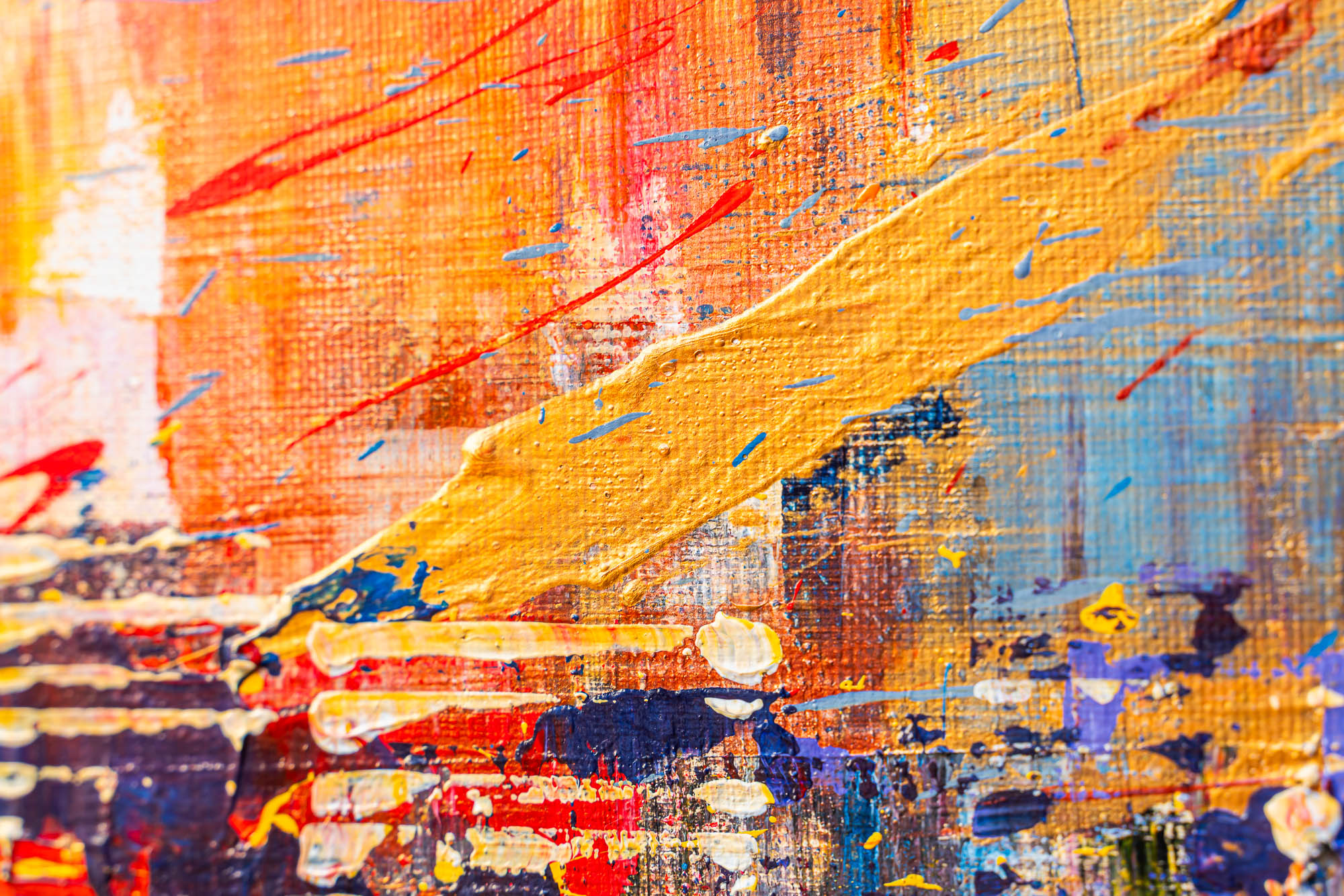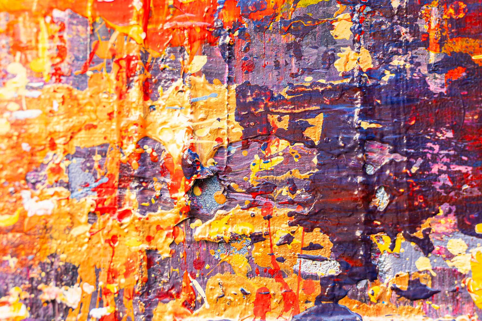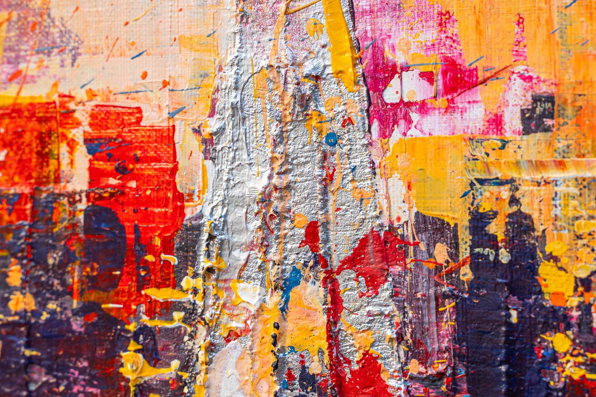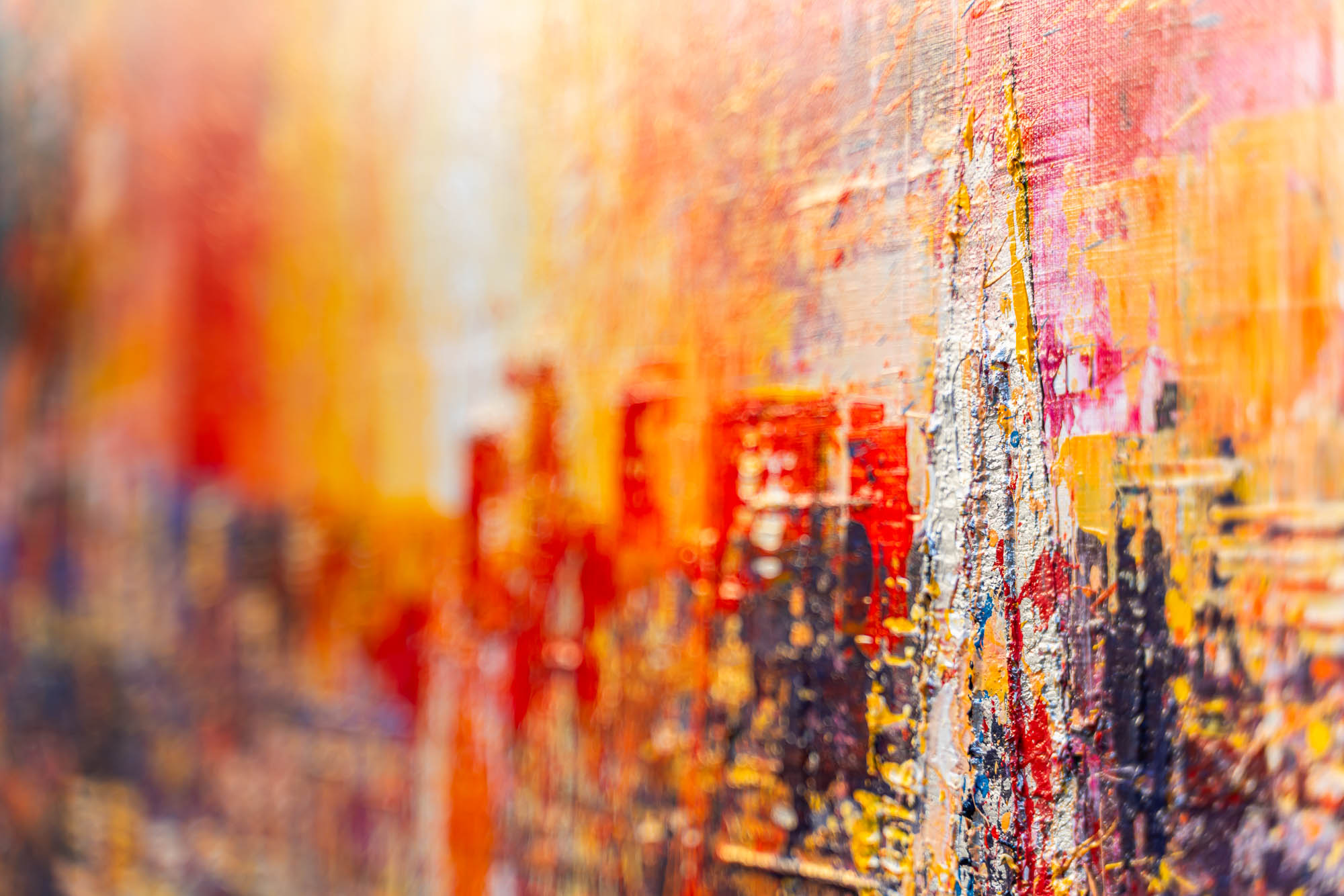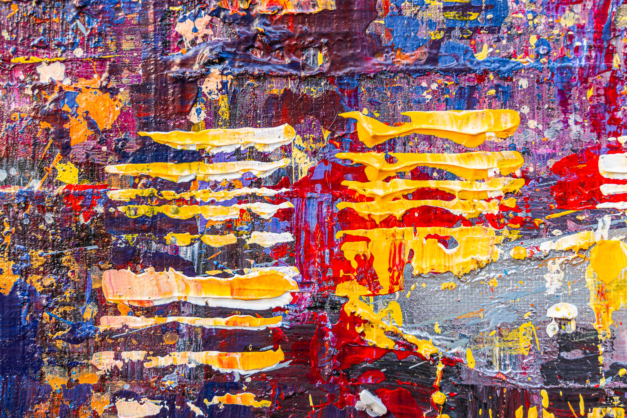 A sweeping blaze of sunset colour rolls across London, casting the skyline in vivid reds, golds, and electric blues. Impasto textures and energetic splashes of paint amplify the sense of movement, while the Shard stands bright against the sky, reflected in the molten shimmer of the Thames.