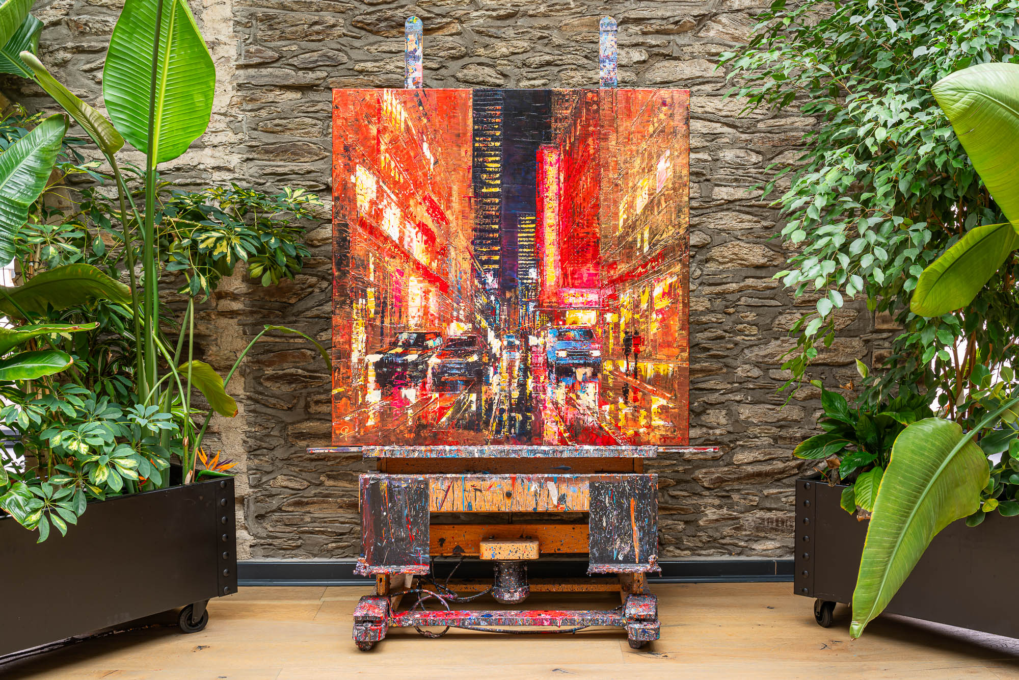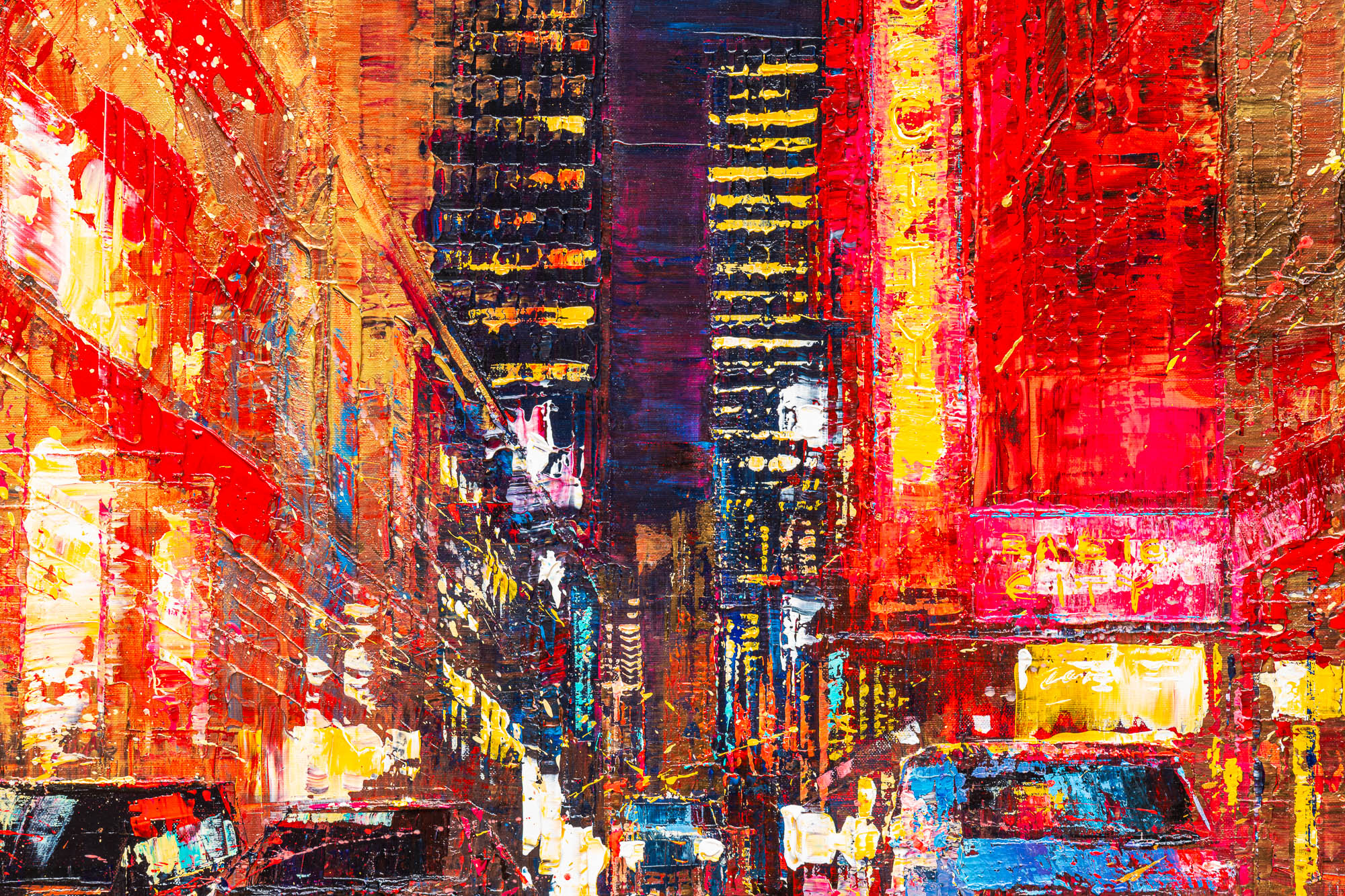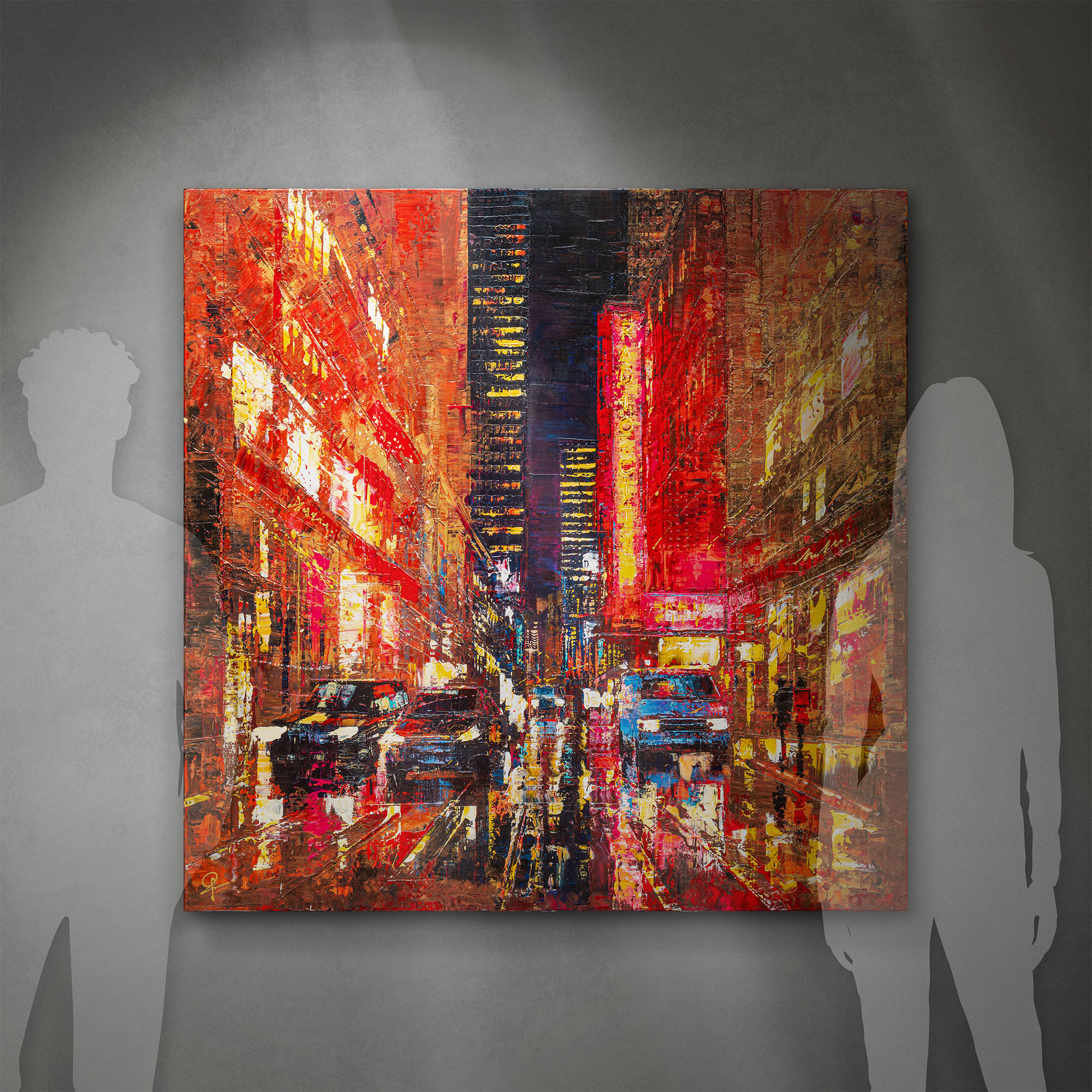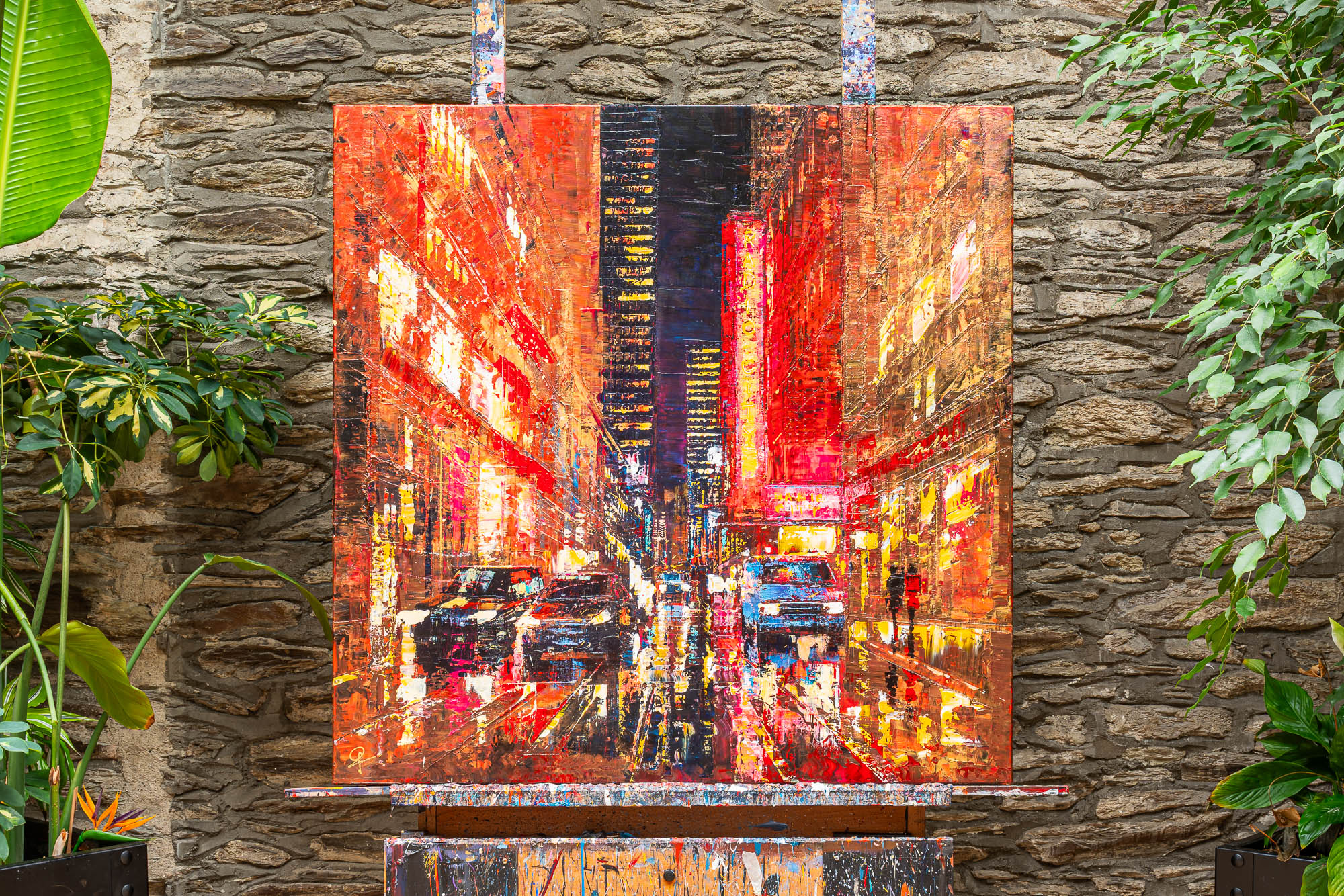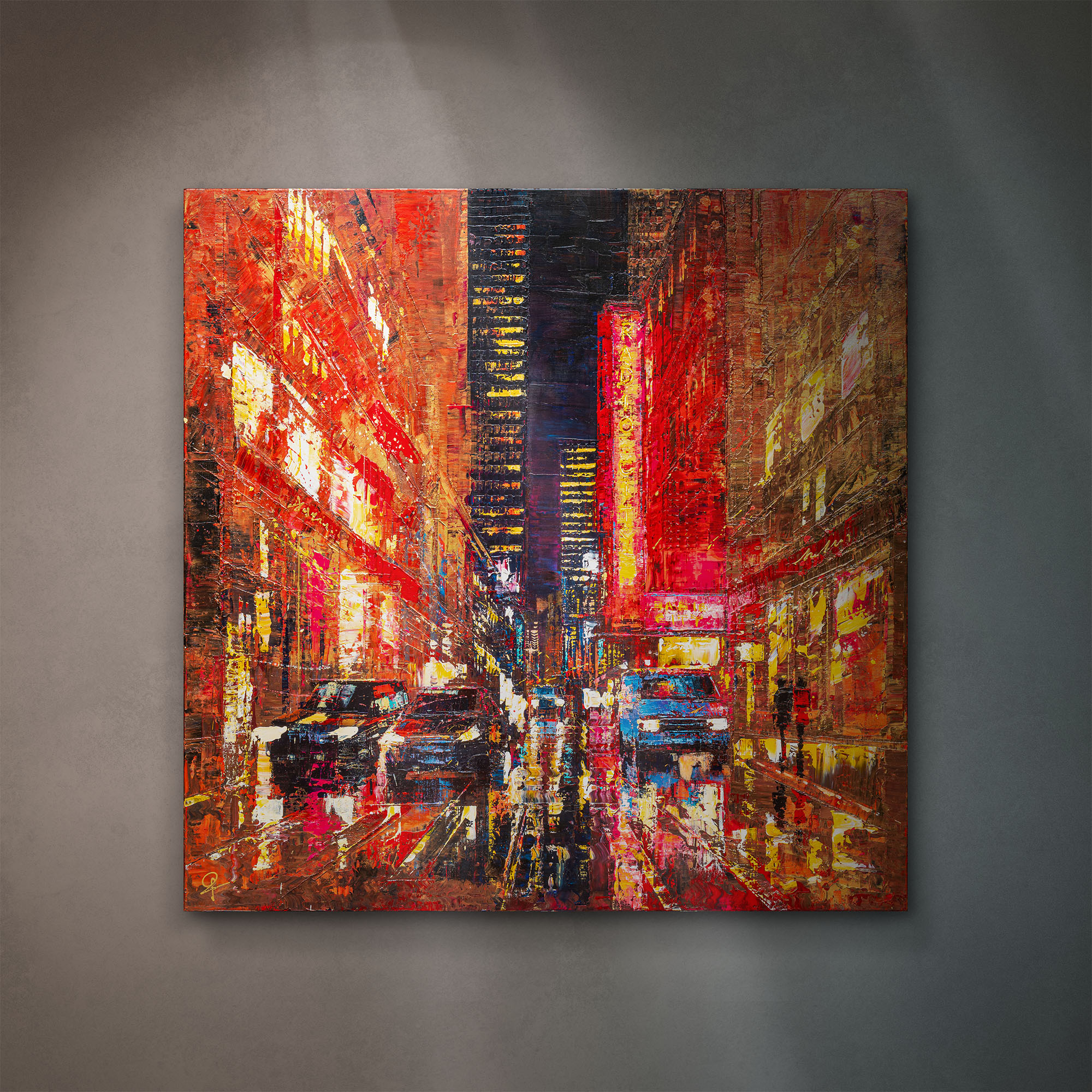 122 x 122 cm | 48 x 48 in [media]. A powerful New York night scene alive with red and gold reflections, capturing the energy and motion of Broadway in thick, metallic texture.. New York Contemporary Art Original Painting by Contemporary Cityscape Artist Paul Kenton. Available to Purchase.