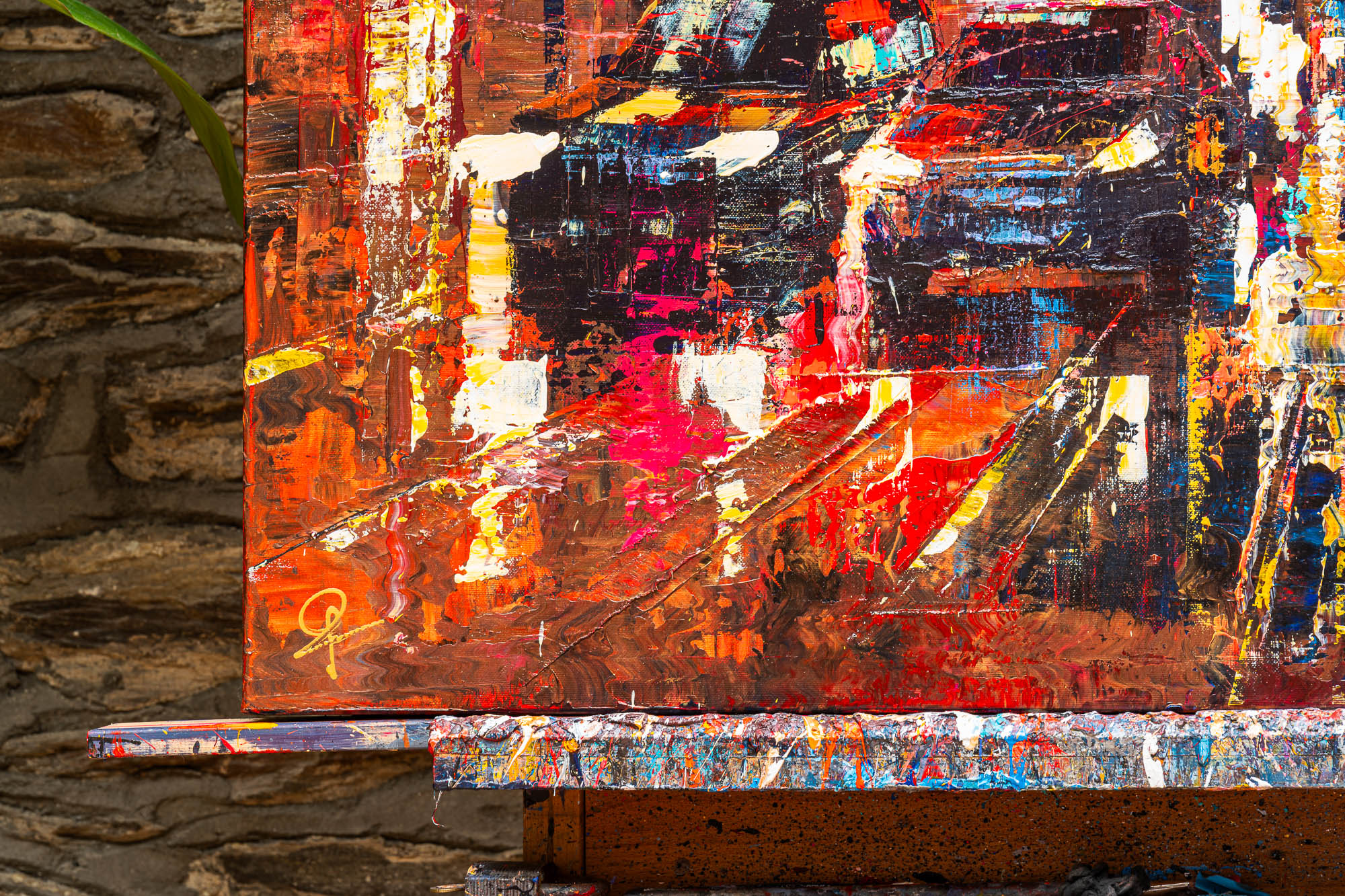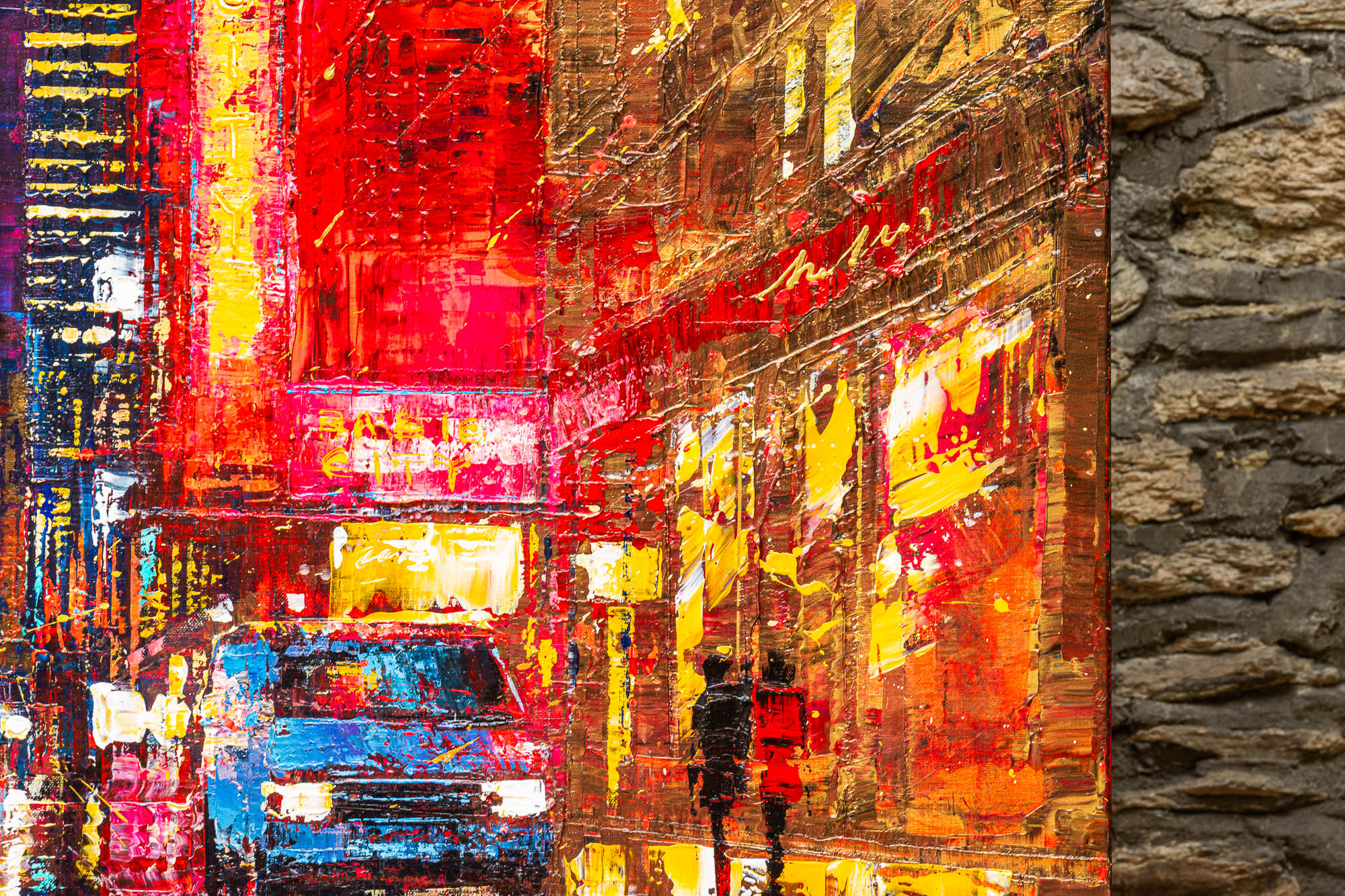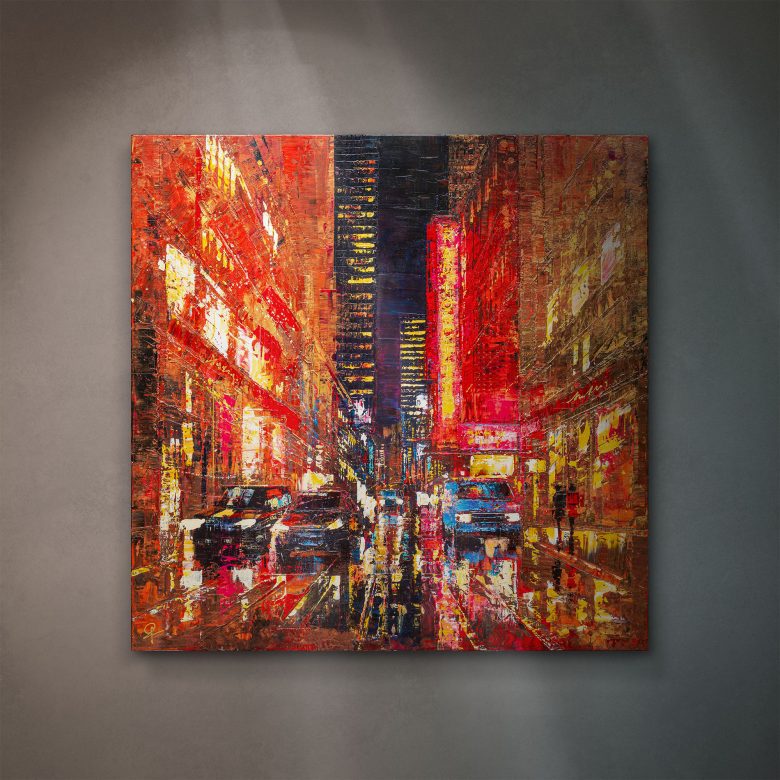 Glowing reds and molten metallics bring the streets of New York to life in this dramatic night scene. Layers of thick impasto texture and reflective colour capture the restless movement of Broadway, transforming the city’s light and rain into a symphony of motion and shine.