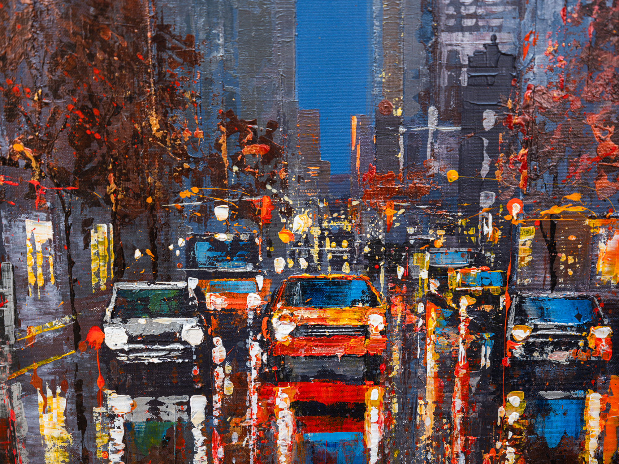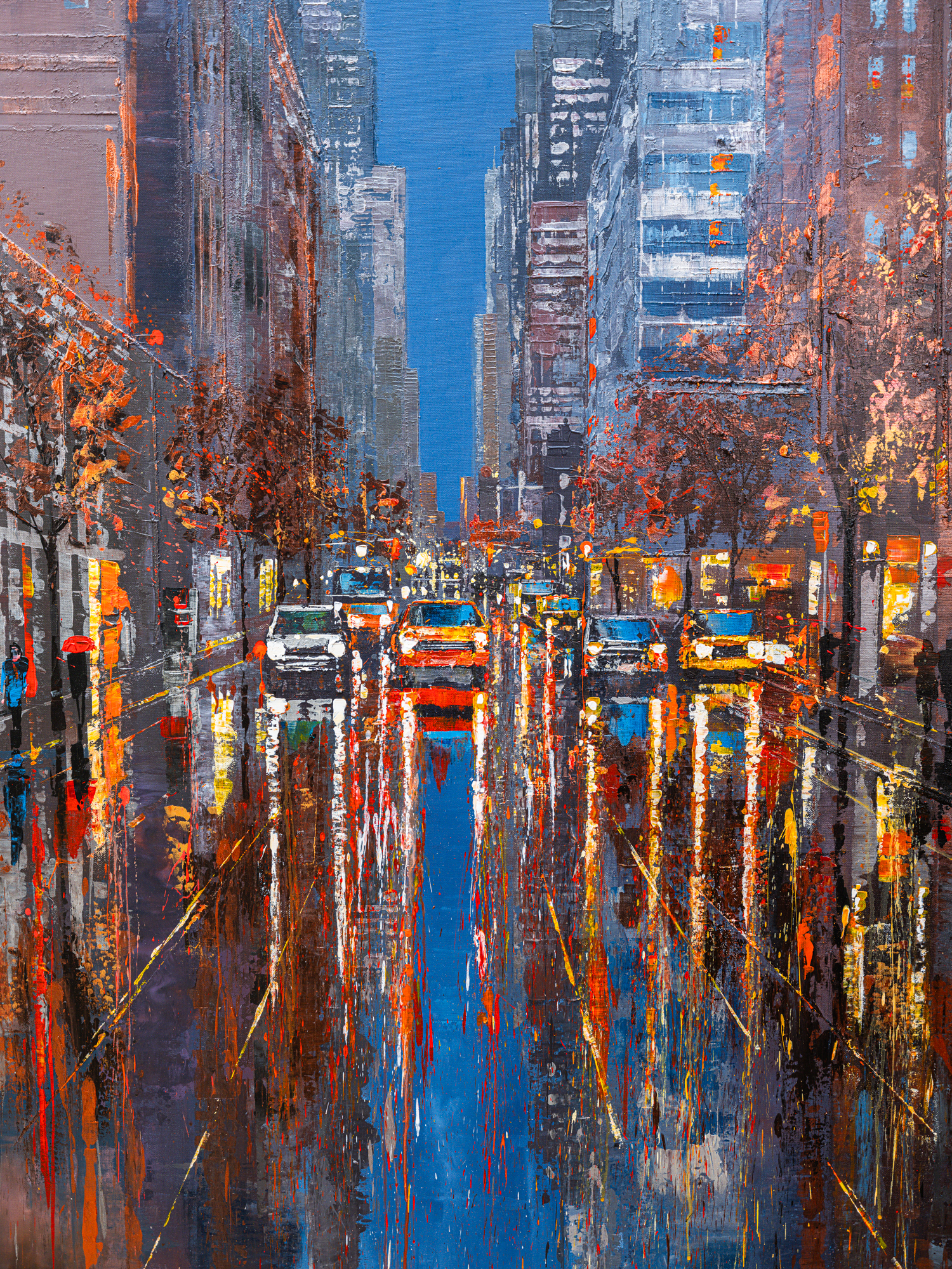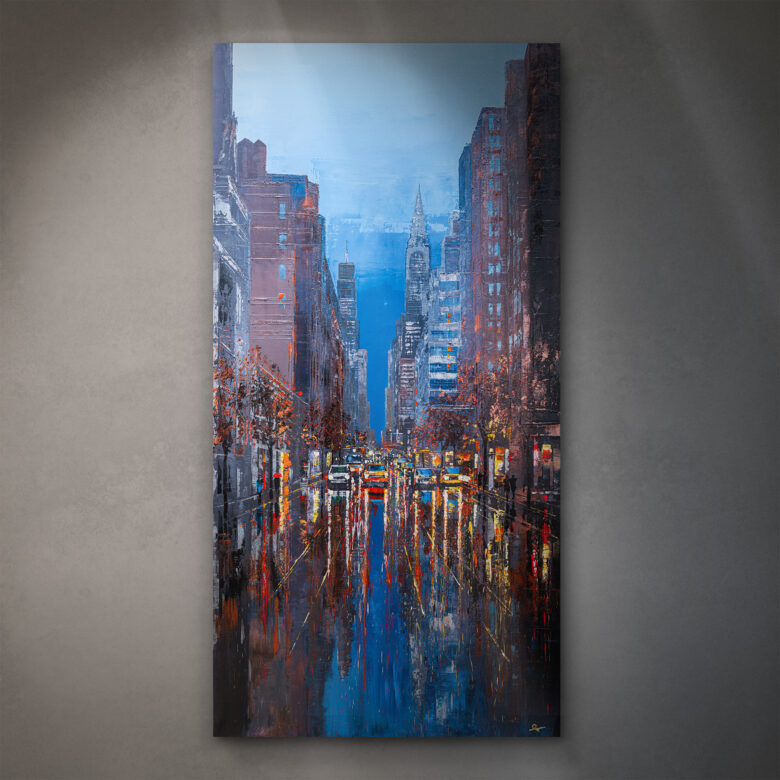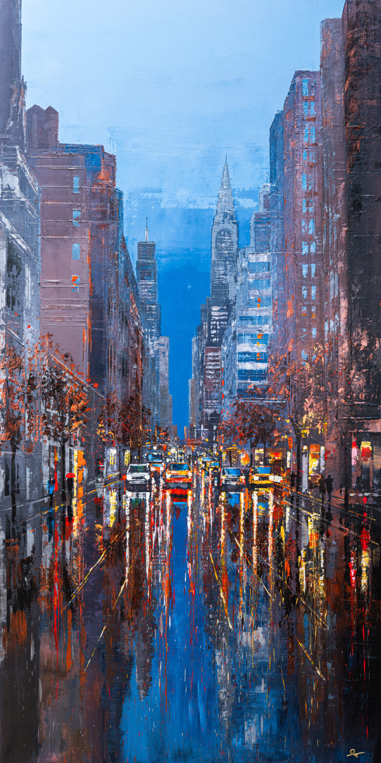 "Blue Hour, New York" looks straight down a rain-soaked New York avenue at dusk, the Chrysler Building framed at the end of the street as traffic builds in the middle distance, its lights and those of the surrounding buildings streaking across the wet road below. The palette is built around a cool, deep blue that runs through the sky and the reflective tarmac, warmed by the amber and rust tones of the autumn trees lining the pavement and the glow of headlights and shopfronts. Painted in mixed media on boxed canvas as an original work, the tall narrow format — 72 x 24 inches — suits the composition perfectly, drawing the eye down into the depth of the city.