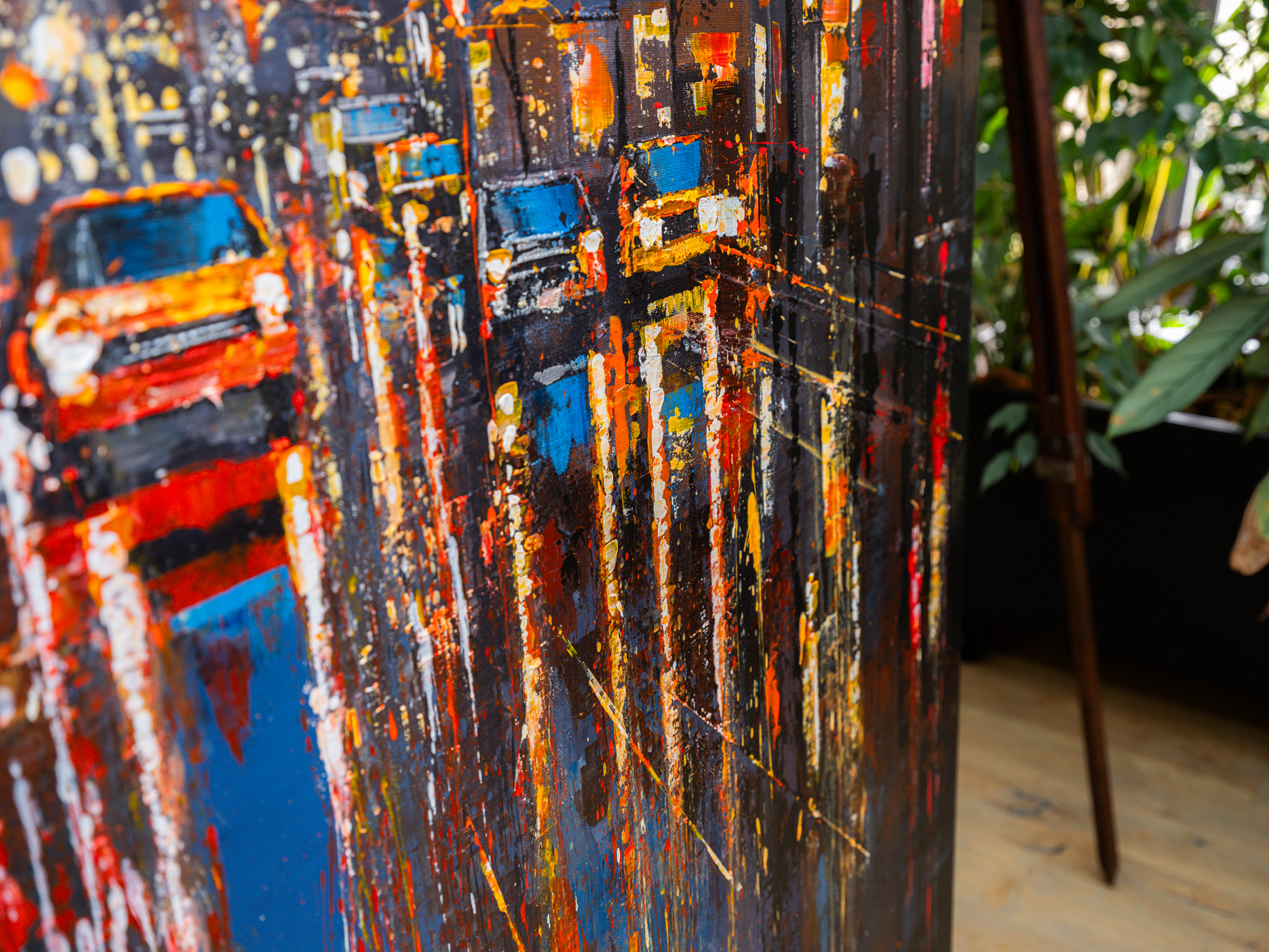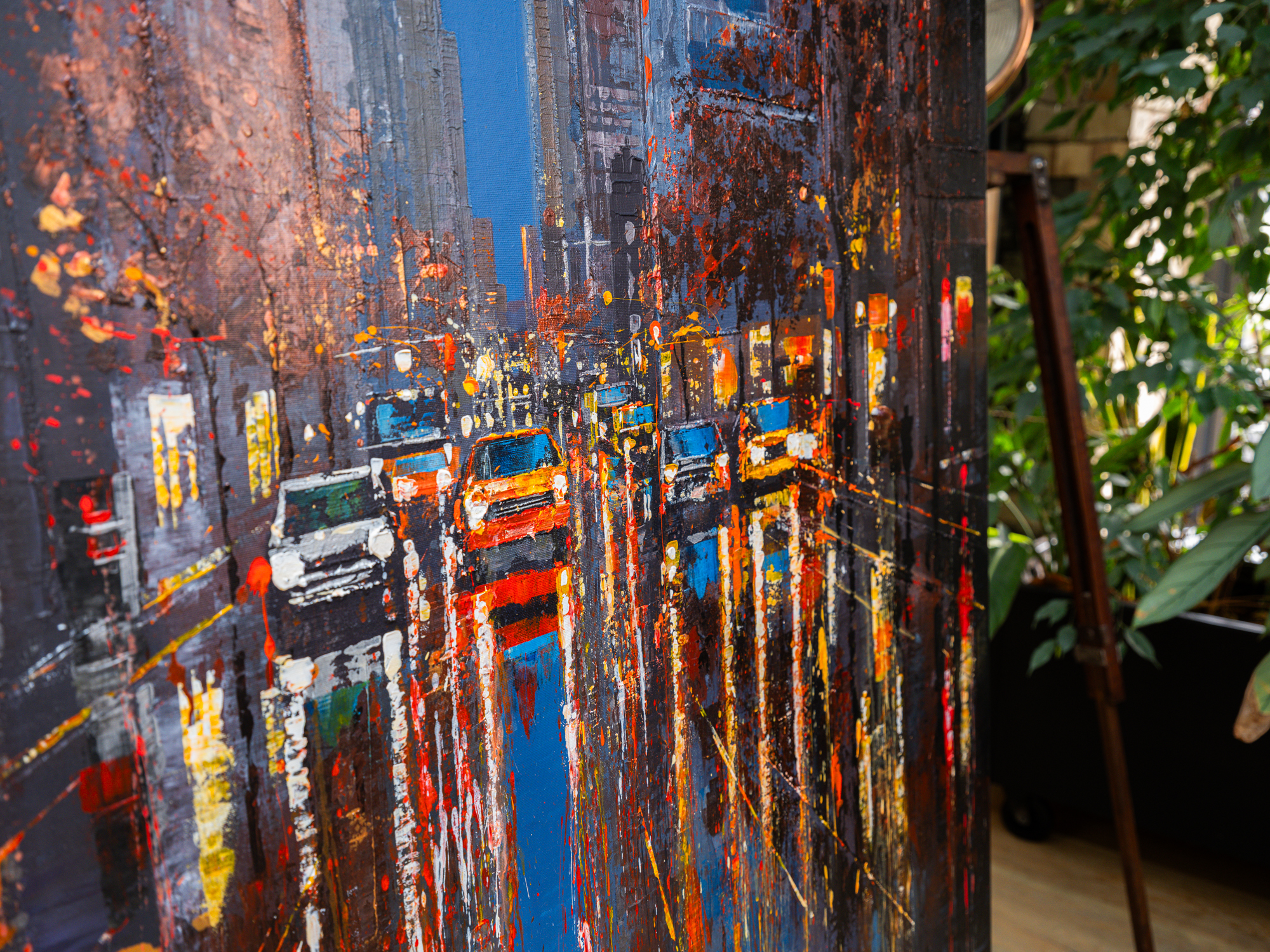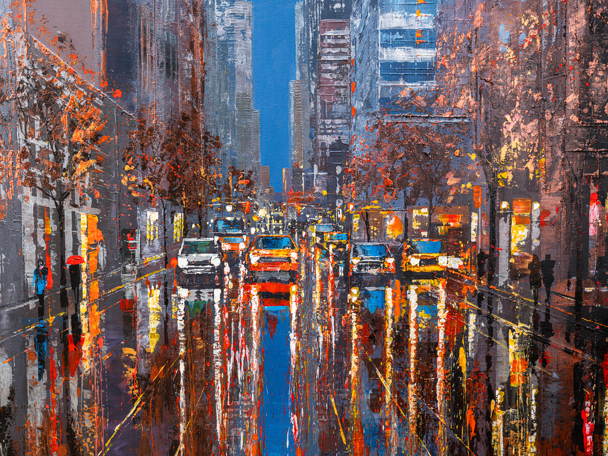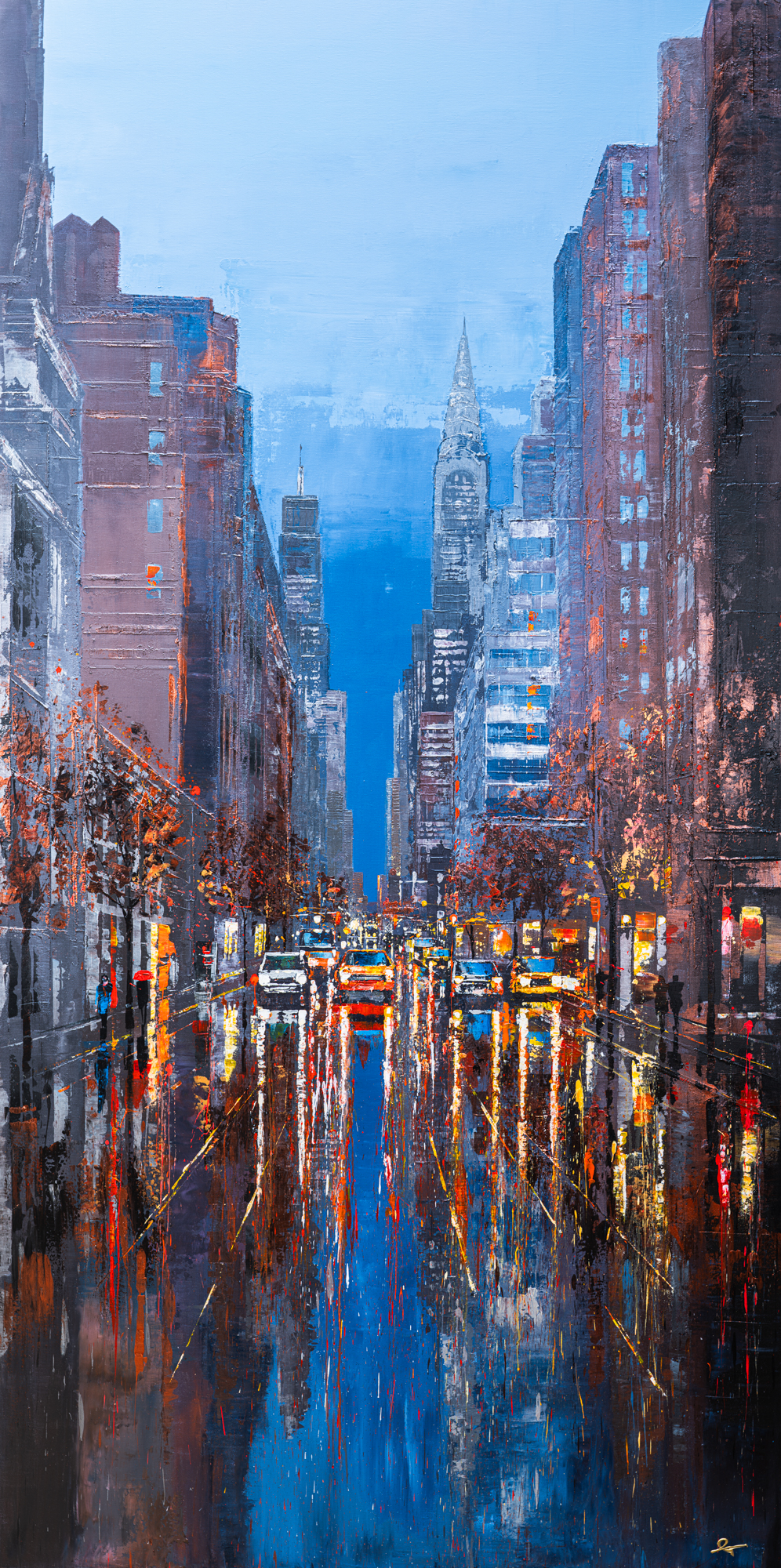 244 x 122 cm | 96 x 48 in [media]. Original mixed media on canvas, New York at dusk with the Chrysler Building and rain reflections.. New York Contemporary Art Original Painting by Contemporary Cityscape Artist Paul Kenton. Available to Purchase.