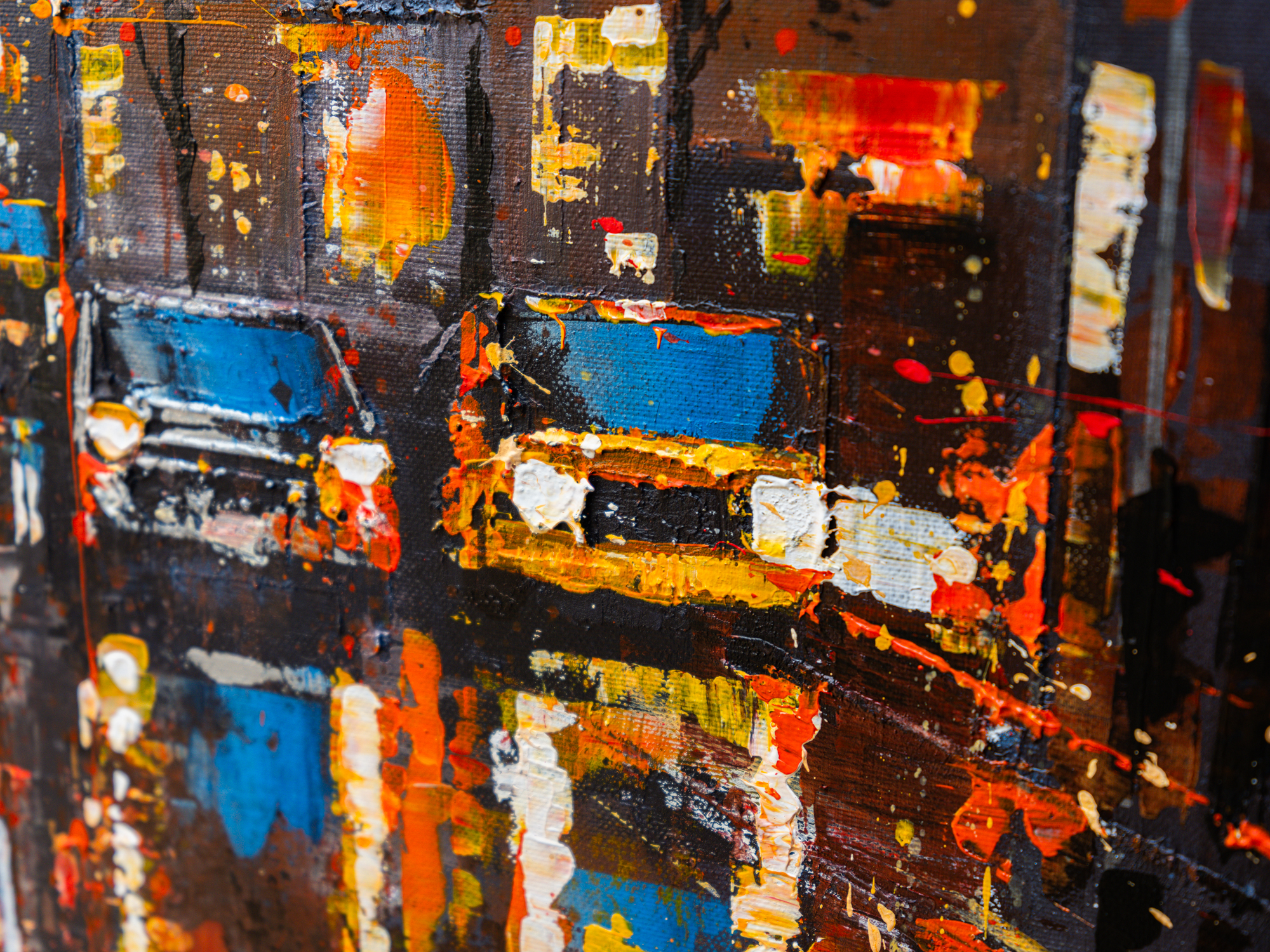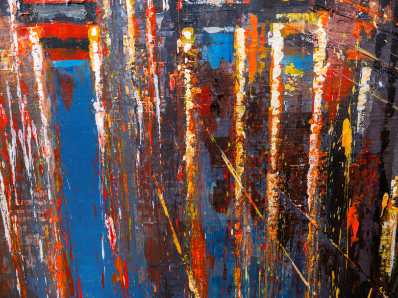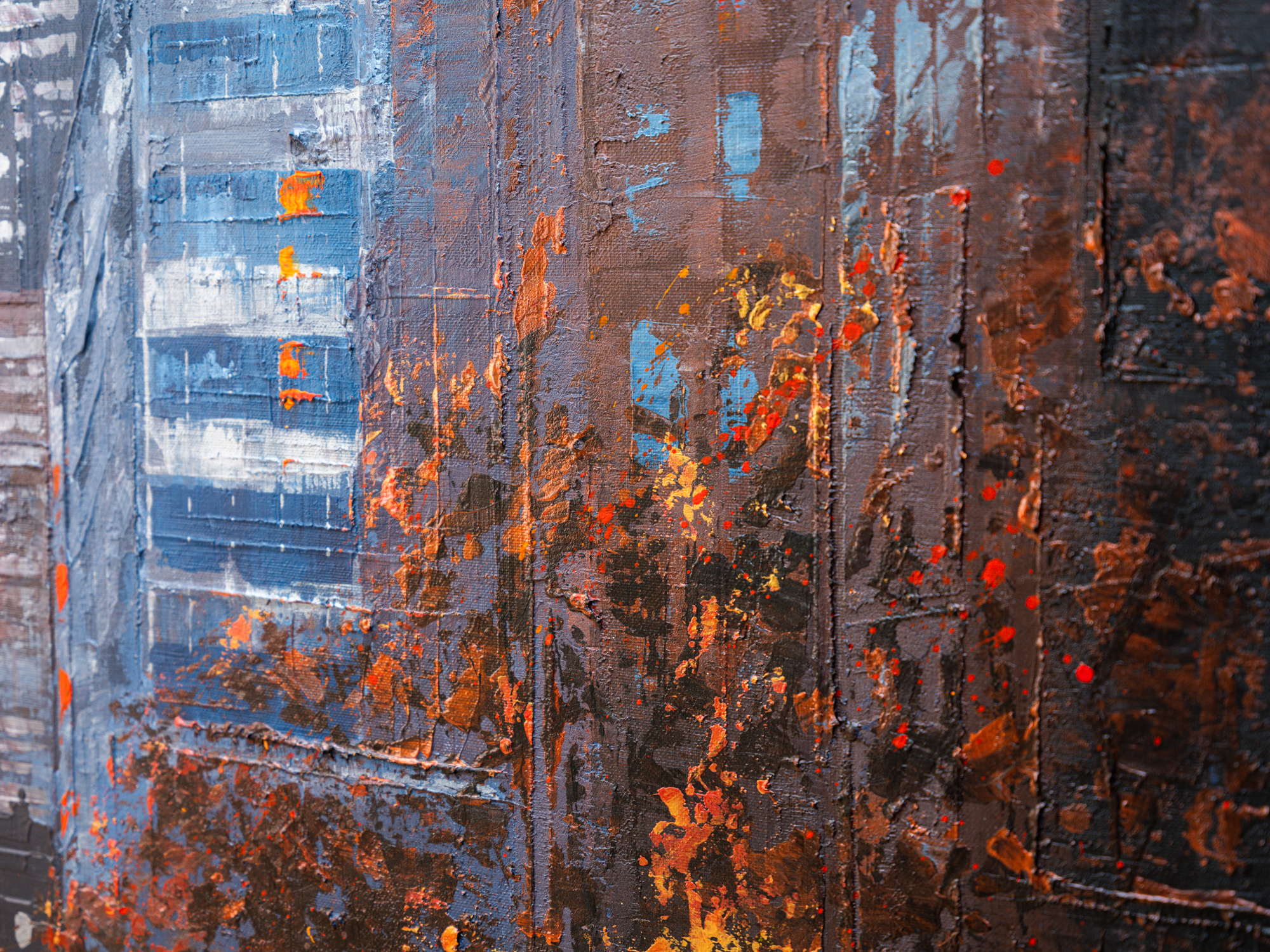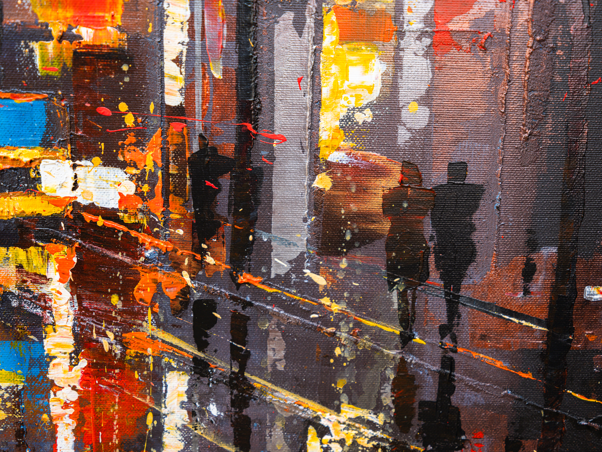 244 x 122 cm | 96 x 48 in [media]. Original mixed media on canvas, New York at dusk with the Chrysler Building and rain reflections.. New York Contemporary Art Original Painting by Contemporary Cityscape Artist Paul Kenton. Available to Purchase.