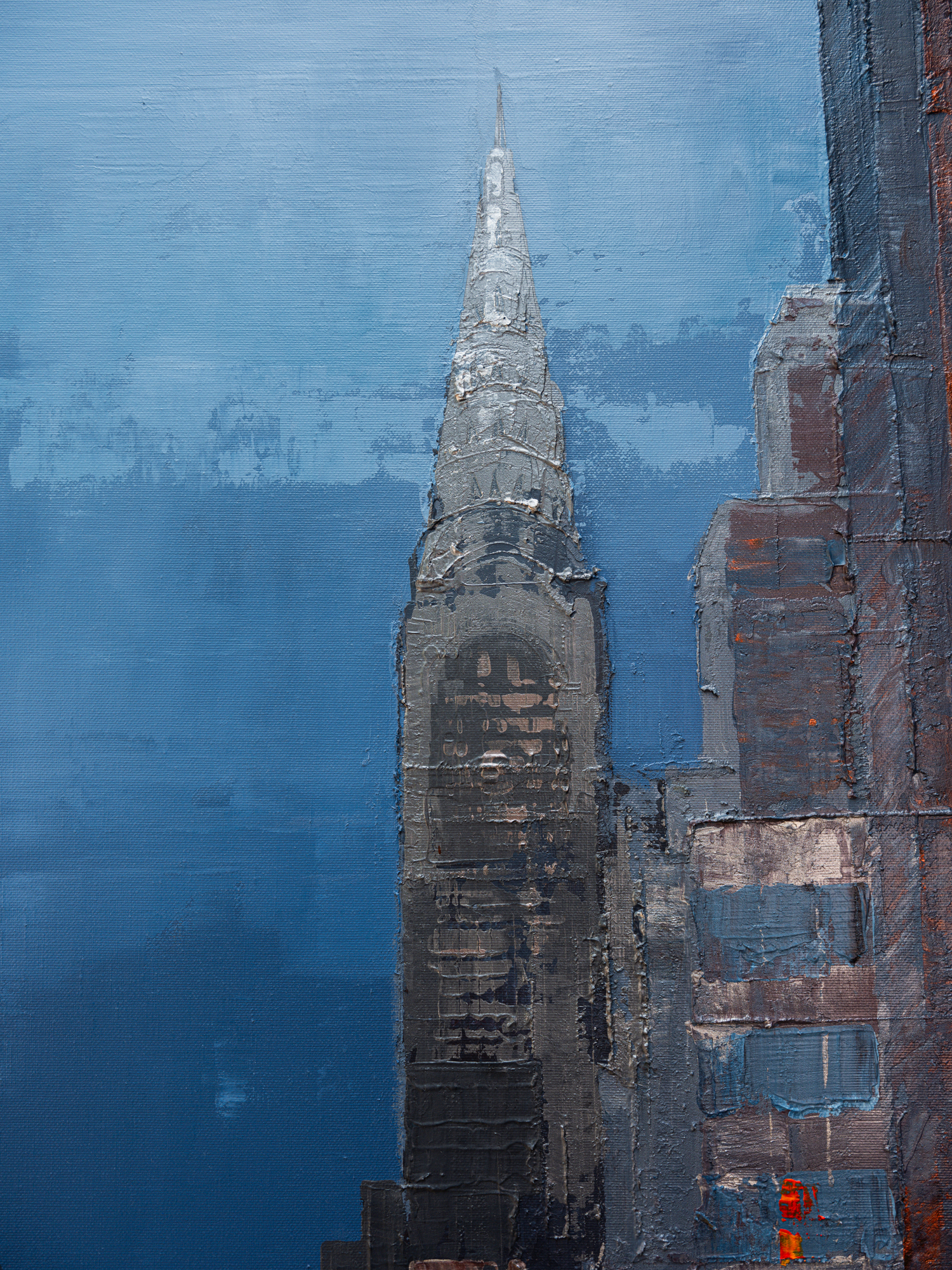 “Blue Hour, New York” is an Original New York Painting by Paul Kenton. Original mixed media on canvas, New York at dusk with the Chrysler Building and rain reflections.
