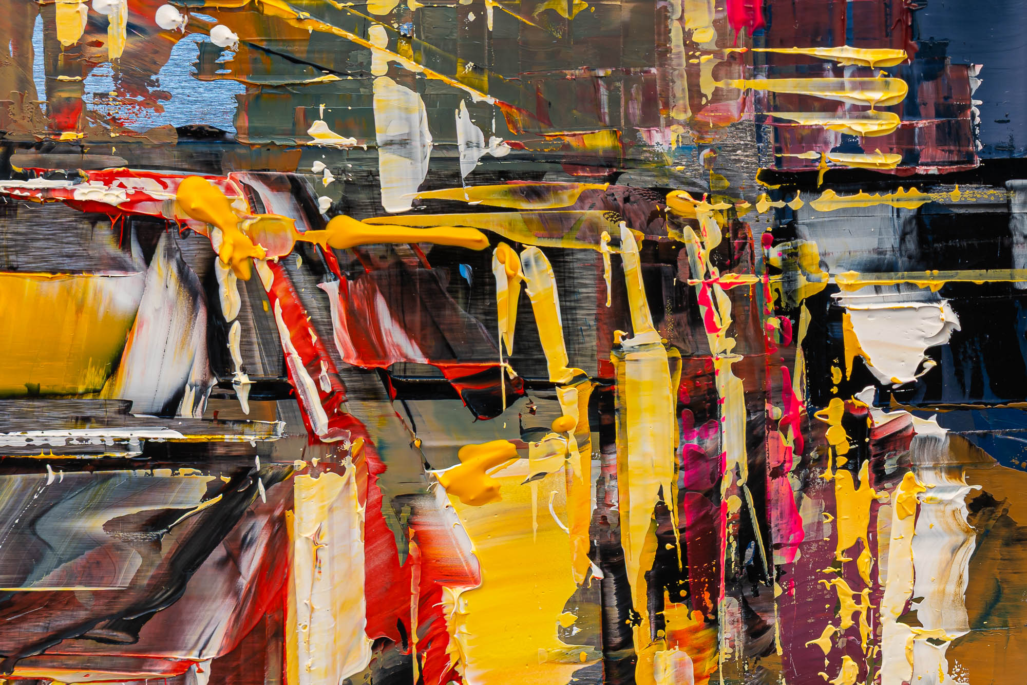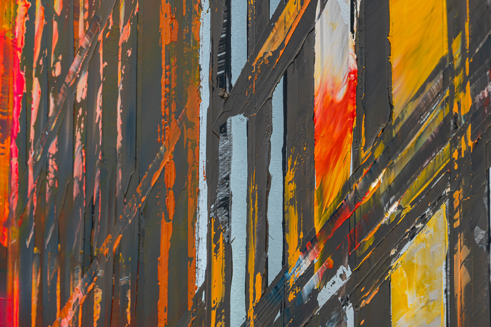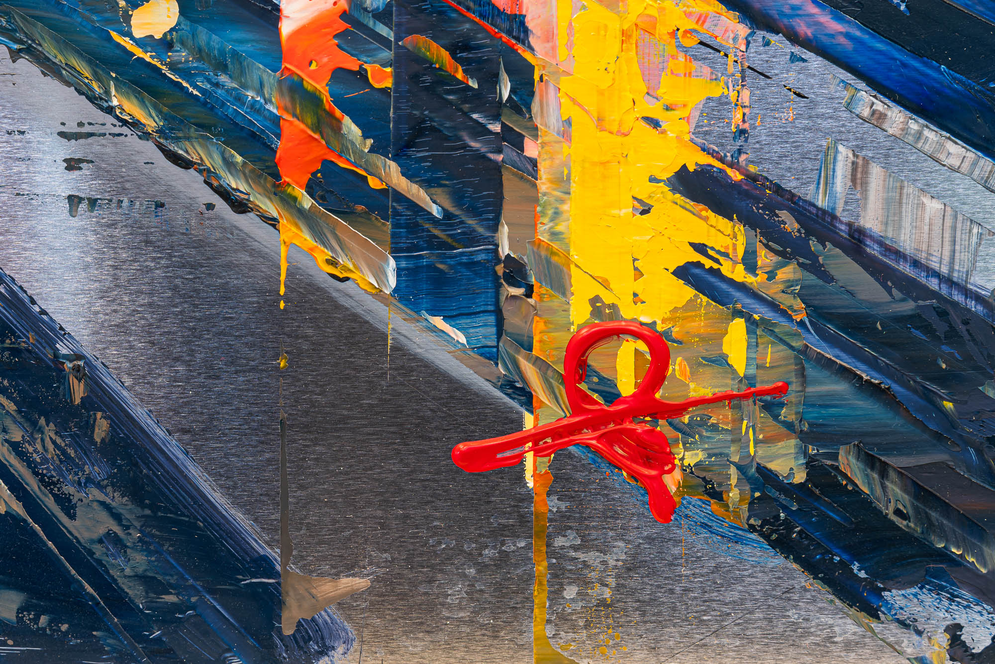 A rain-soaked Manhattan street comes alive beneath the dazzling glow of neon. The signs of Radio City blaze down the avenue, casting reflections that shimmer and stretch across the wet road surface. Each stroke of paint vibrates with movement, bringing a luminous quality to the scene, as exposed aluminium catches the light and ripples with shifting reflections as the viewer adjusts their perspective. “Broadway Lights” is both a celebration of Broadway’s vibrancy and a portrait of New York’s restless rhythm.