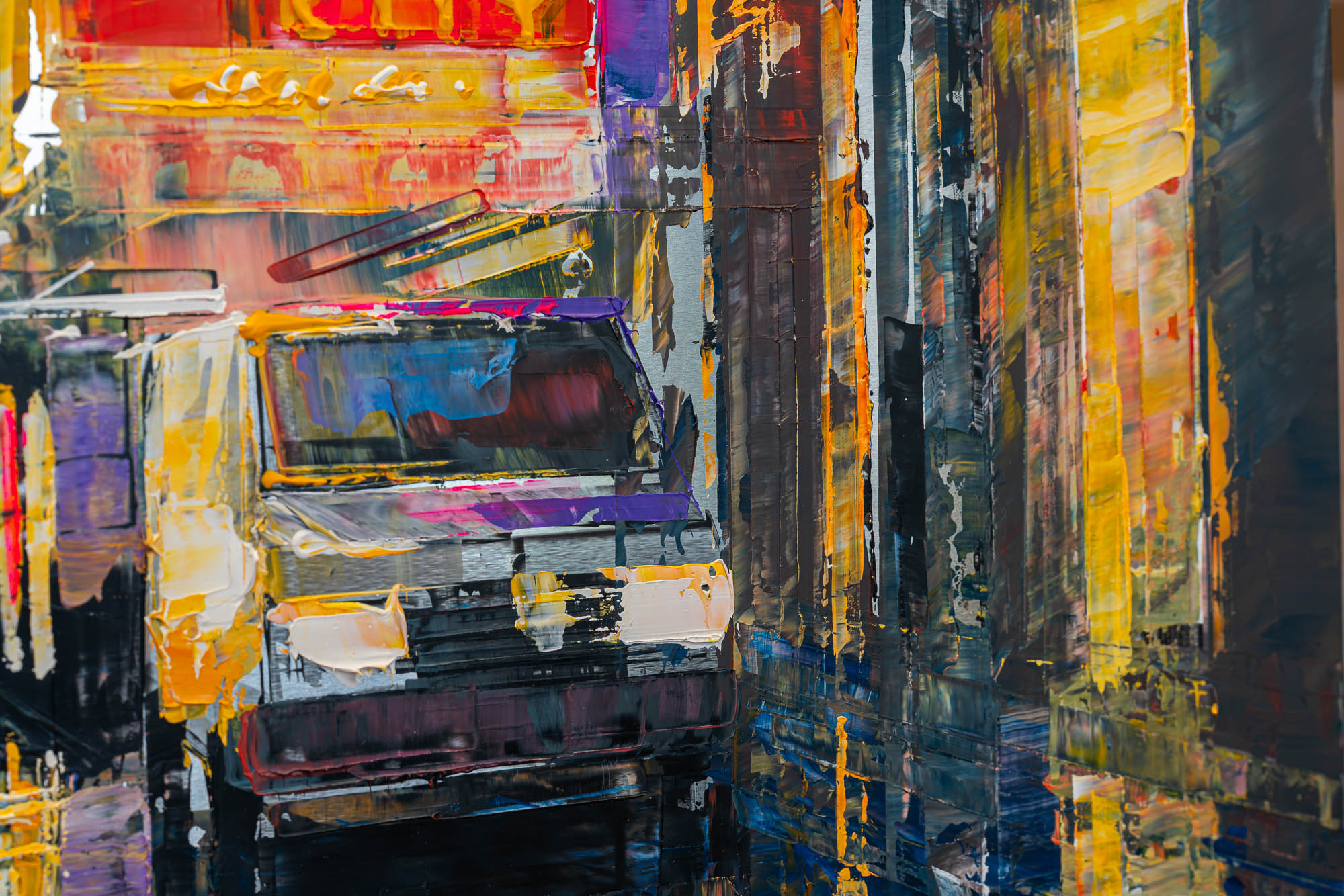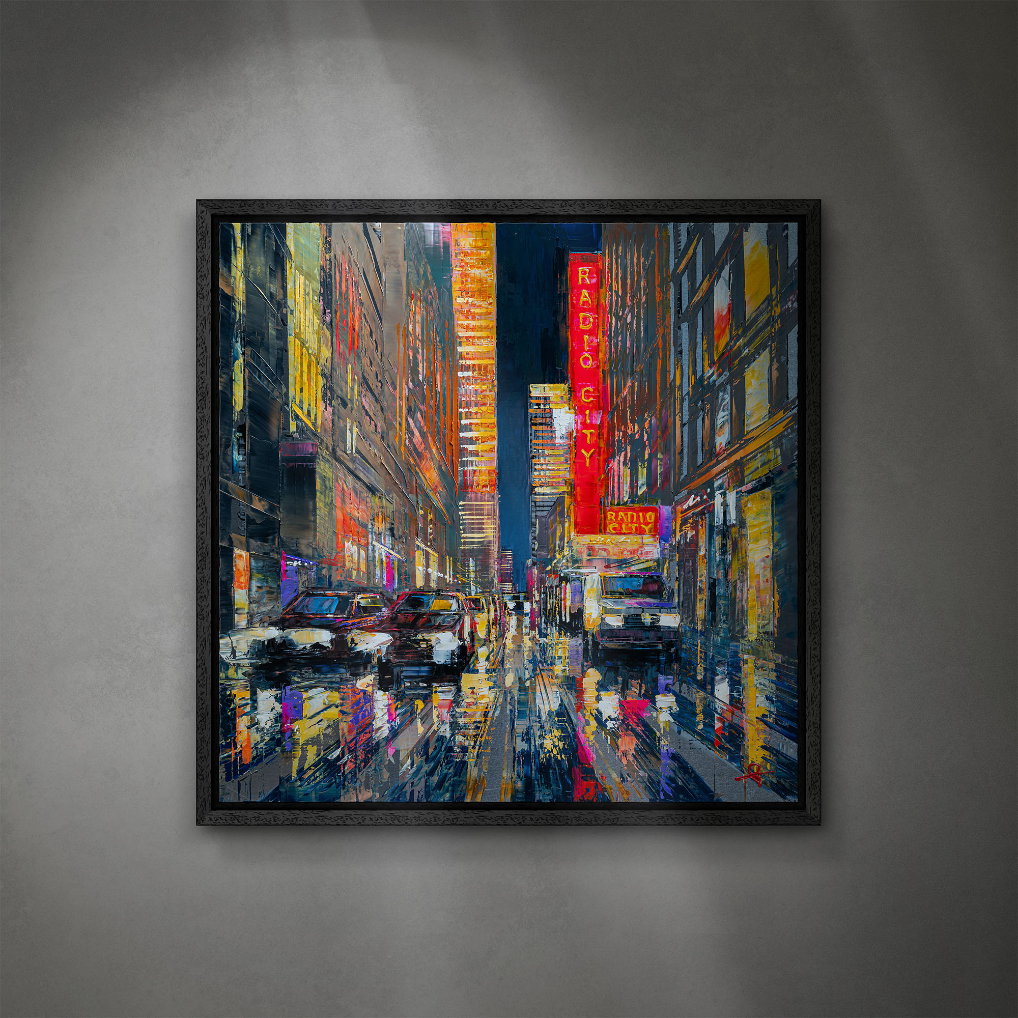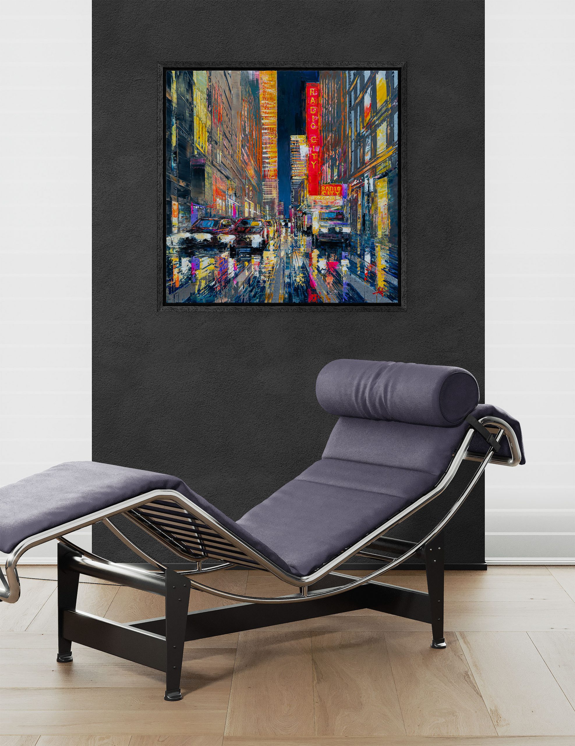 76 x 76 cm | 30 x 30 in [media]. A neon-soaked vision of Broadway at night, with shimmering reflections and glowing colour.. New York Contemporary Art Original Painting by Contemporary Cityscape Artist Paul Kenton. Available to Purchase.