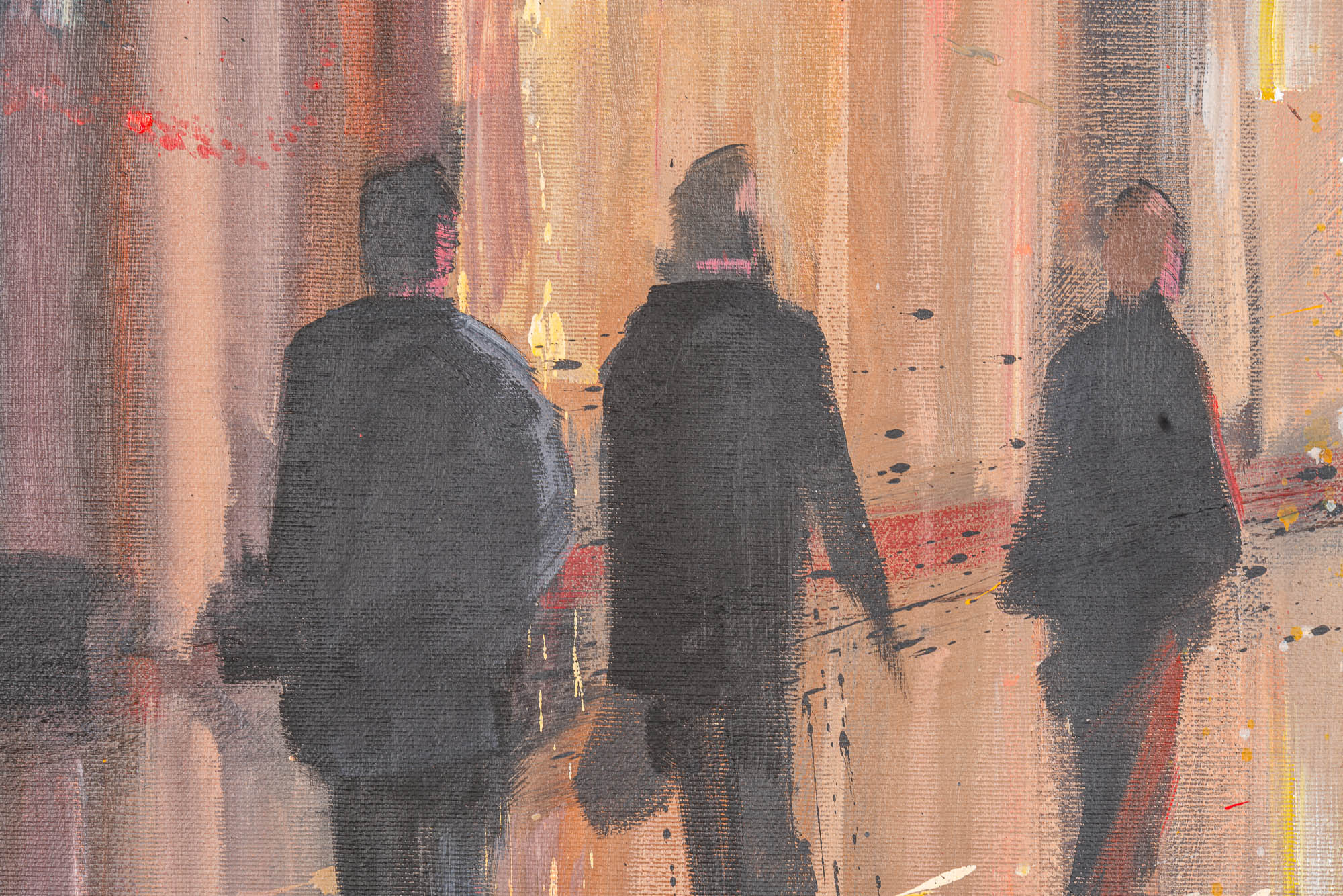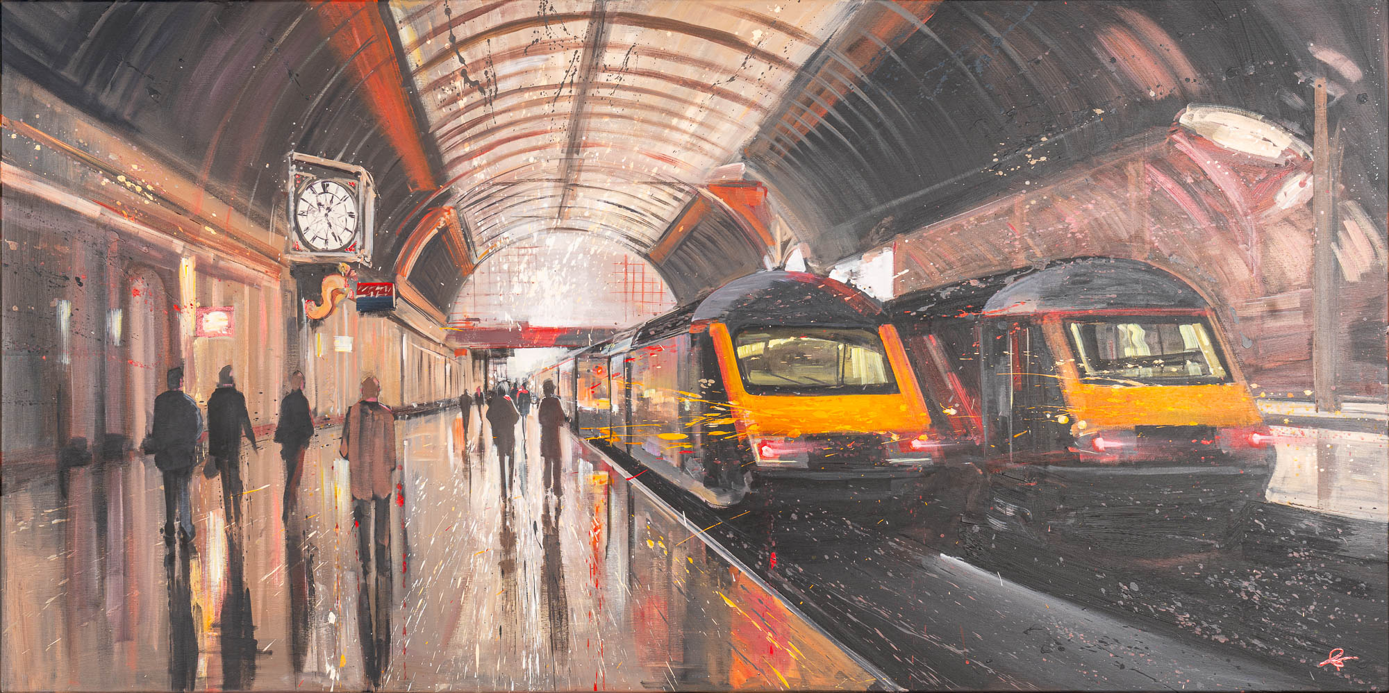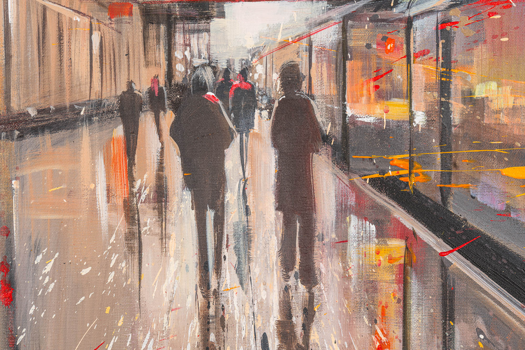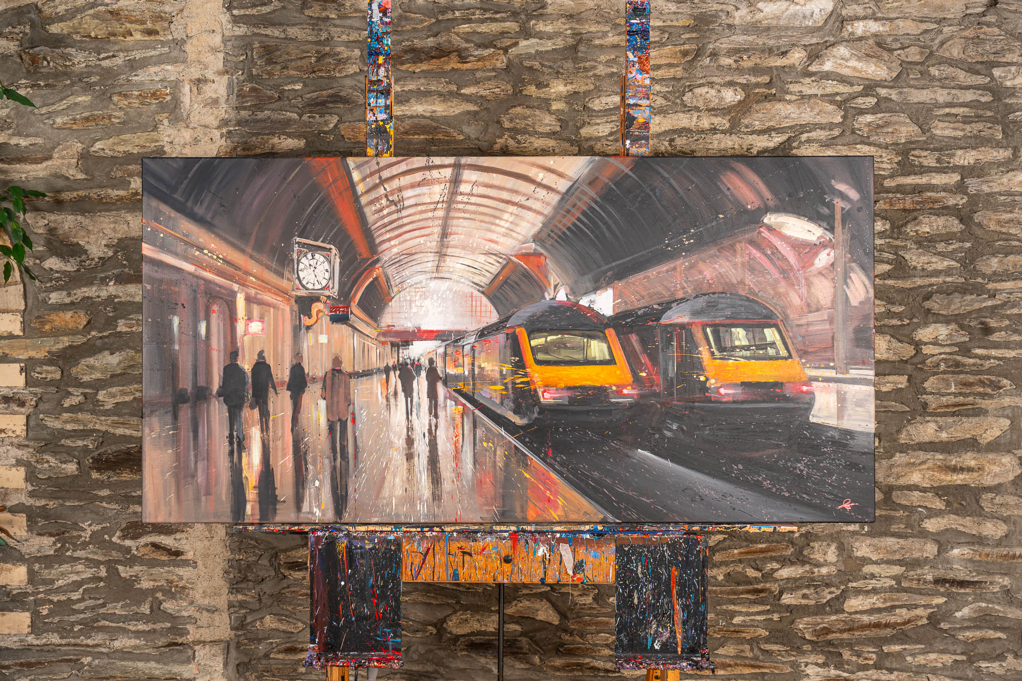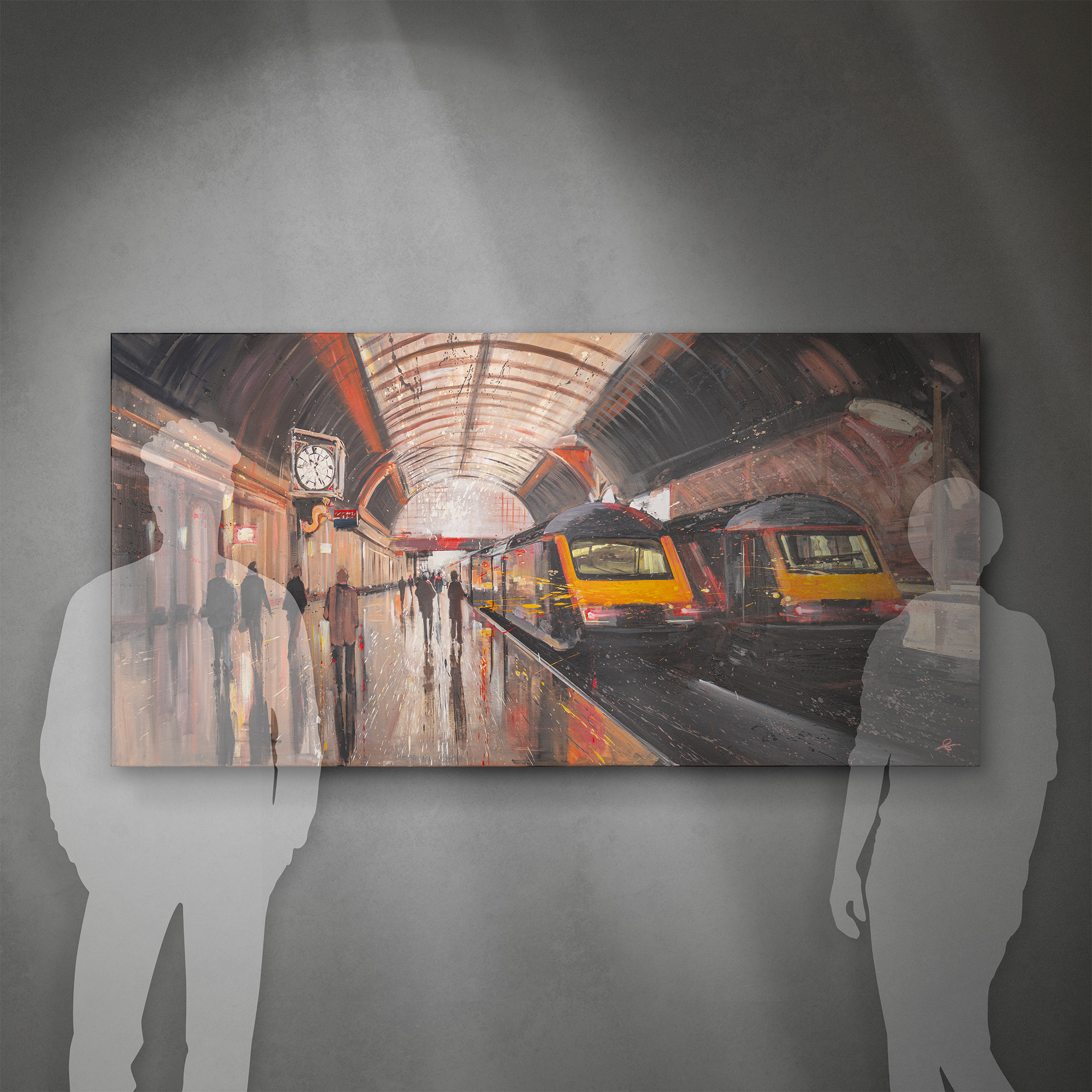 91.5 x 183 cm | 36 x 72 in [media]. A poised London station scene capturing the rhythm and restraint of the daily commute.. London Contemporary Art Original Painting by Contemporary Cityscape Artist Paul Kenton. Available to Purchase.