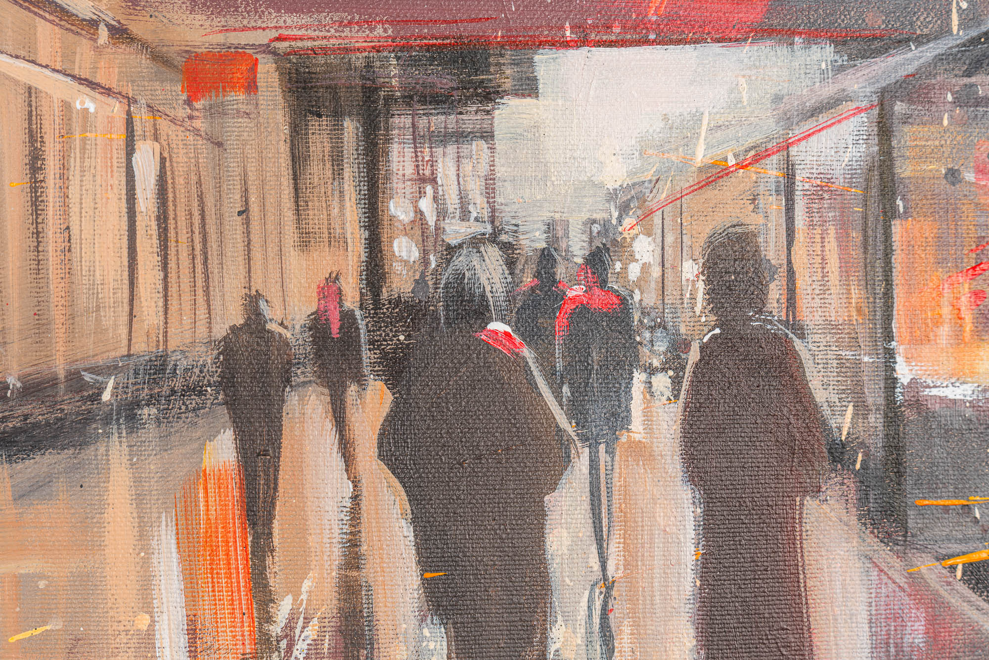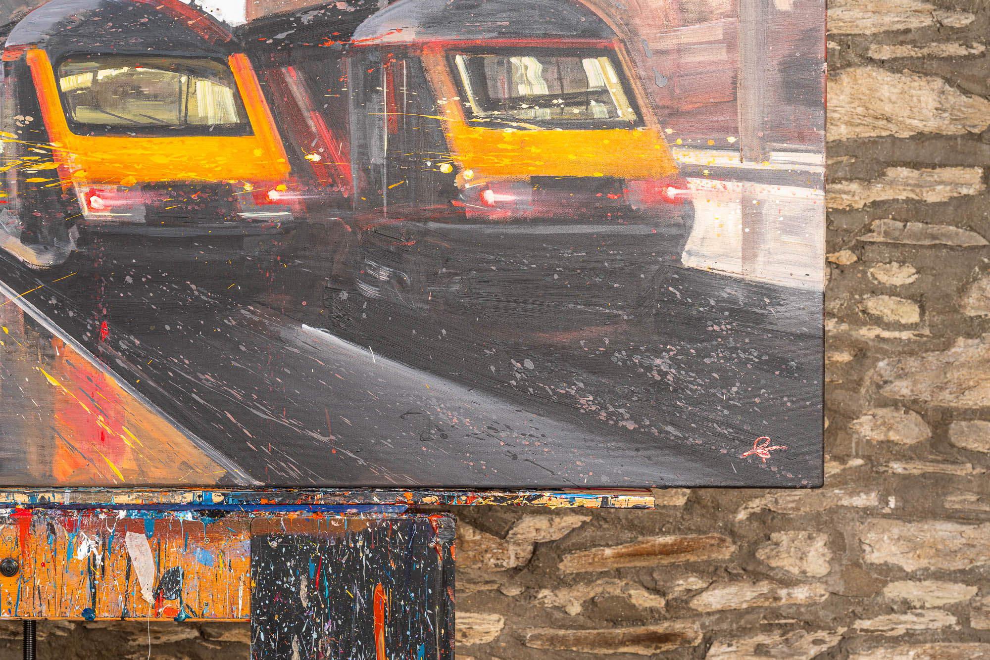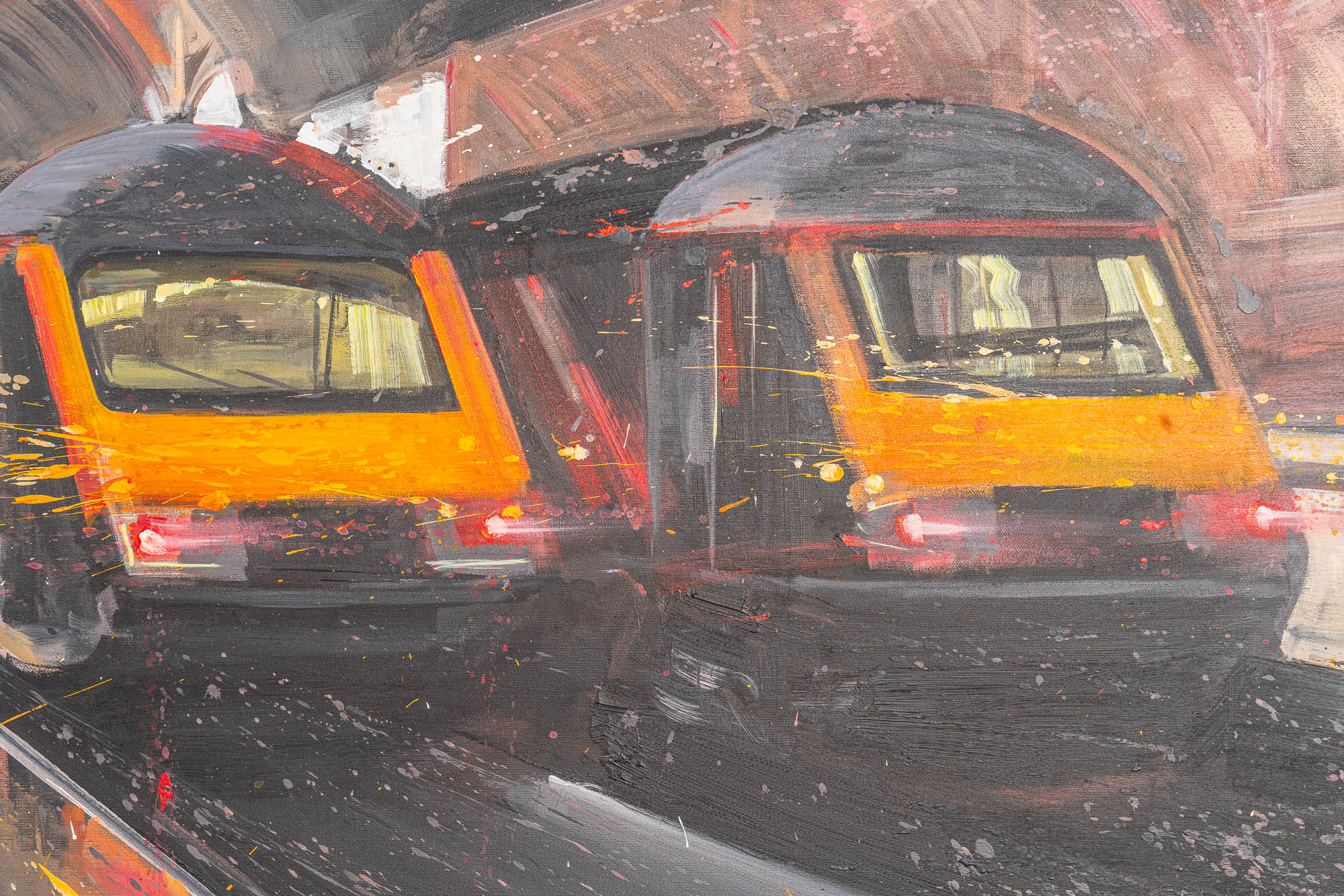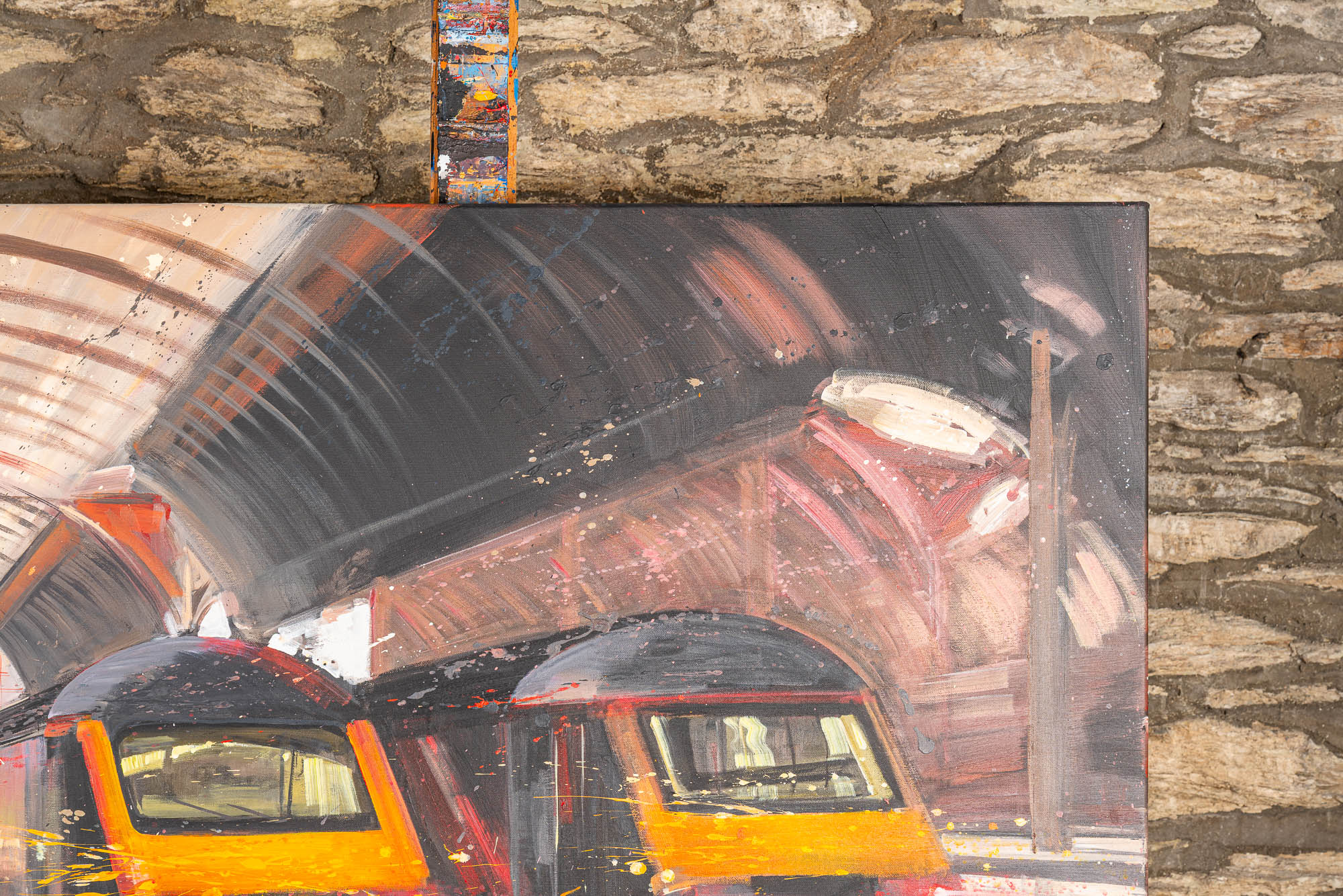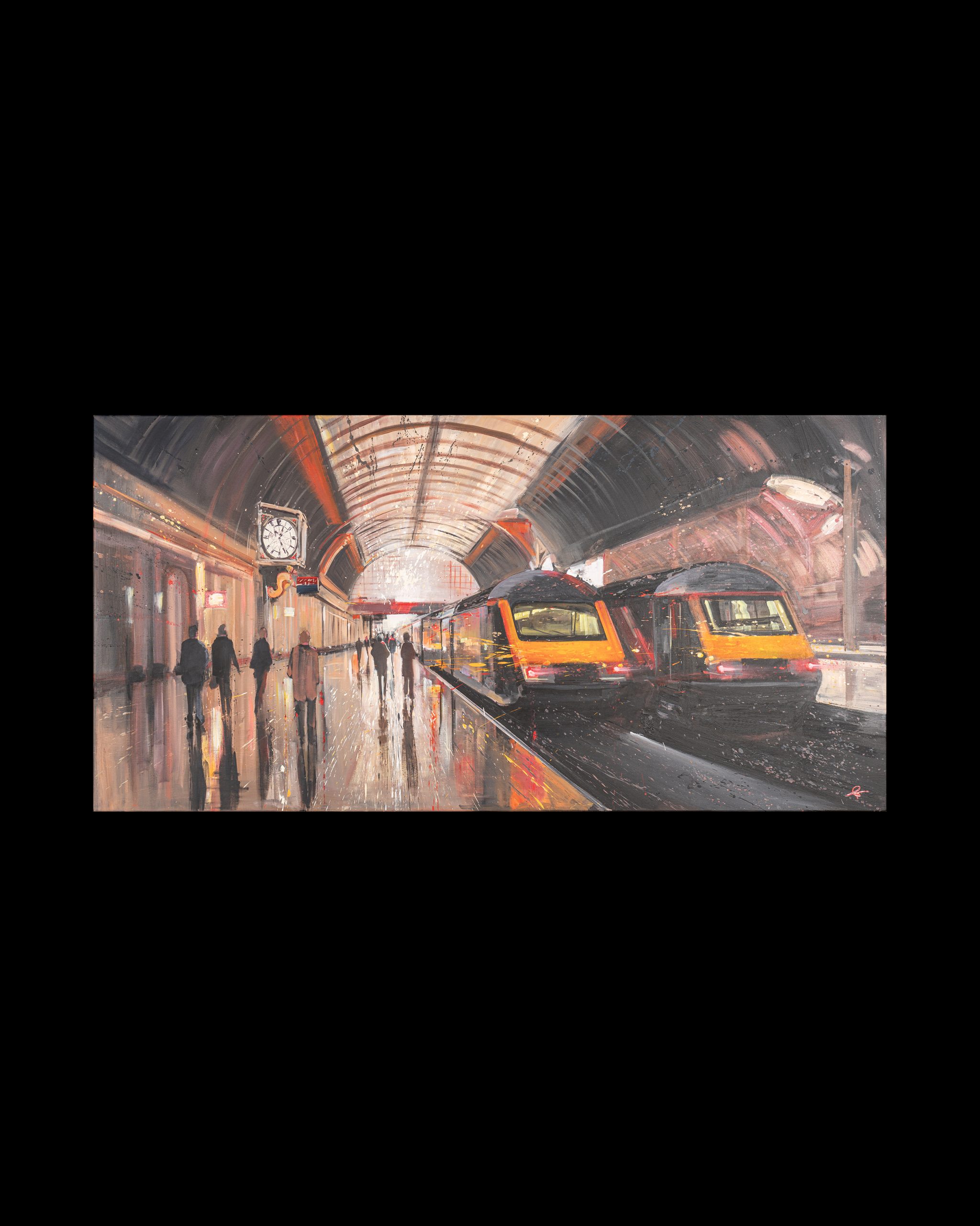91.5 x 183 cm | 36 x 72 in [media]. A poised London station scene capturing the rhythm and restraint of the daily commute.. London Contemporary Art Original Painting by Contemporary Cityscape Artist Paul Kenton. Available to Purchase.