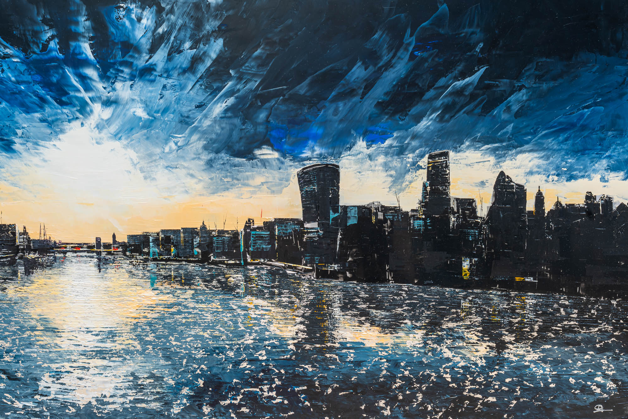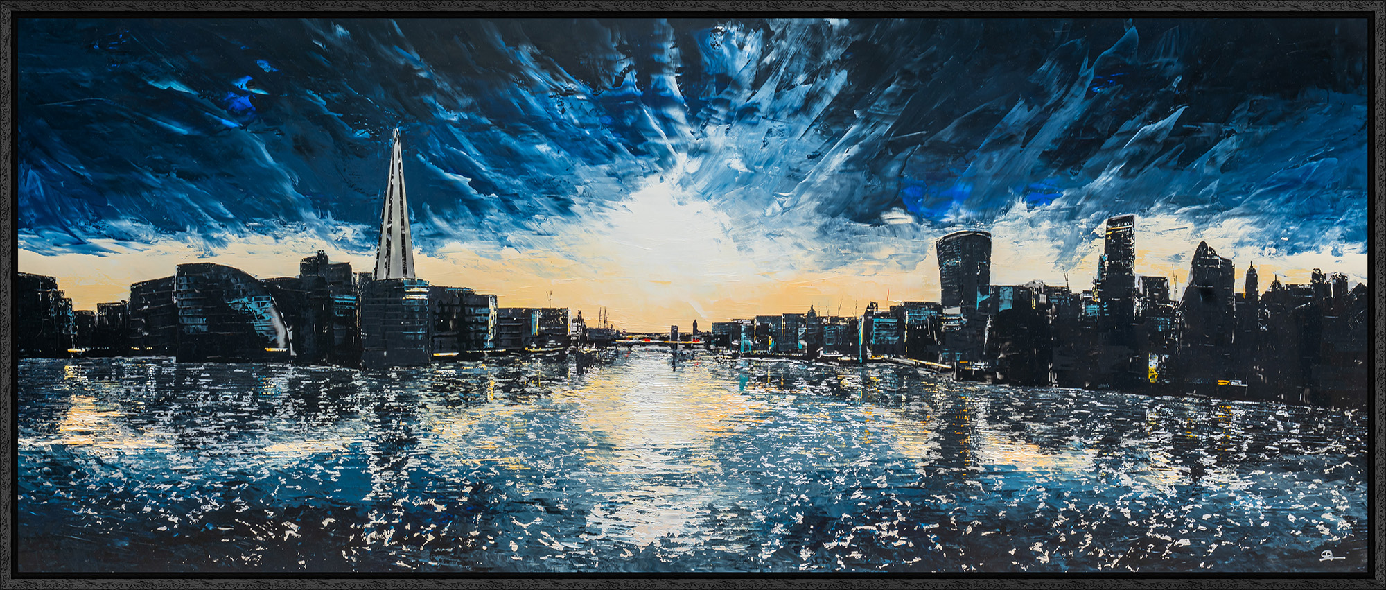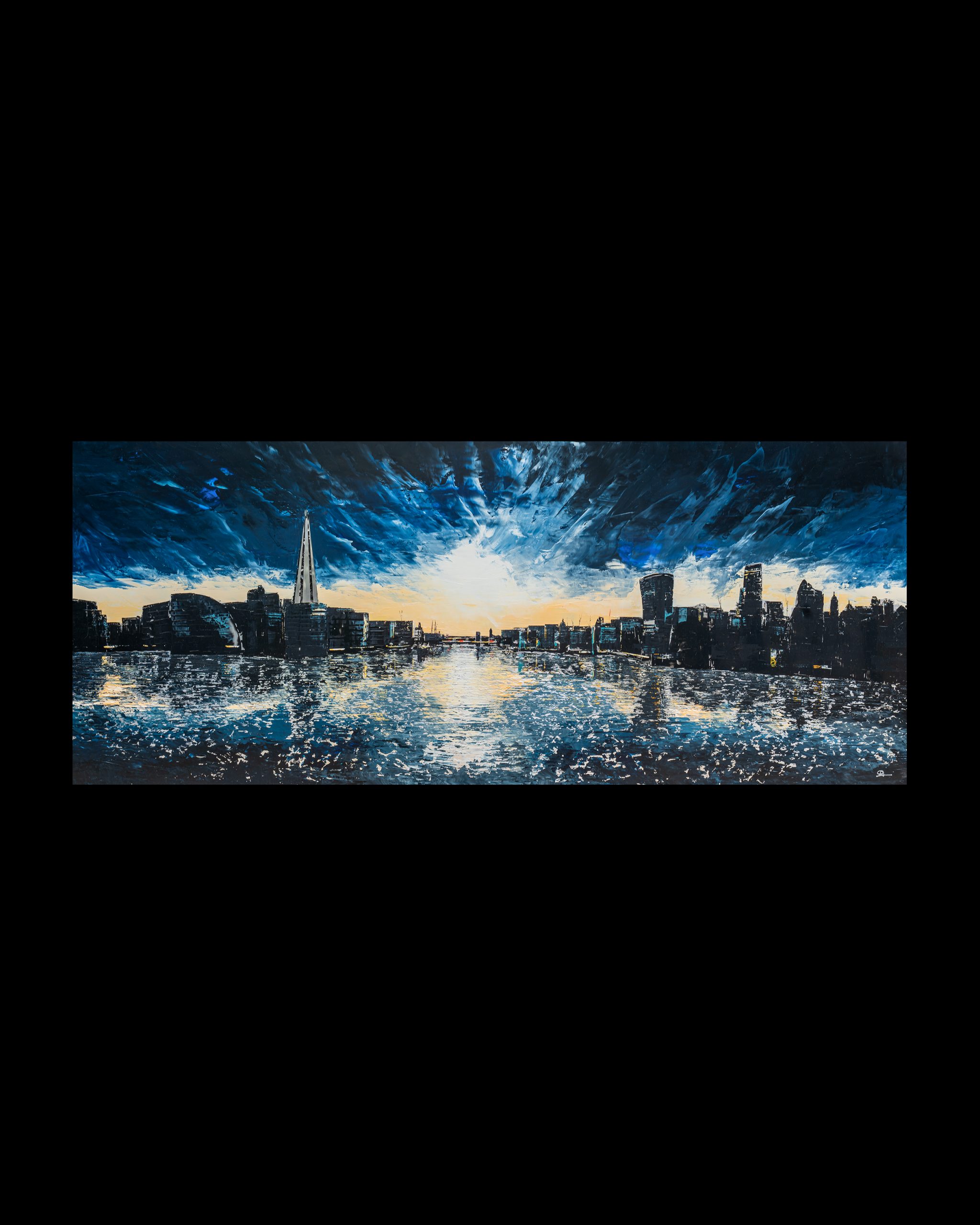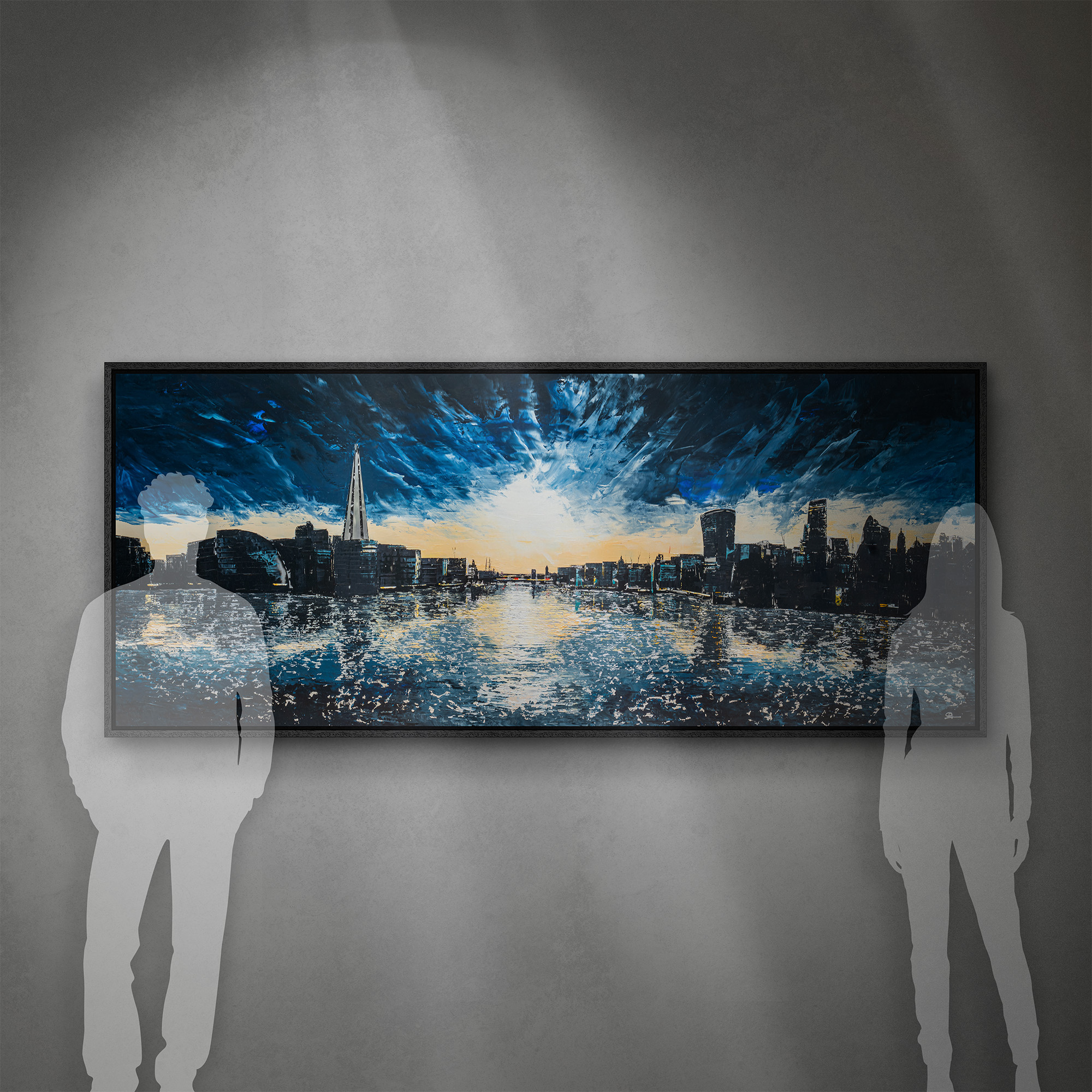 101.5 x 244 cm | 40 x 96 in [media]. A dramatic London cityscape where shadow, reflection and light define the capital at dusk.. London Contemporary Art Original Painting by Contemporary Cityscape Artist Paul Kenton. Available to Purchase.