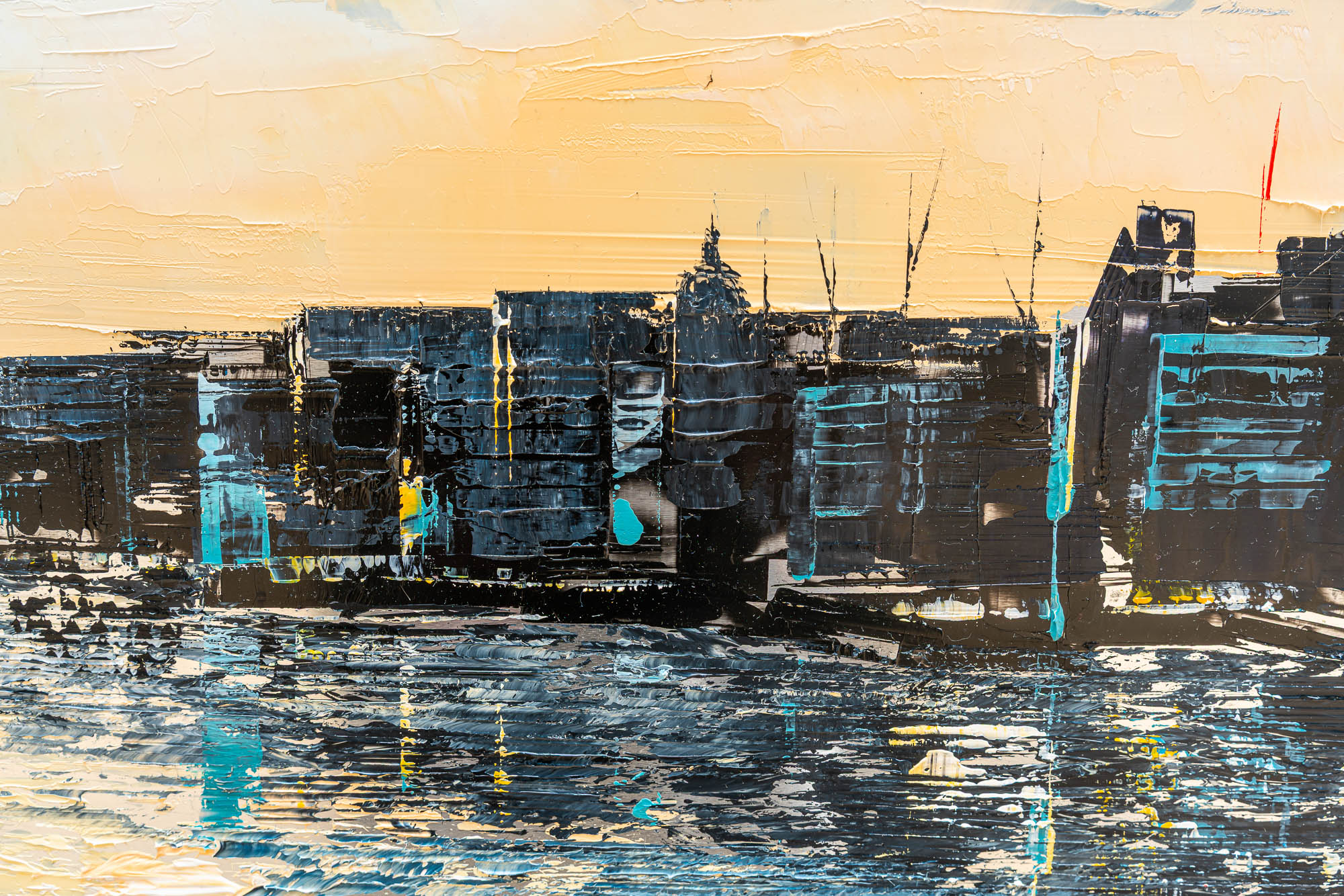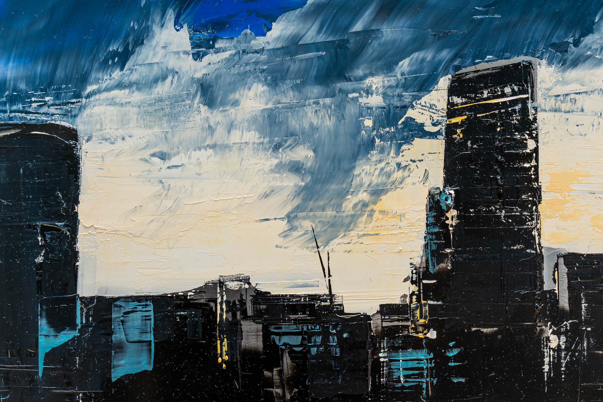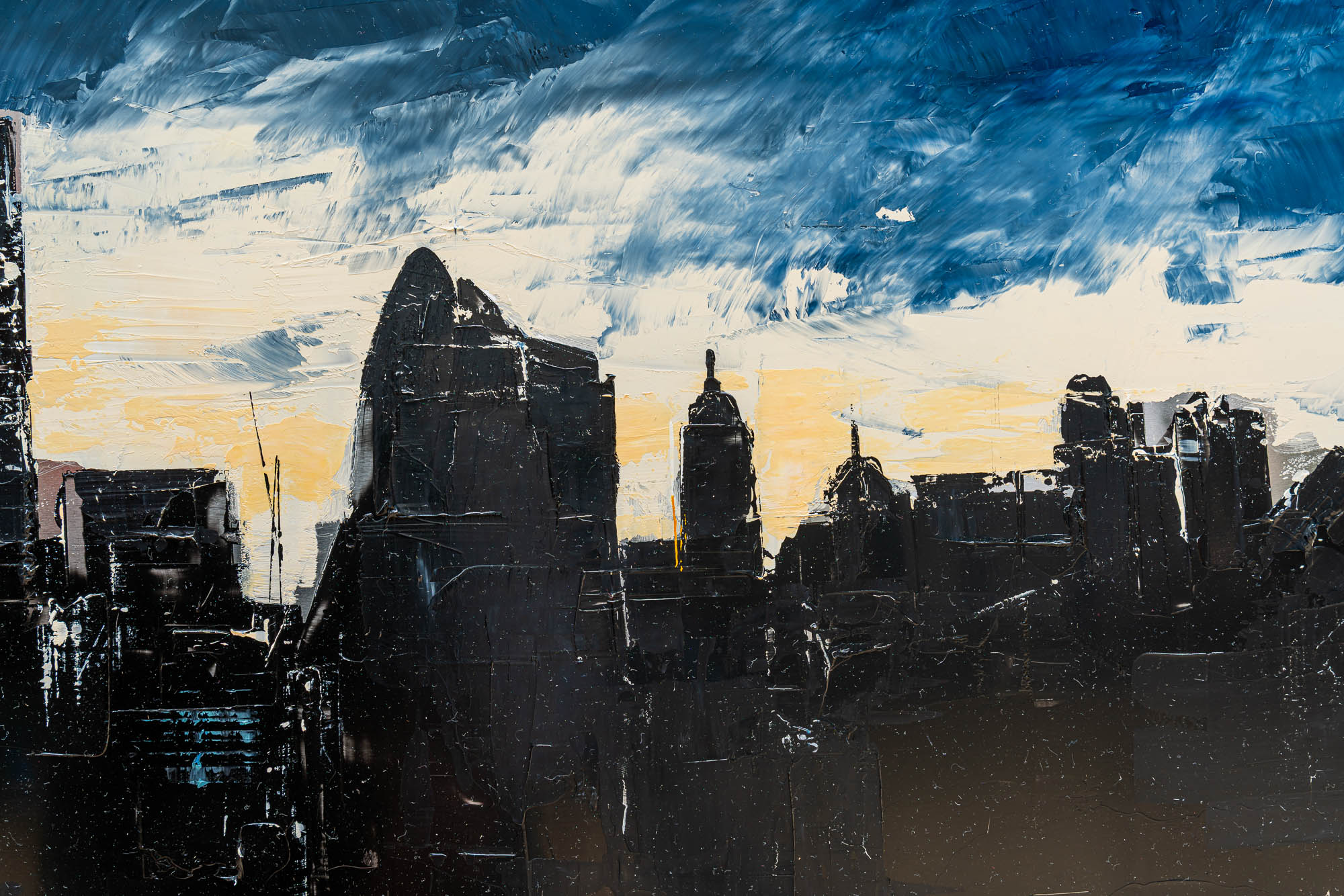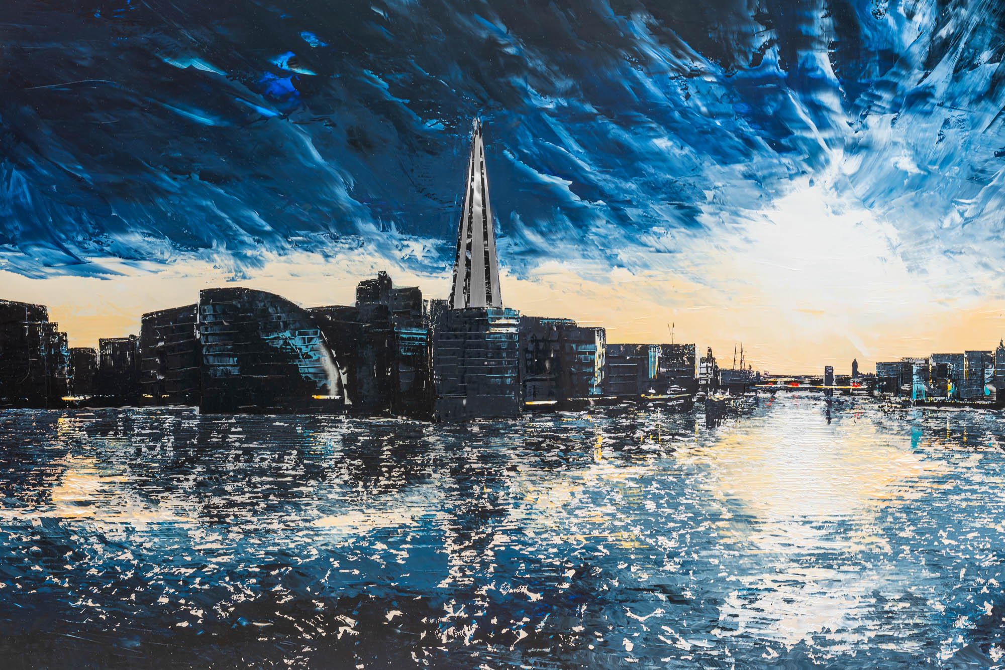 101.5 x 244 cm | 40 x 96 in [media]. A dramatic London cityscape where shadow, reflection and light define the capital at dusk.. London Contemporary Art Original Painting by Contemporary Cityscape Artist Paul Kenton. Available to Purchase.