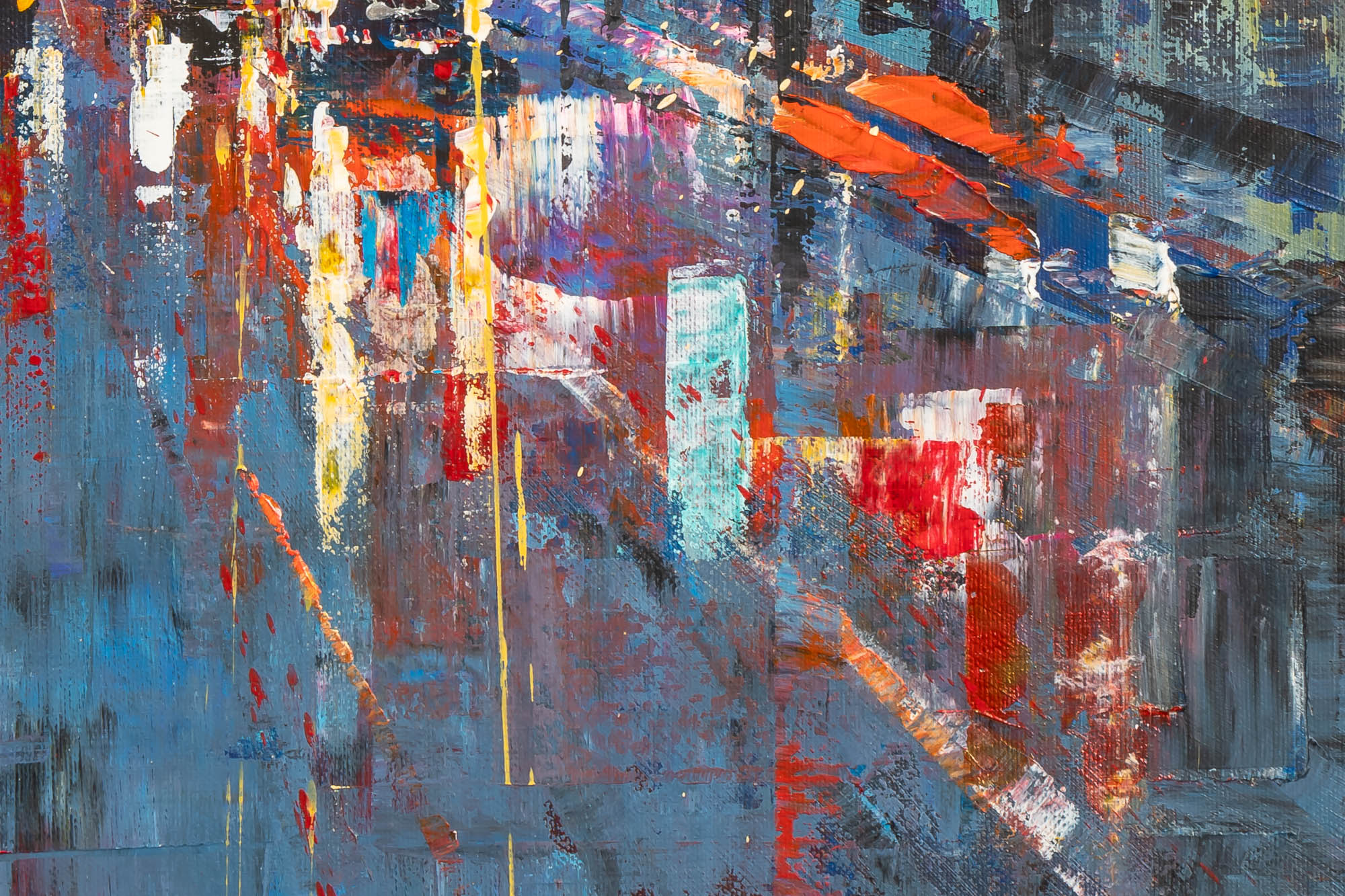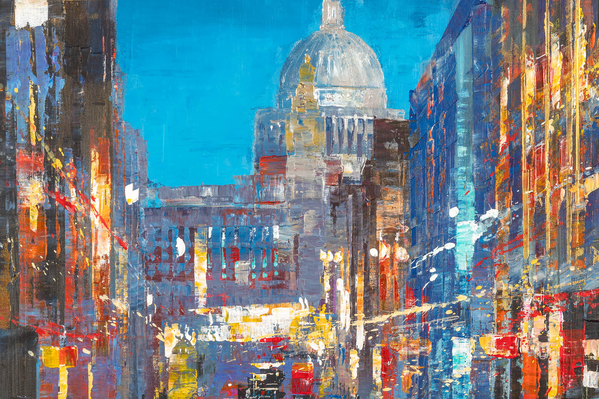 81 x 55 cm | 32 x 21.75 in [media]. A glowing London scene centred on St Paul’s Cathedral, illuminated in deep blues and golds that celebrate the city’s energy and architectural beauty.. London Contemporary Art Original Painting by Contemporary Cityscape Artist Paul Kenton. Available to Purchase.