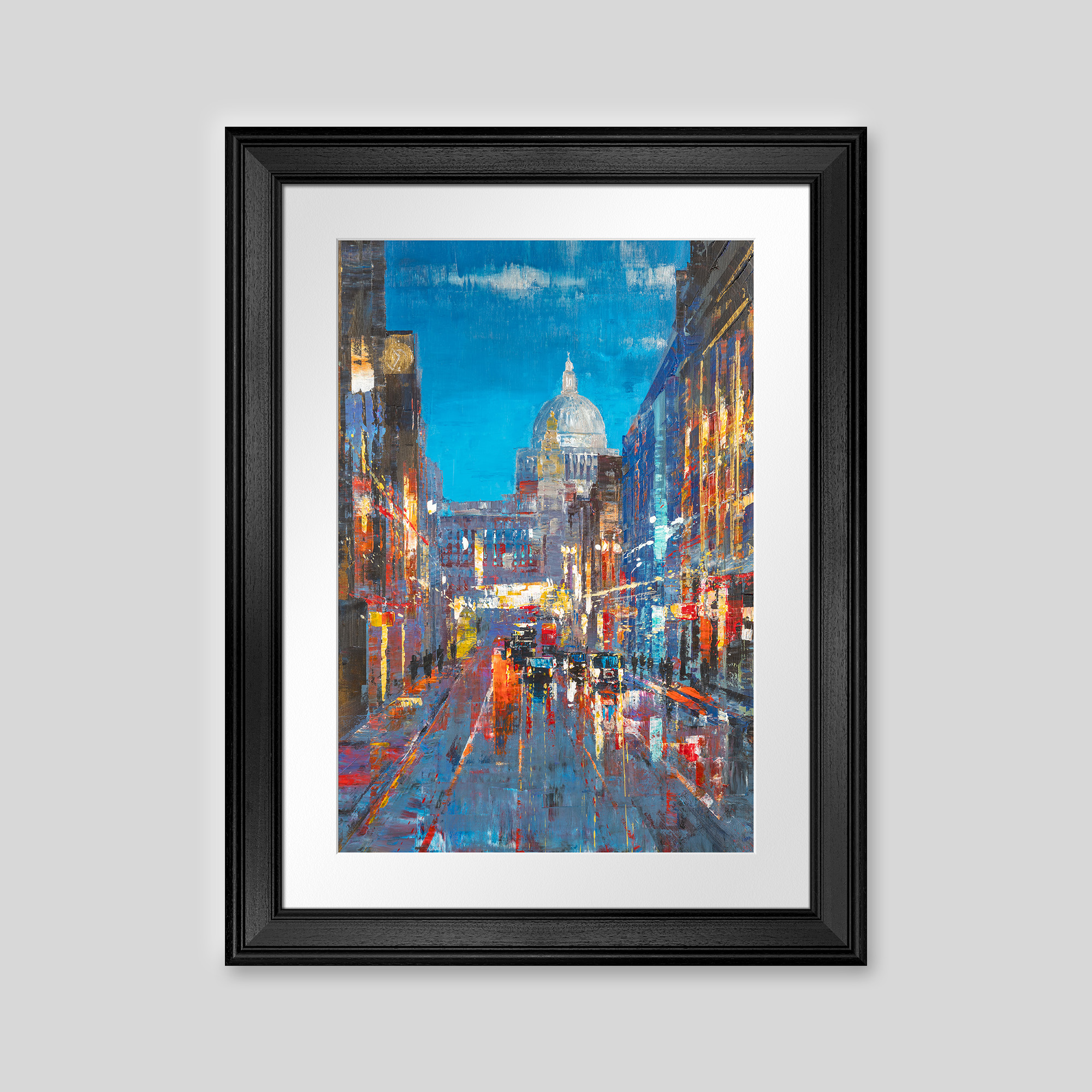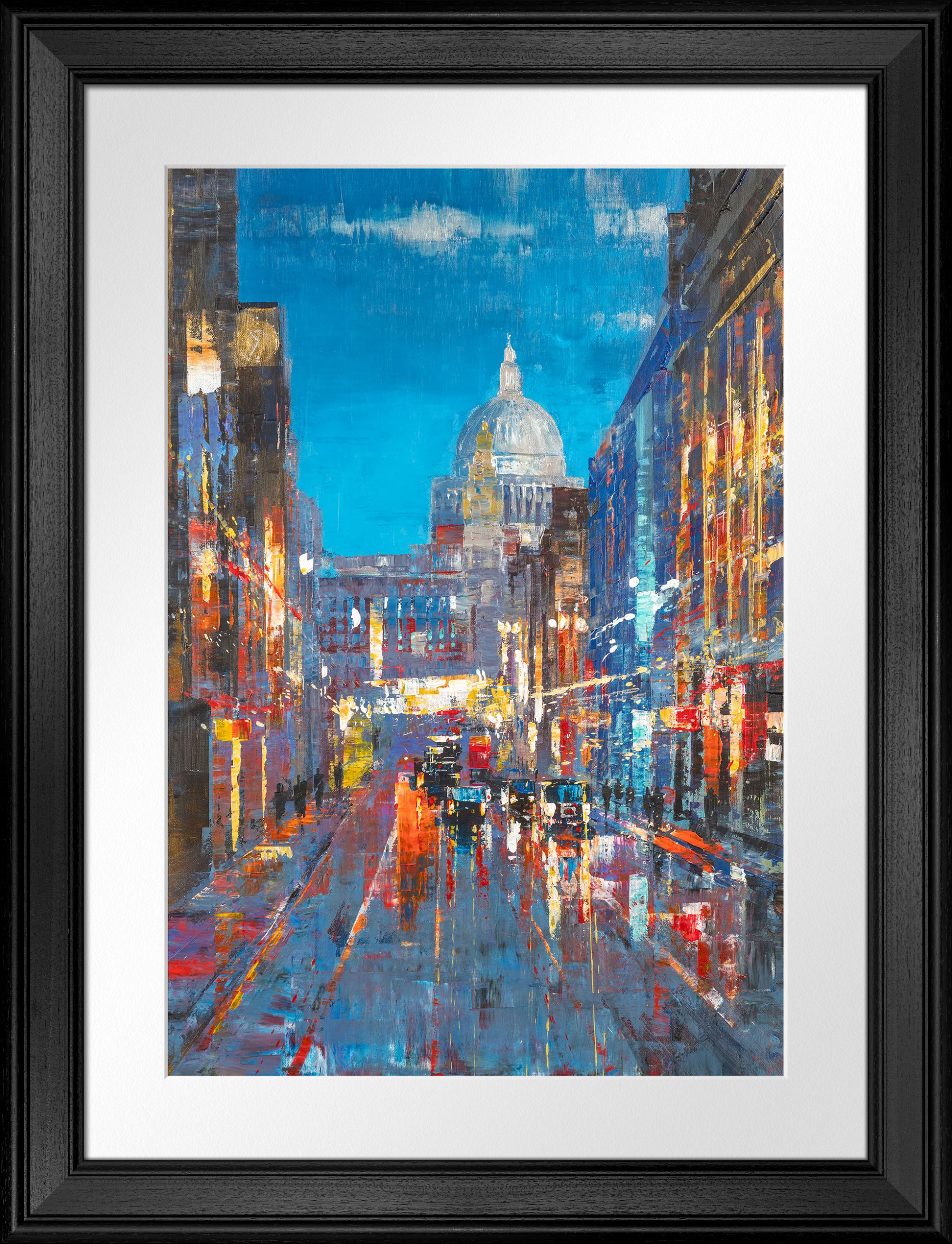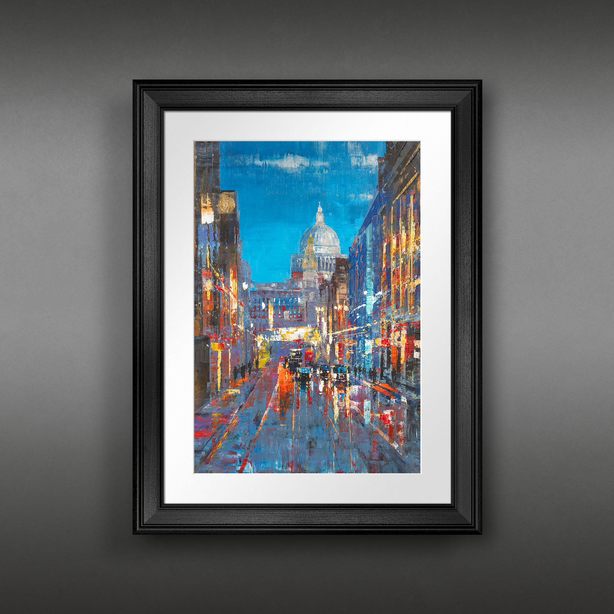 “Cathedral of Light” is an Limited Edition Print of a London Cityscape Painting by Paul Kenton. A glowing London scene centred on St Paul’s Cathedral, illuminated in deep blues and golds that celebrate the city’s energy and architectural beauty.