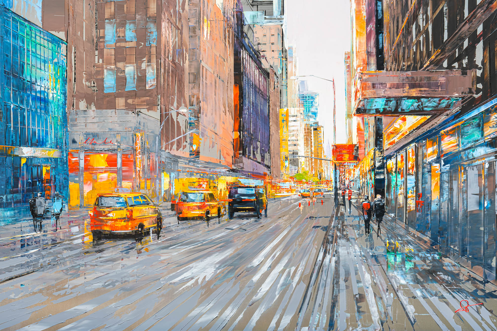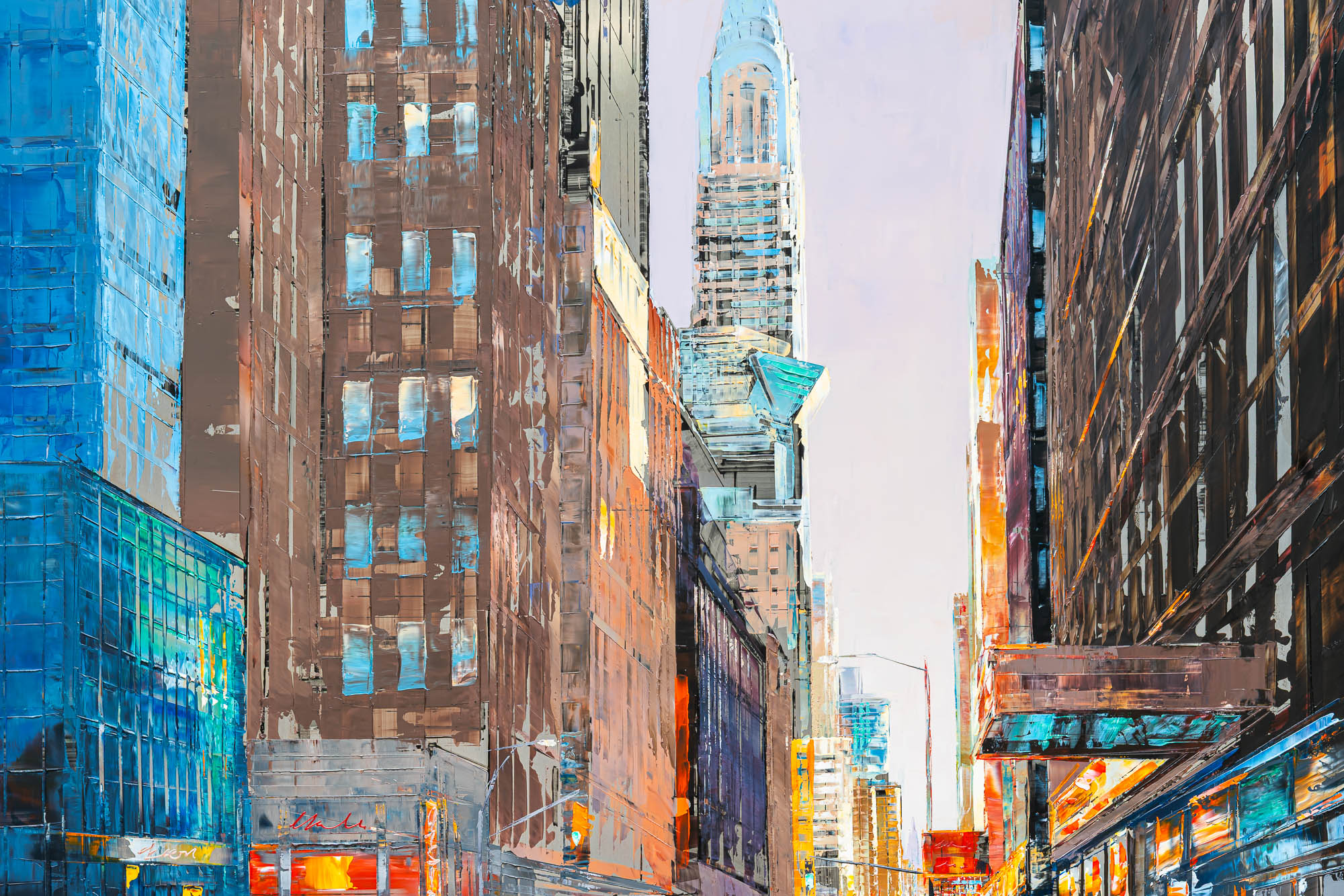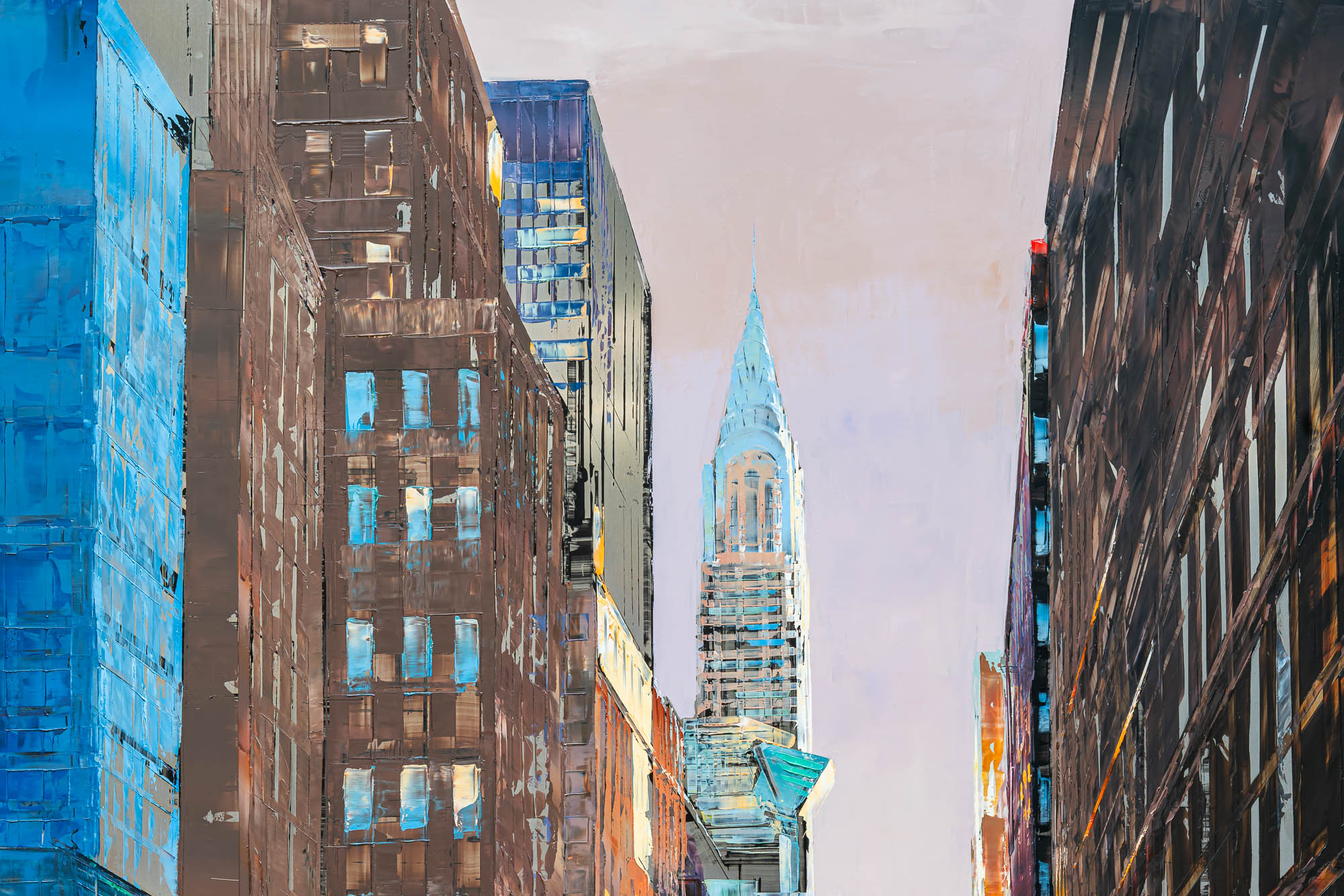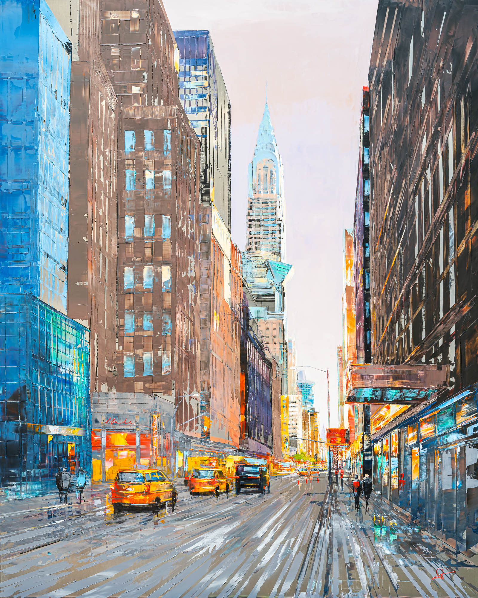 “City in Silver Light” casts Manhattan in a luminous metallic glow, where the cool sheen of exposed aluminium meets the warmth of evening traffic. The Chrysler Building rises like a silver beacon above the skyline, its Art Deco crown catching soft light as the city stretches out beneath it. Paul’s layered oils blend reflections, architecture, and motion into a cinematic streetscape that hums with New York energy.