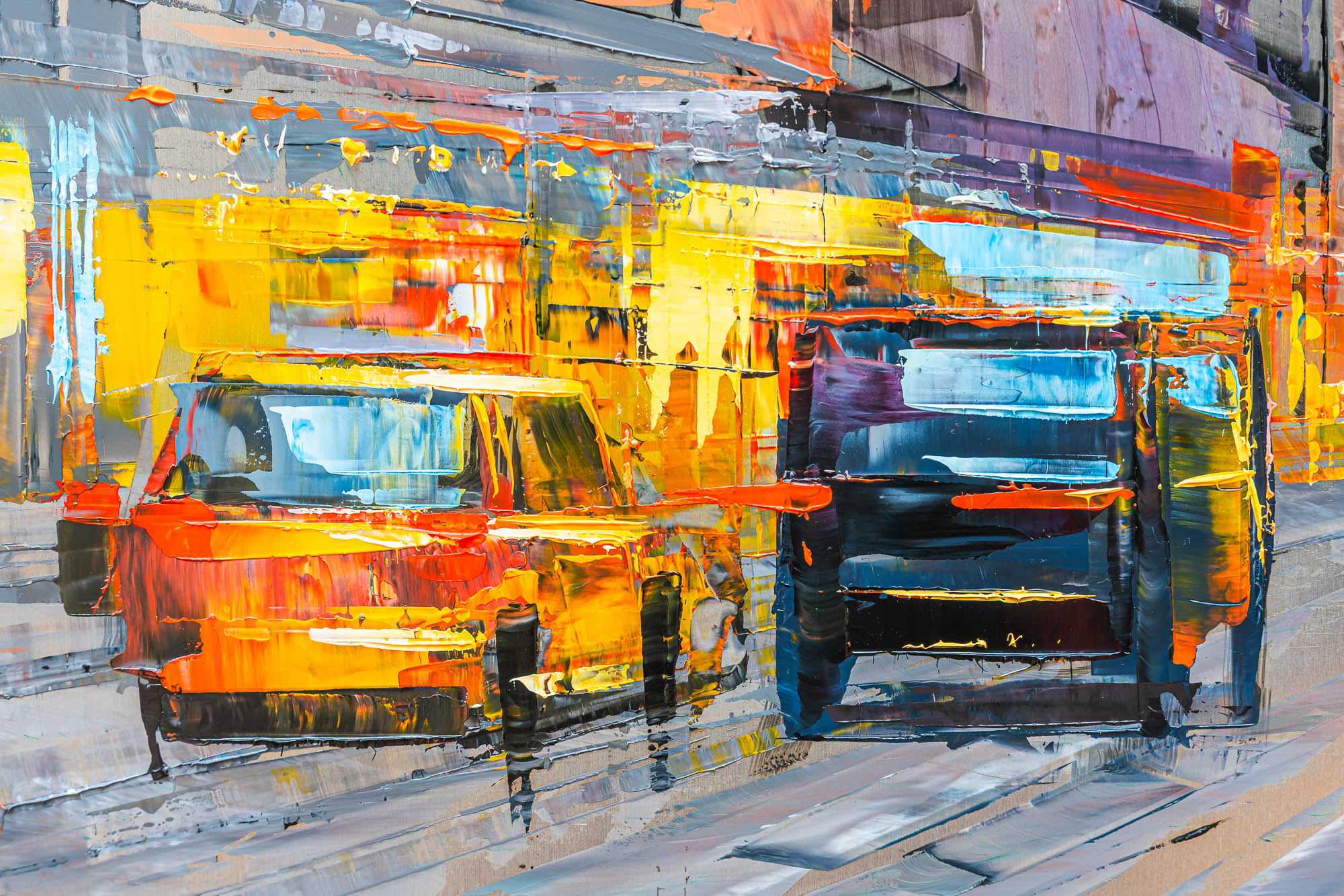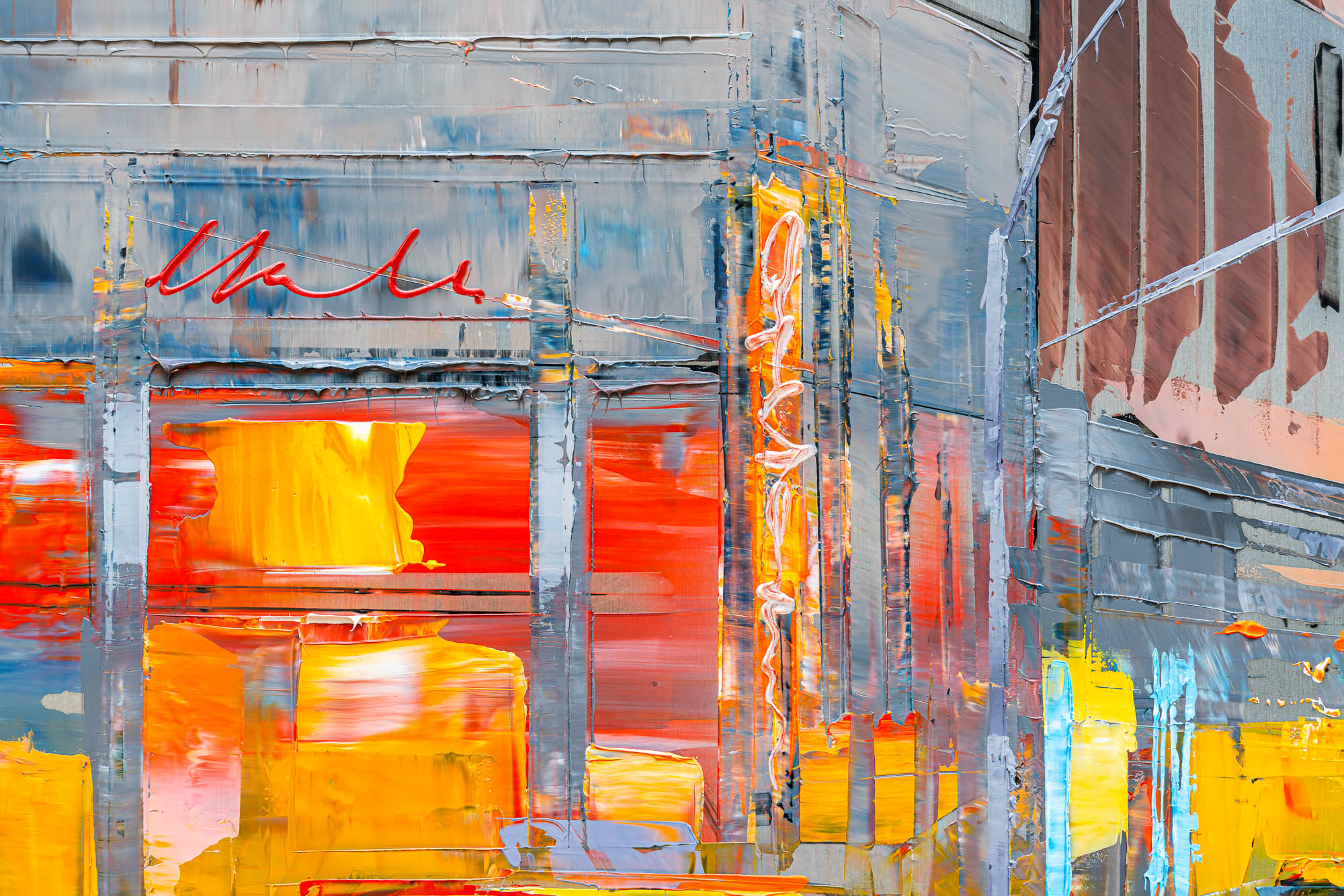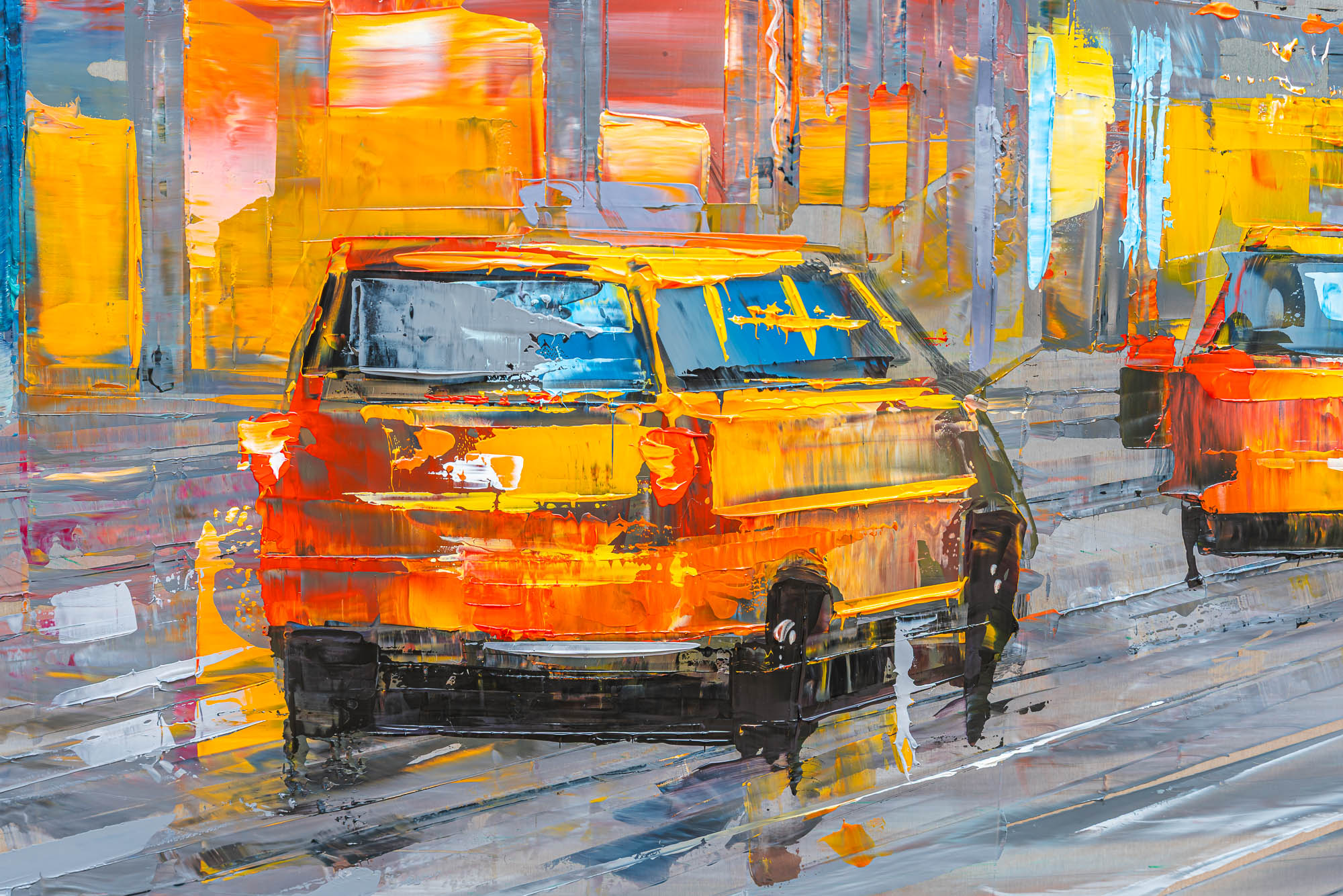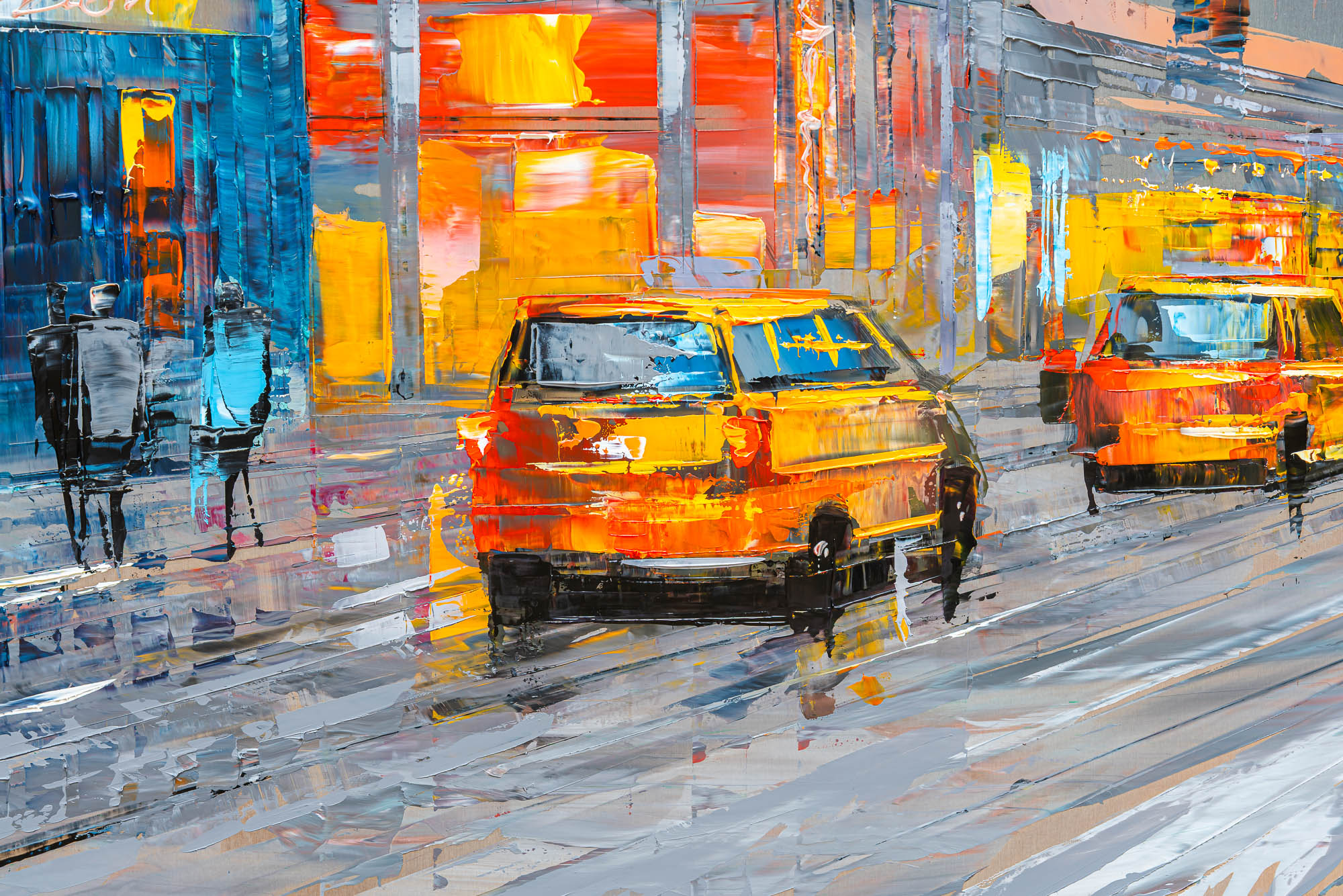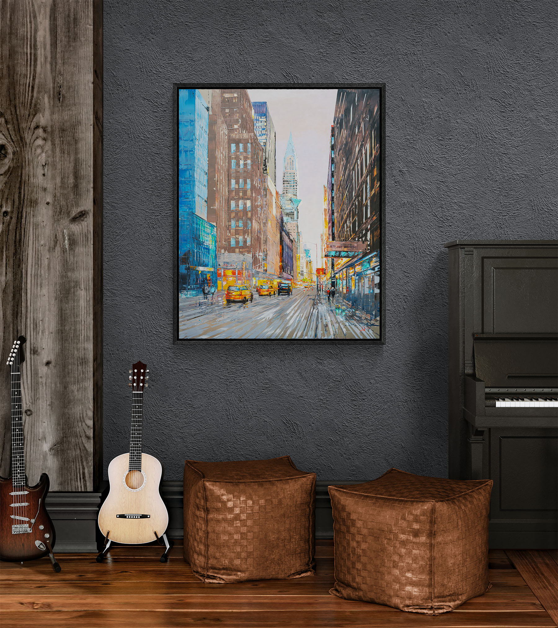 “City in Silver Light” casts Manhattan in a luminous metallic glow, where the cool sheen of exposed aluminium meets the warmth of evening traffic. The Chrysler Building rises like a silver beacon above the skyline, its Art Deco crown catching soft light as the city stretches out beneath it. Paul’s layered oils blend reflections, architecture, and motion into a cinematic streetscape that hums with New York energy.