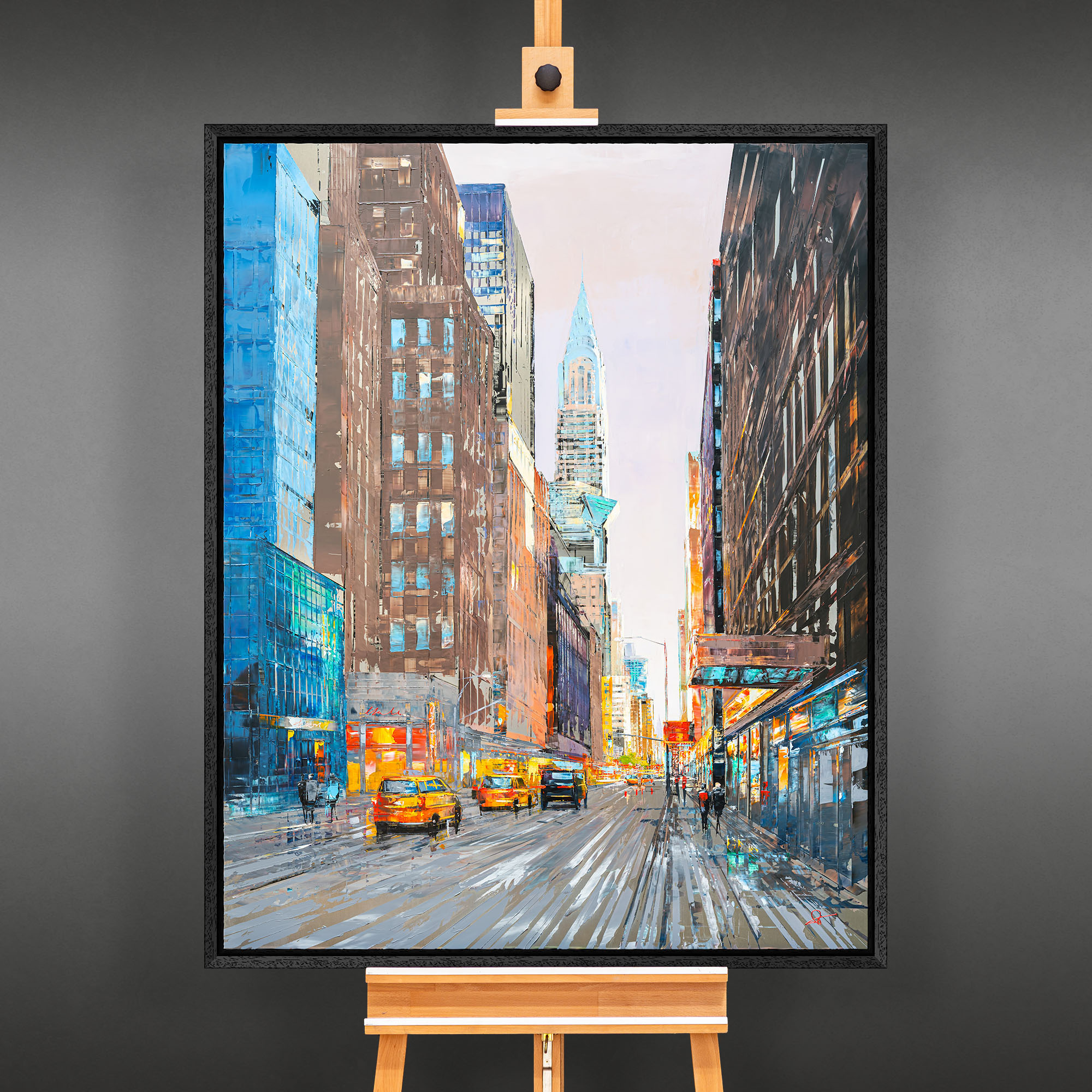127 x 101.5 cm | 50 x 40 in [media]. A reflective Manhattan streetscape where silver tones and evening light shape a calm urban moment.. New York Contemporary Art Original Painting by Contemporary Cityscape Artist Paul Kenton. Available to Purchase.