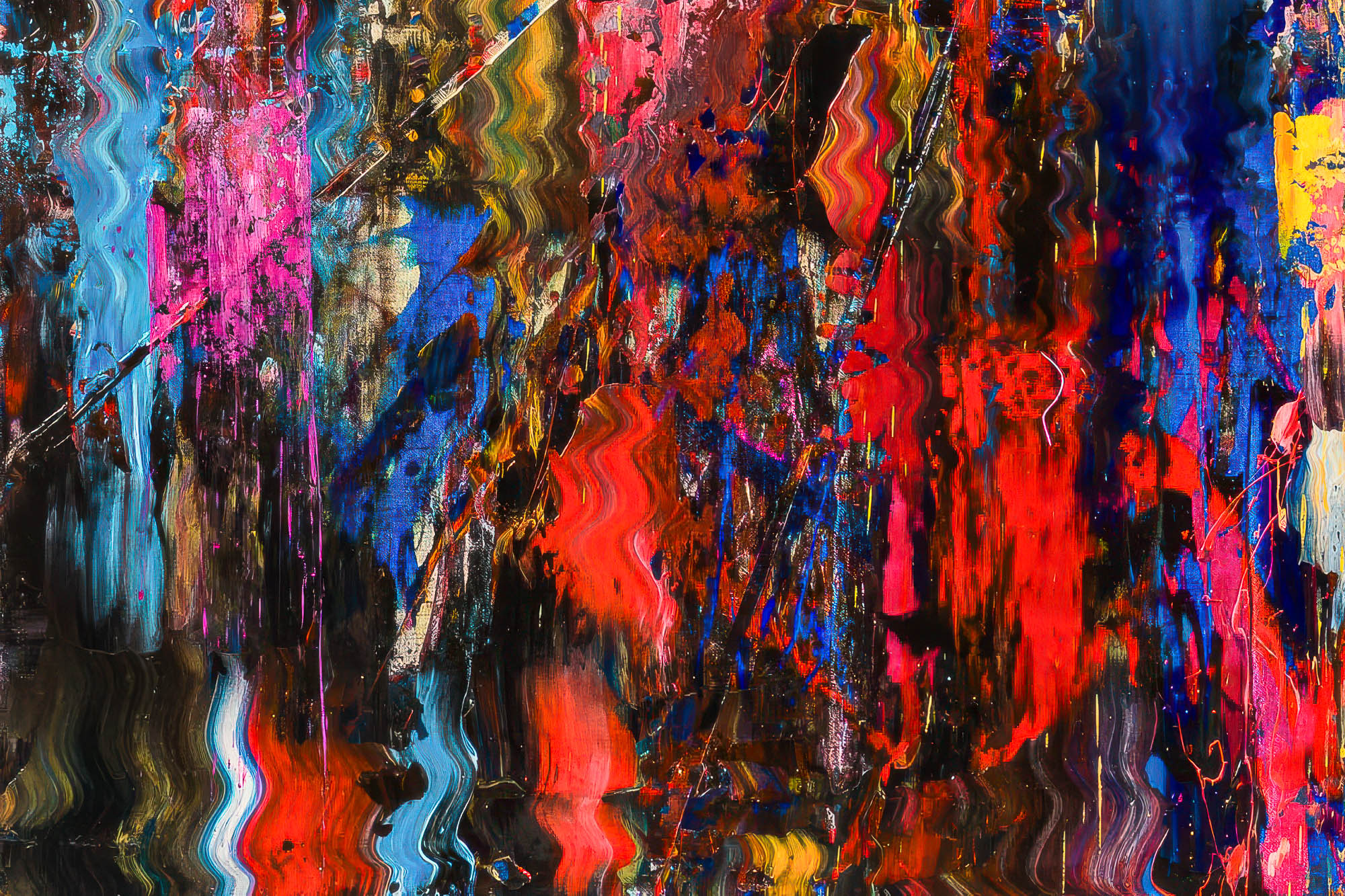 A rain-washed Manhattan night pulses with light and motion. Neon signs shimmer across the wet streets, blending into bold streaks of colour that blur architecture and atmosphere into one. The scene hums with the rhythm of a city that never pauses, glowing against the darkened sky.