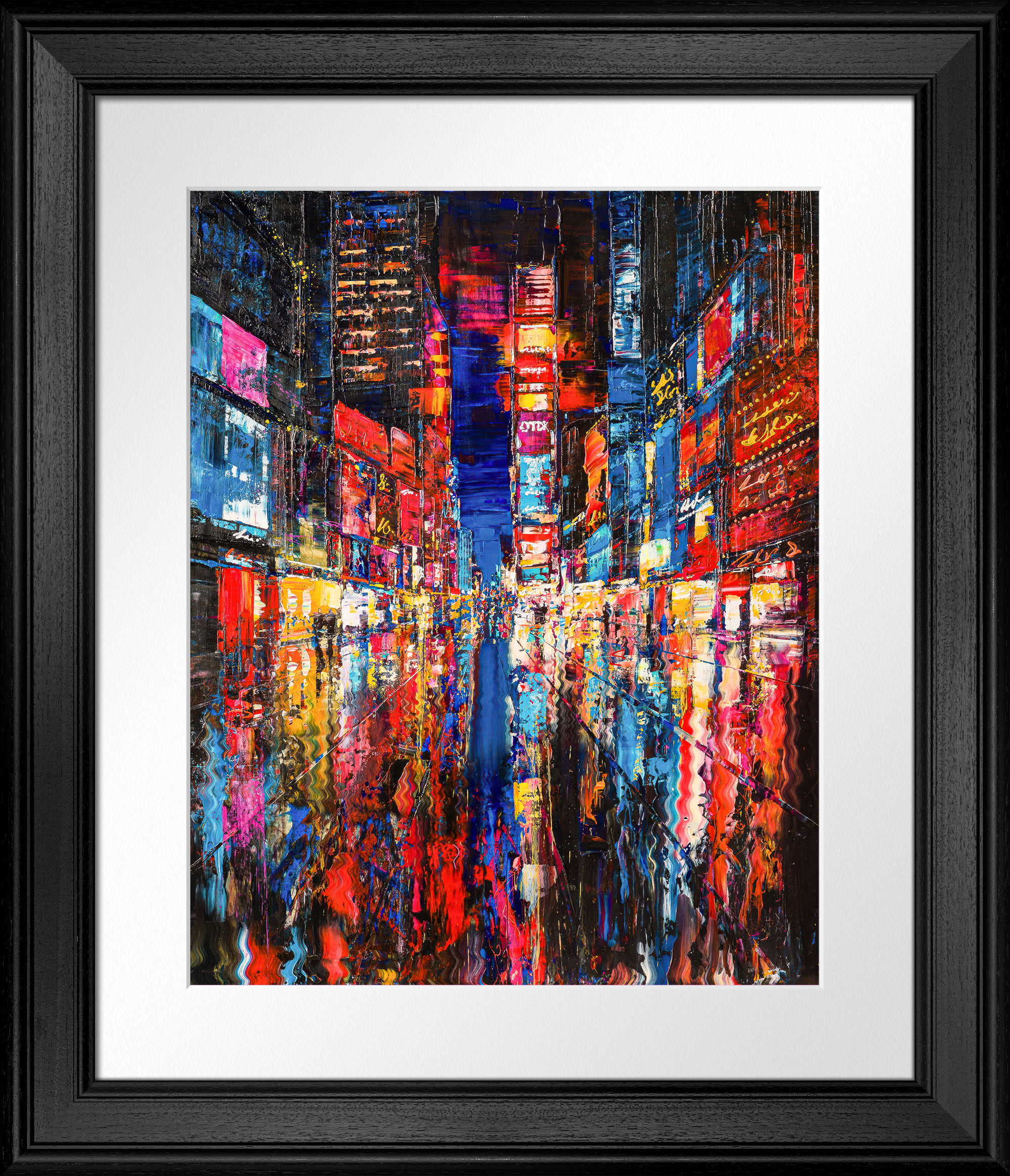 “Downtown Dazzle” is an Limited Edition Print of a New York Cityscape Painting by Paul Kenton. A vibrant, rain-soaked view of Times Square, alive with reflections and neon light.