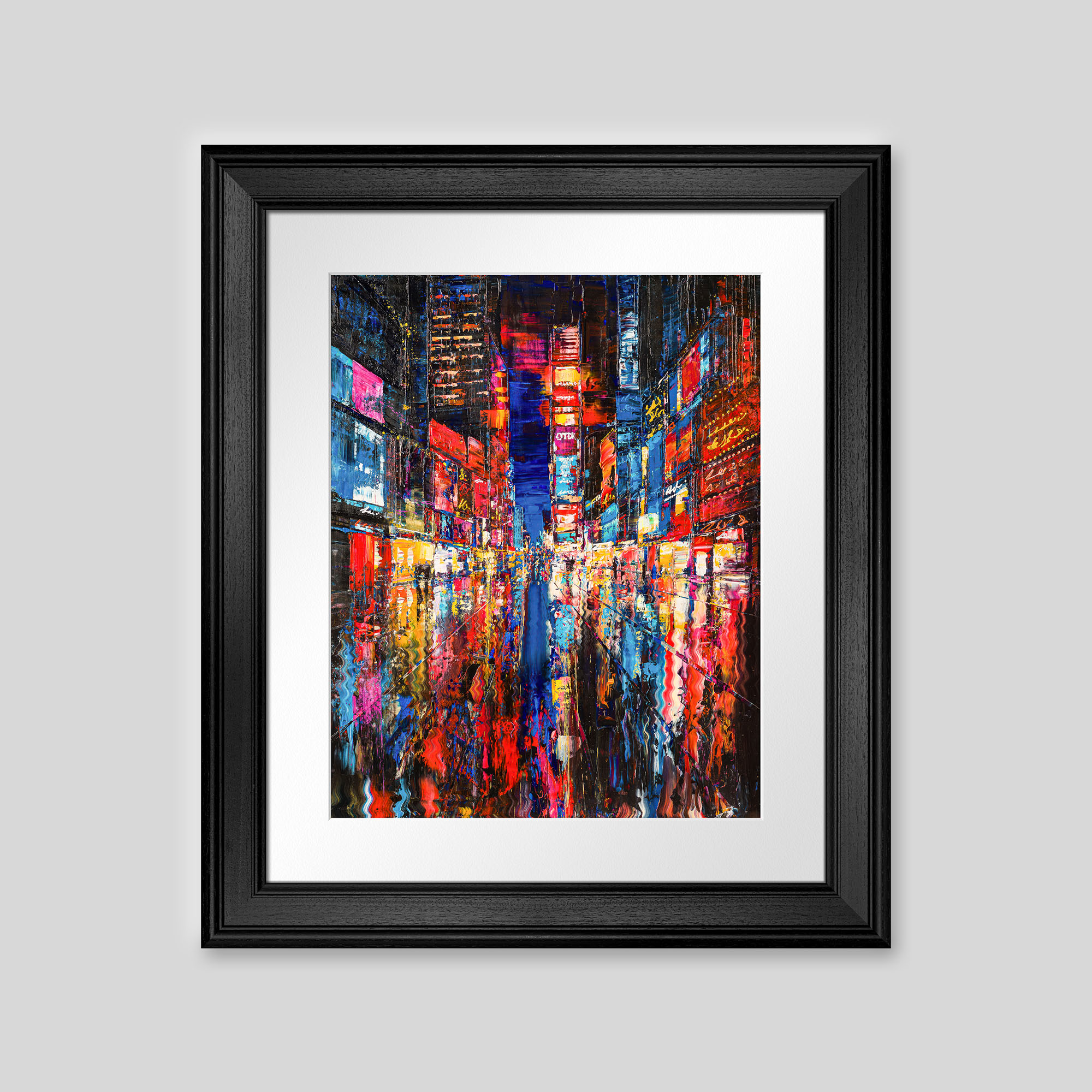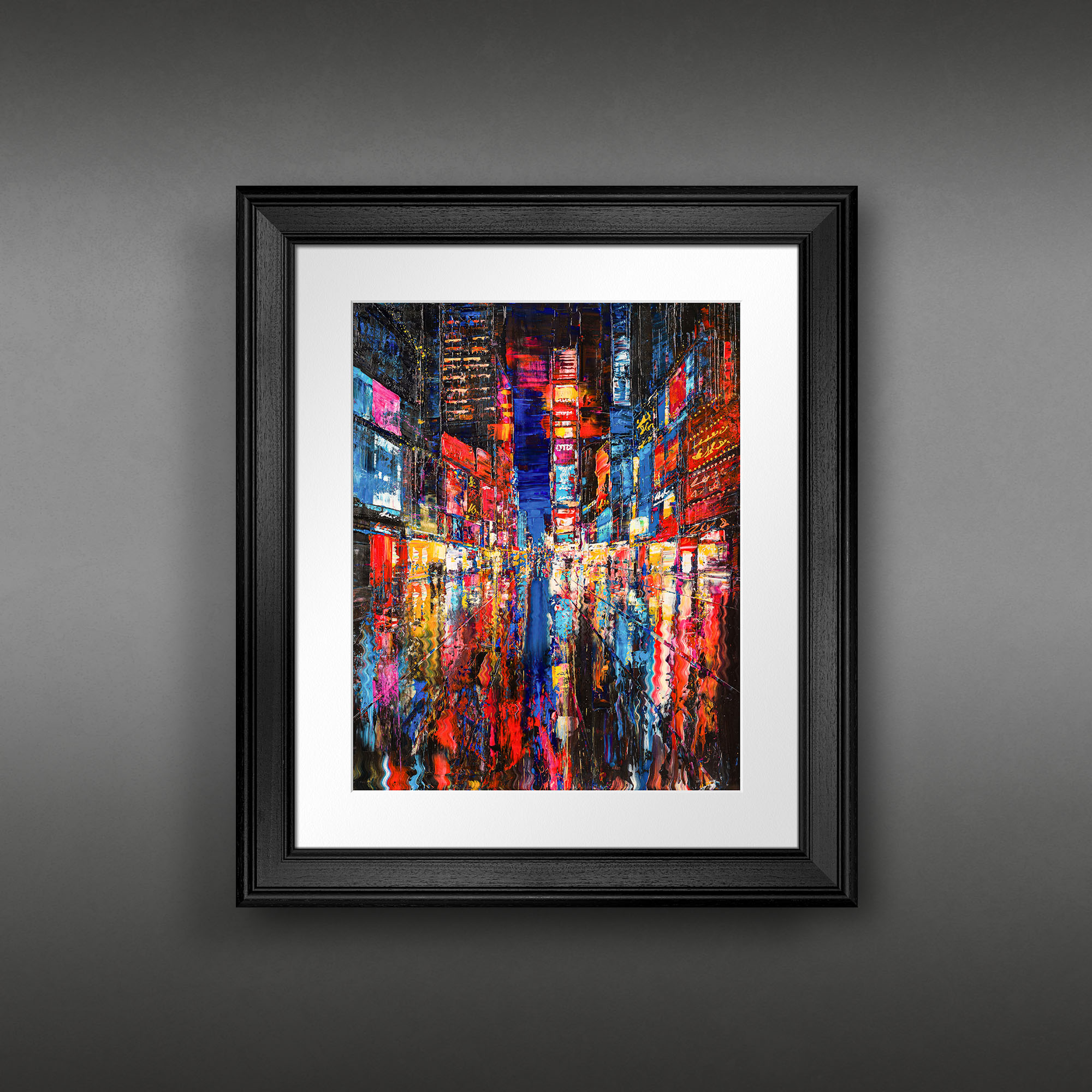 62.5 x 50 cm | 24.5 x 19.75 in [media]. A vibrant, rain-soaked view of Times Square, alive with reflections and neon light.. New York Contemporary Art Original Painting by Contemporary Cityscape Artist Paul Kenton. Available to Purchase.