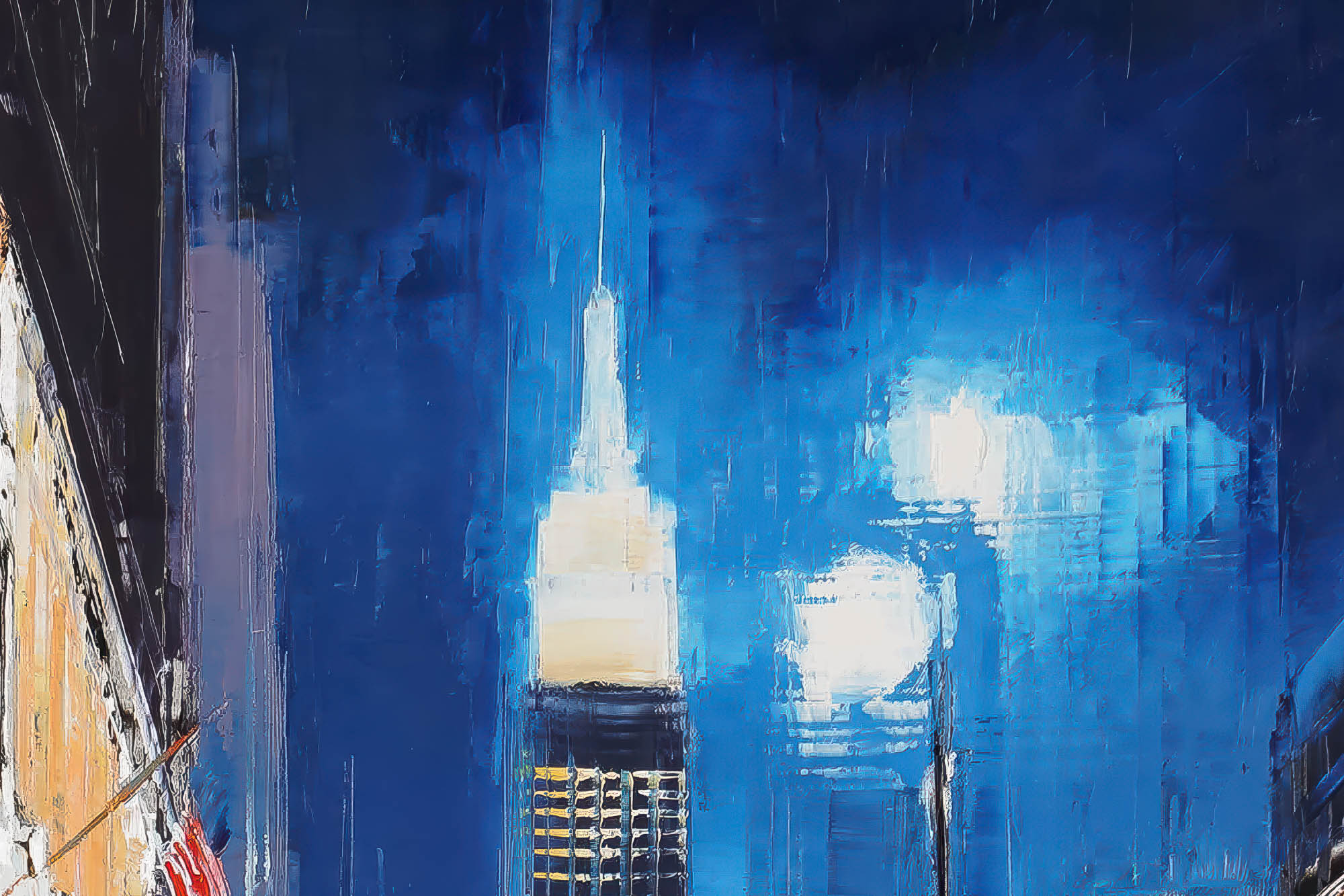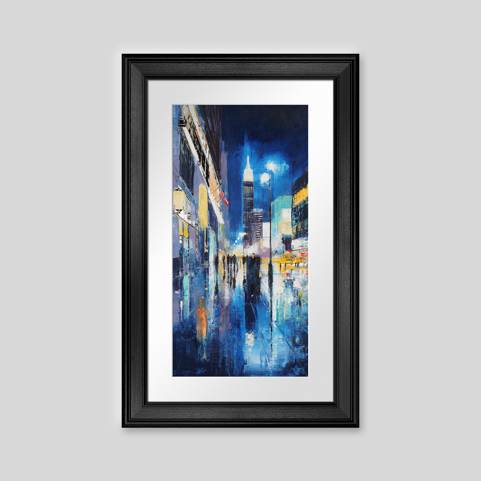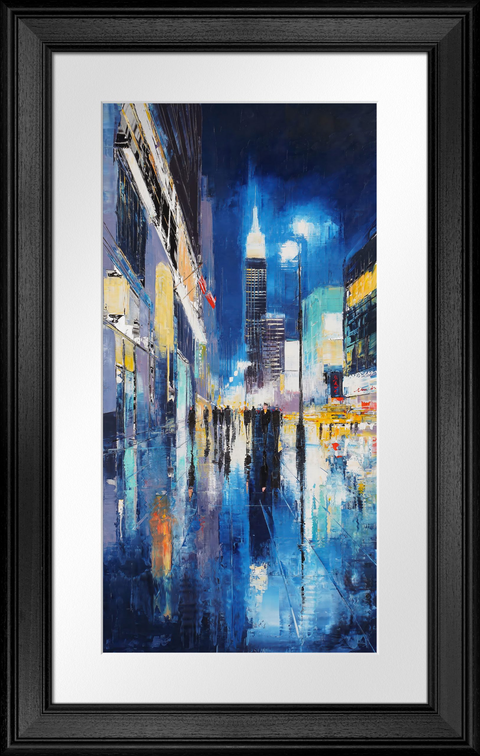 80 x 40 cm | 31.5 x 15.75 in [media]. A vibrant New York night scene with the Empire State Building glowing above rain-slicked streets.. New York Contemporary Art Original Painting by Contemporary Cityscape Artist Paul Kenton. Available to Purchase.