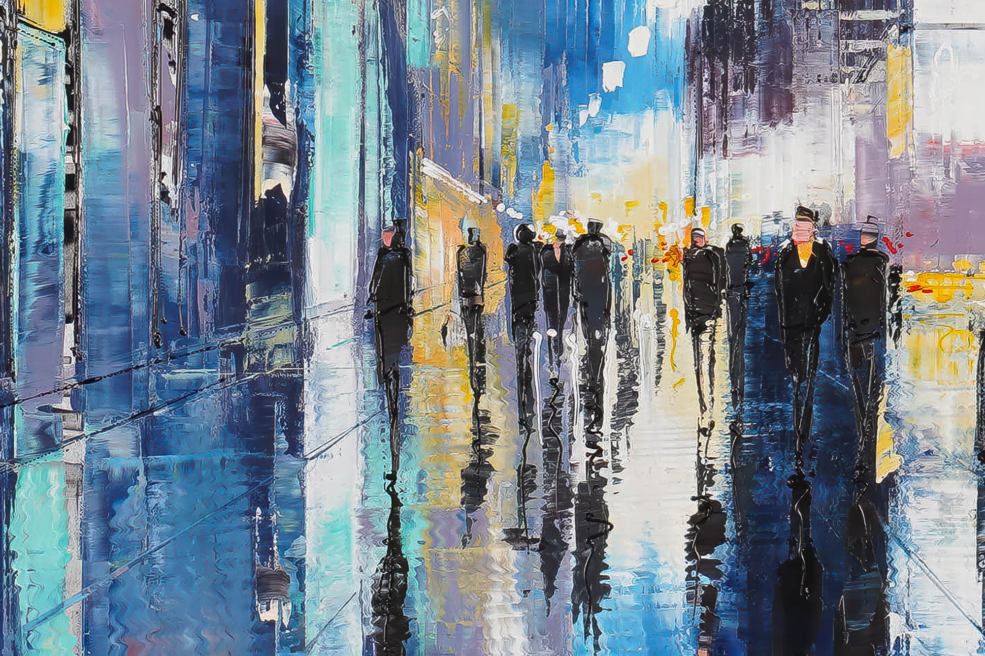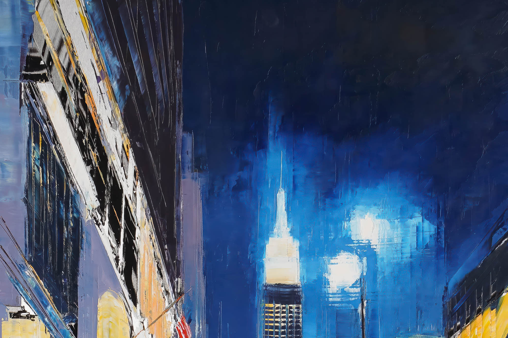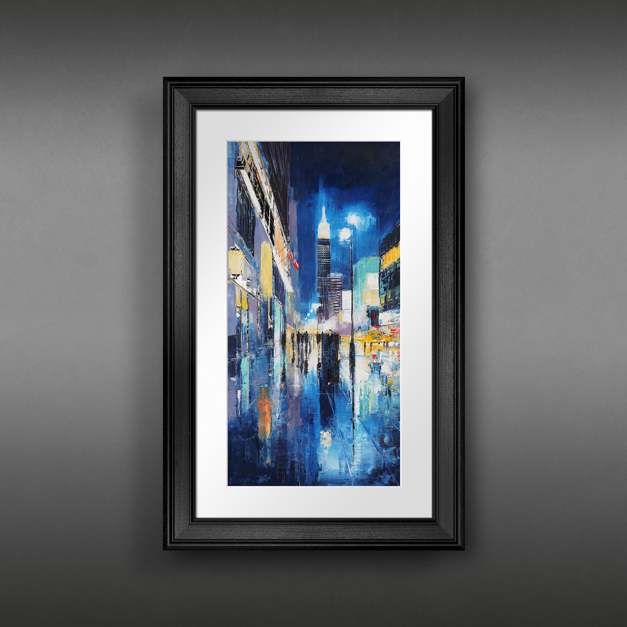 80 x 40 cm | 31.5 x 15.75 in [media]. A vibrant New York night scene with the Empire State Building glowing above rain-slicked streets.. New York Contemporary Art Original Painting by Contemporary Cityscape Artist Paul Kenton. Available to Purchase.