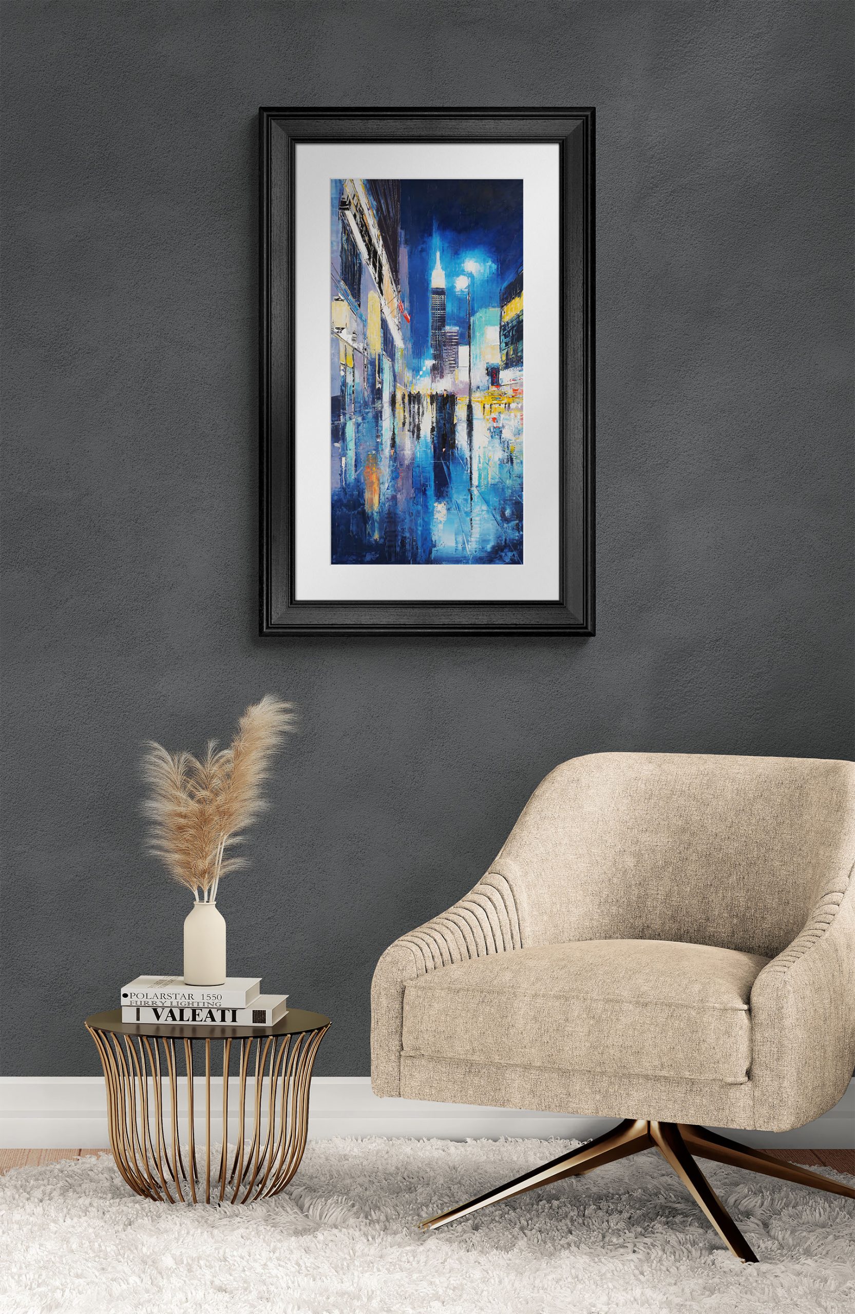 “Electric City” is an Limited Edition Print of a New York Cityscape Painting by Paul Kenton. A vibrant New York night scene with the Empire State Building glowing above rain-slicked streets.