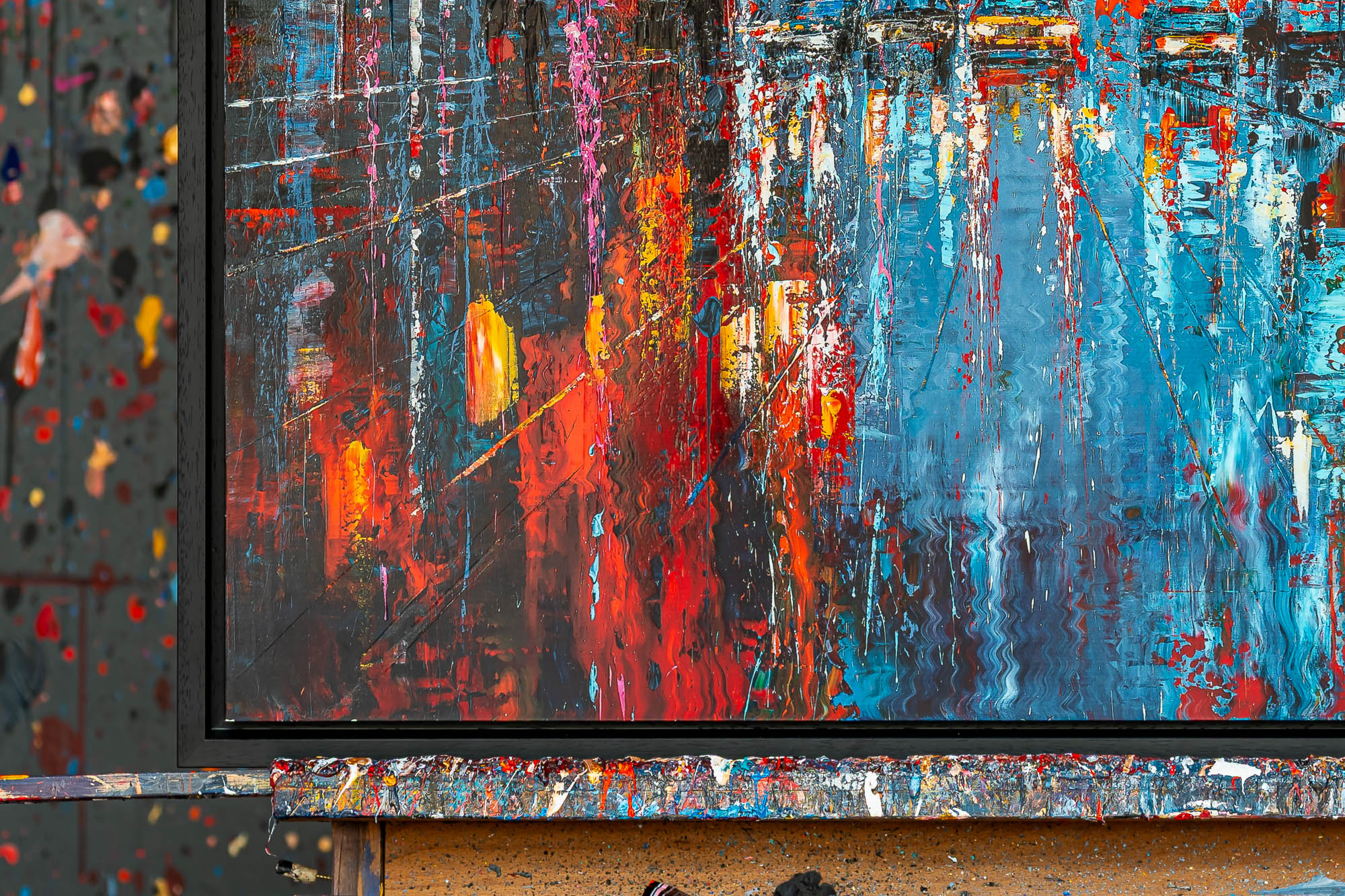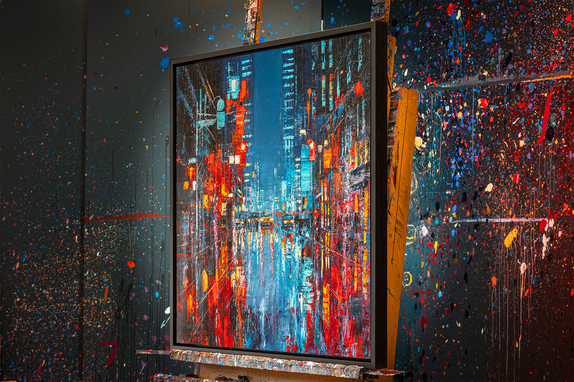 “Electric Crossroads” captures the raw pulse of New York at full tilt in this vast, square-format cityscape where motion and colour collide in dramatic fashion. Painted in mixed media and metallics on boxed canvas, the scene blazes with the energy of countless headlights, soaring towers and illuminated signage. The grid of the city seems to ripple under the force of movement, with long lines of light streaming down wet streets and iconic architecture rising above the blur. Paul’s signature splatters, drips and bold palette knife sweeps are on full display here, bringing the surface alive with texture and rhythm. Paint moves across the canvas with explosive freedom with every flick, streak and drip adding to the sense of urban dynamism. Metallic pigments shimmer like reflections on glass and steel, constantly shifting with the light. This is Manhattan not as a still image, but as a living, breathing force - electric, layered, and impossible to contain.