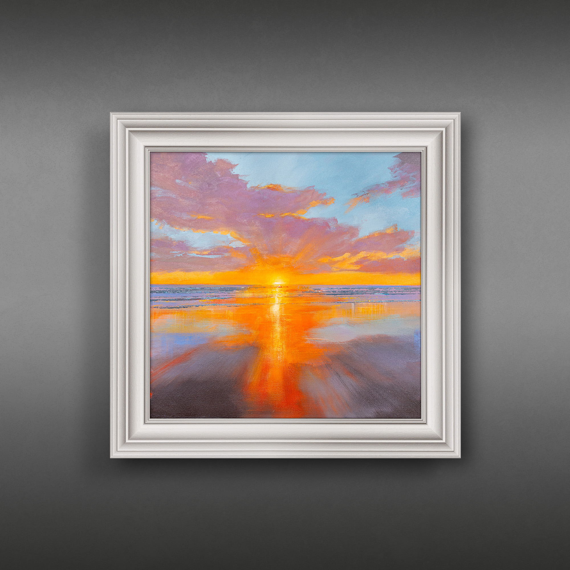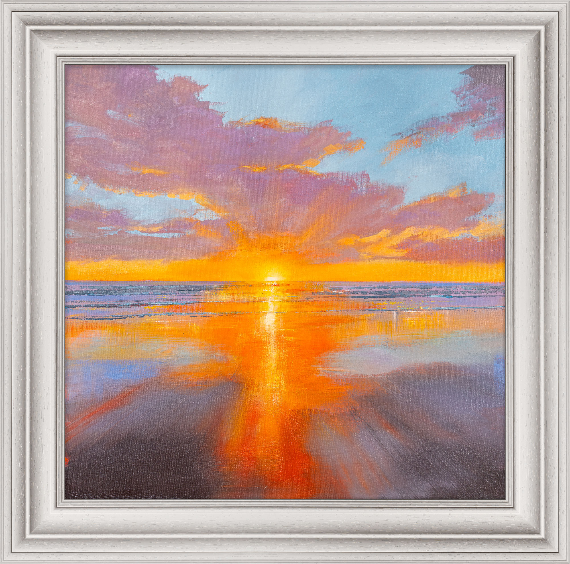 “Evening Tide” captures the shoreline as the tide eases back beneath a sky brushed with soft coral, lavender and pale gold. The sinking sun burns gently at the centre of the horizon, its light stretching outward and pooling across the wet sand below. Reflections ripple in elongated streaks, blending warm and cool tones into a smooth atmospheric gradient. The sky holds subtle movement within its layered clouds, while the foreground remains open and expansive, allowing the light to travel uninterrupted. The composition balances calm and colour, preserving that fleeting coastal stillness at the close of day.