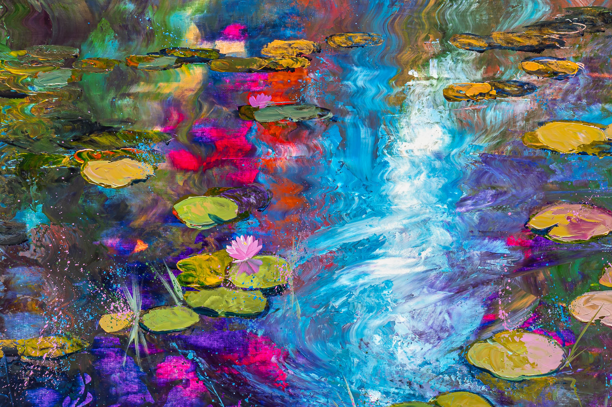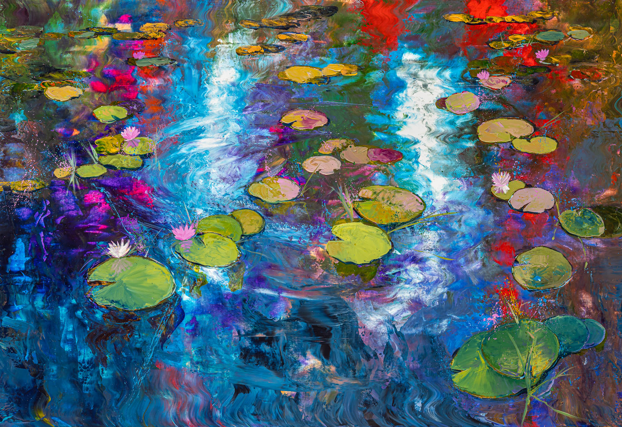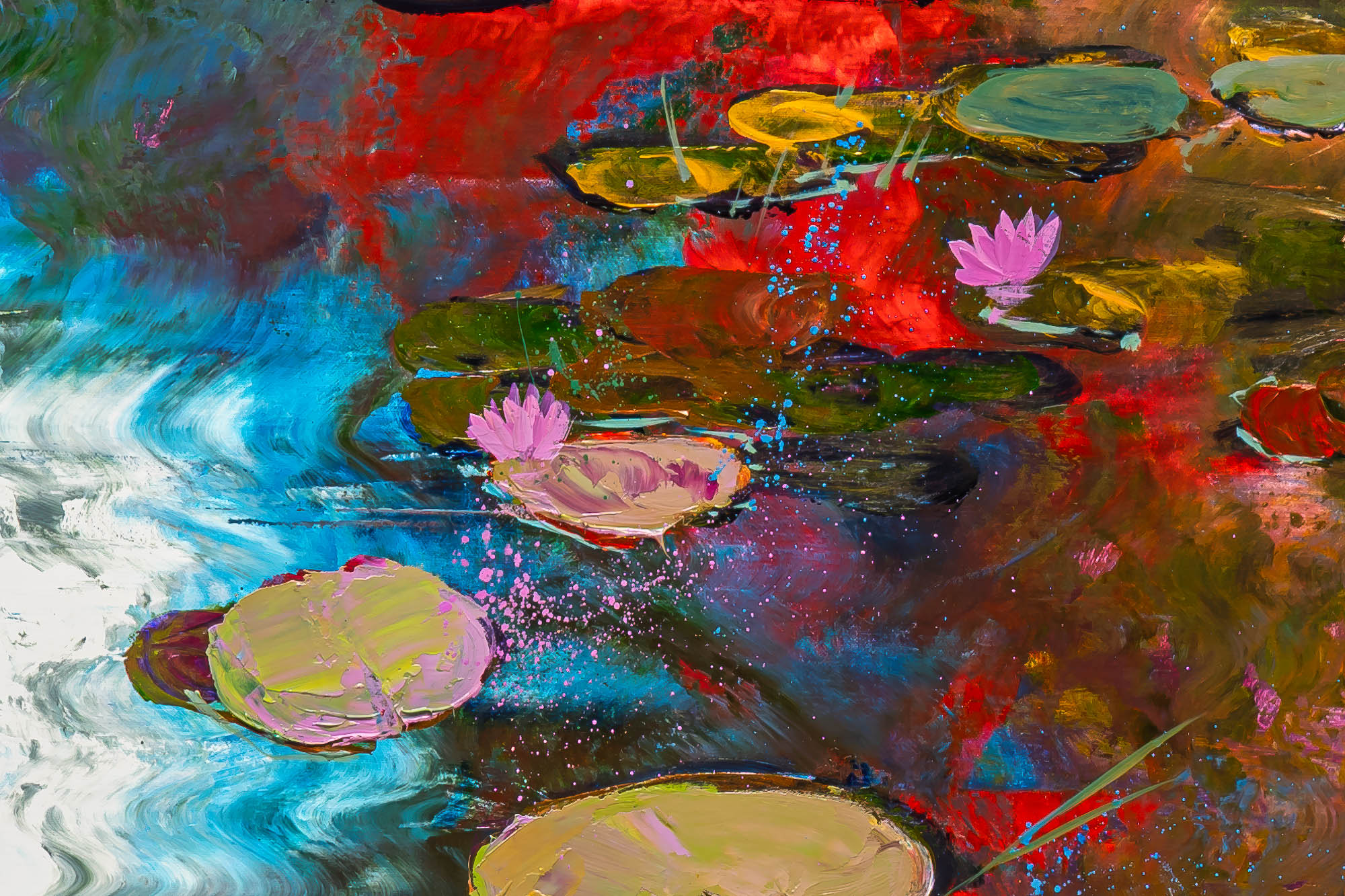 A modern homage to the serenity of Monet’s lily ponds, this piece transforms water into a dance of light and reflection. Ripples of blue and green merge with vibrant tones of red and violet, suggesting movement beneath the calm.