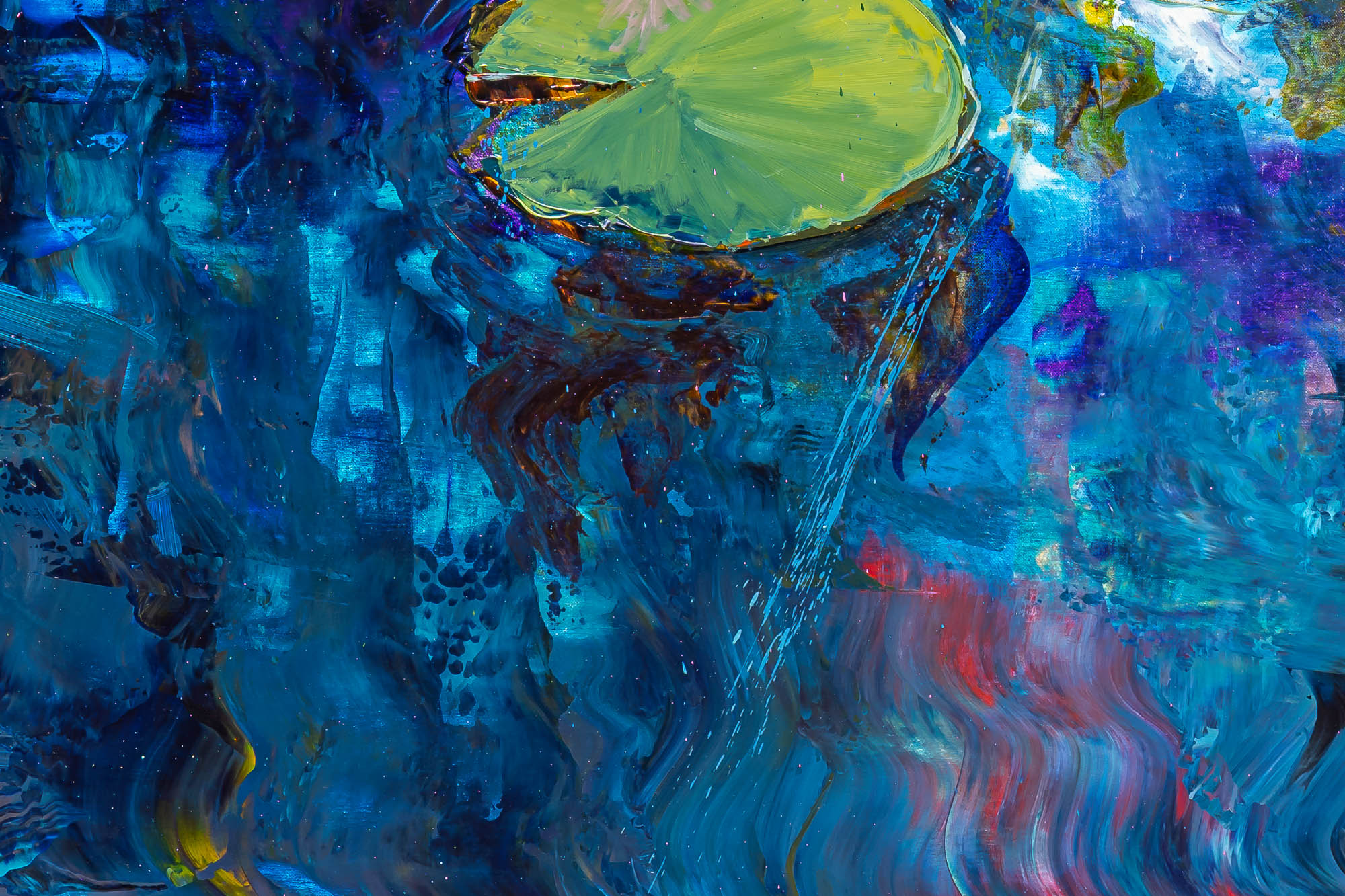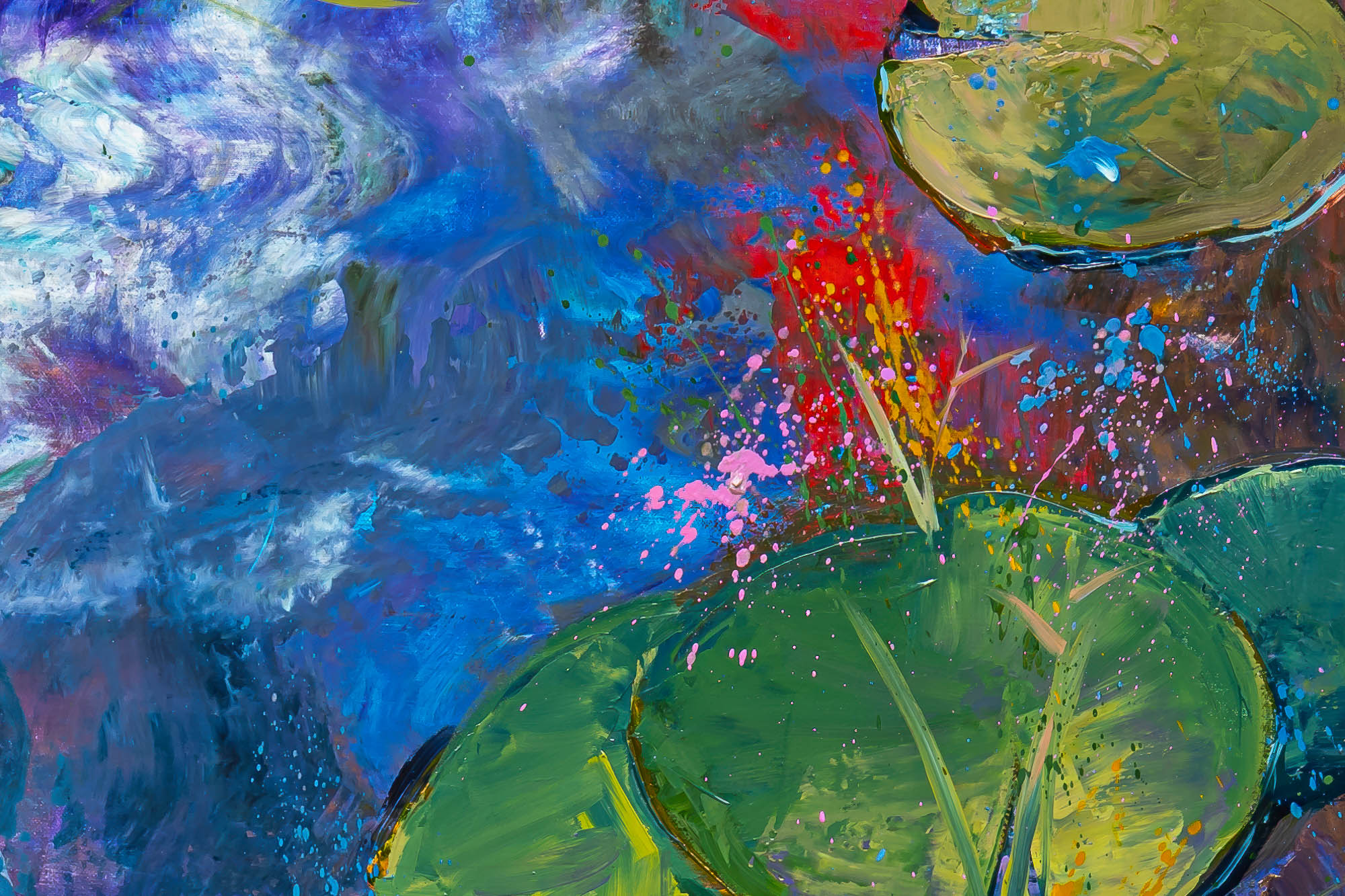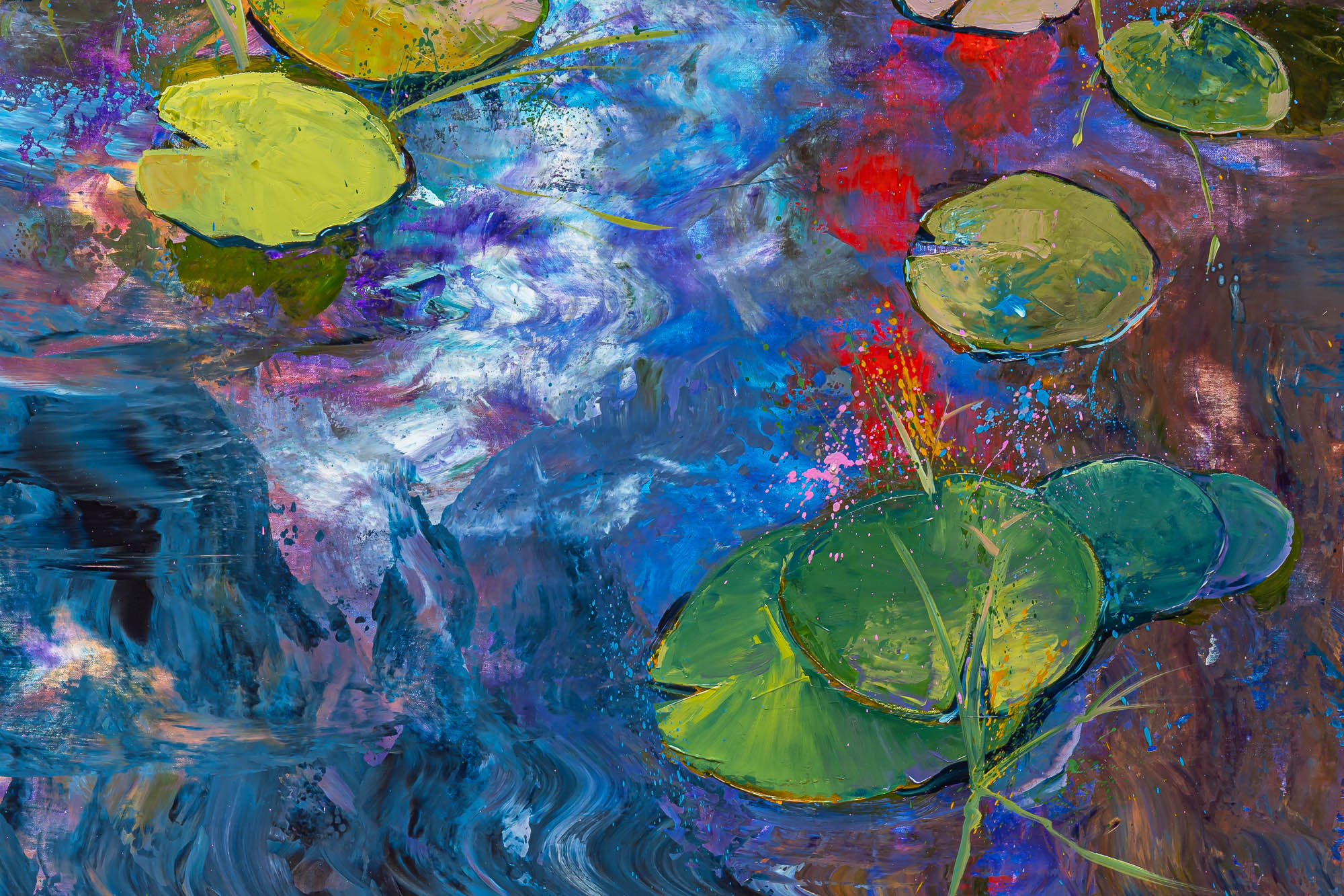 A modern homage to the serenity of Monet’s lily ponds, this piece transforms water into a dance of light and reflection. Ripples of blue and green merge with vibrant tones of red and violet, suggesting movement beneath the calm.