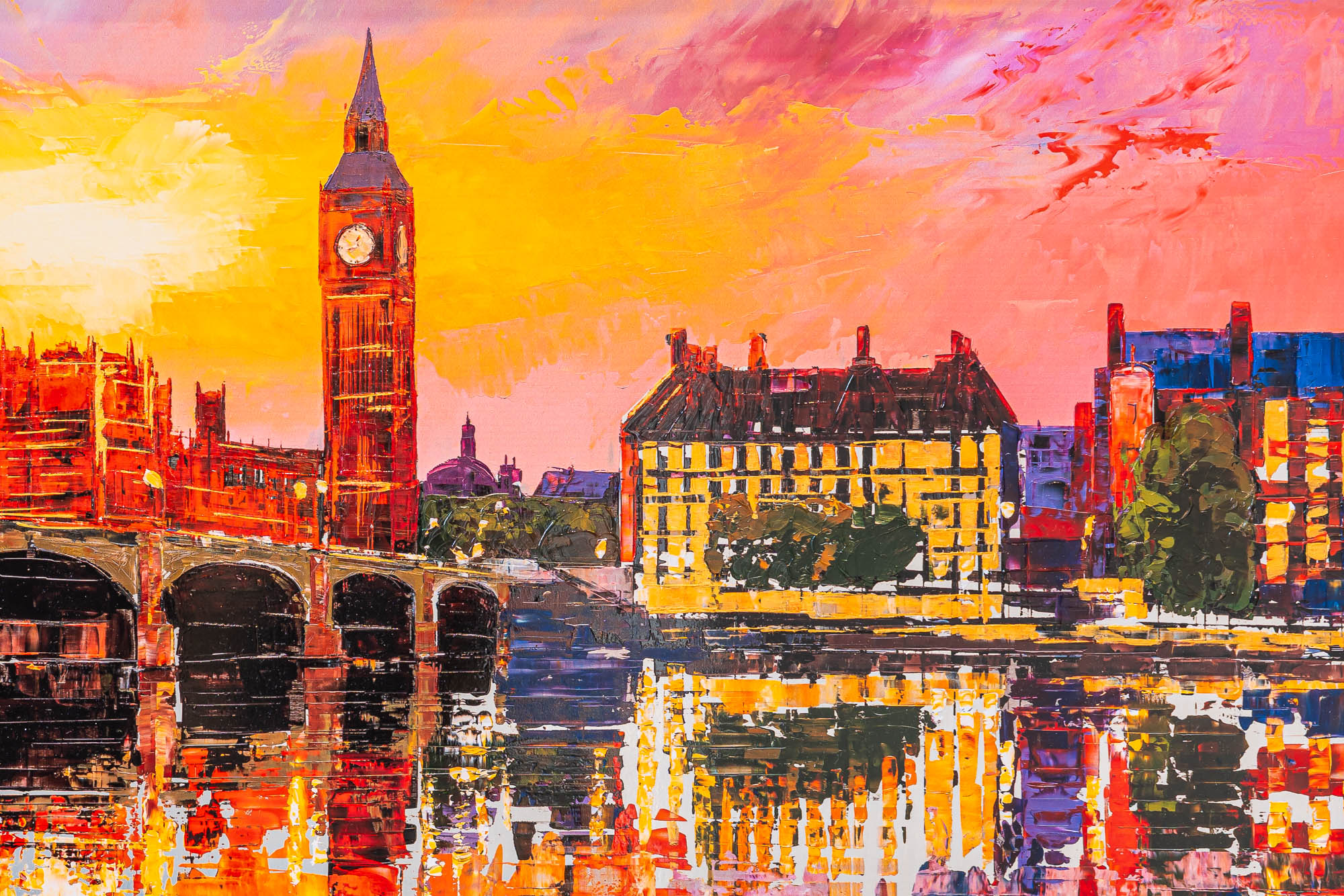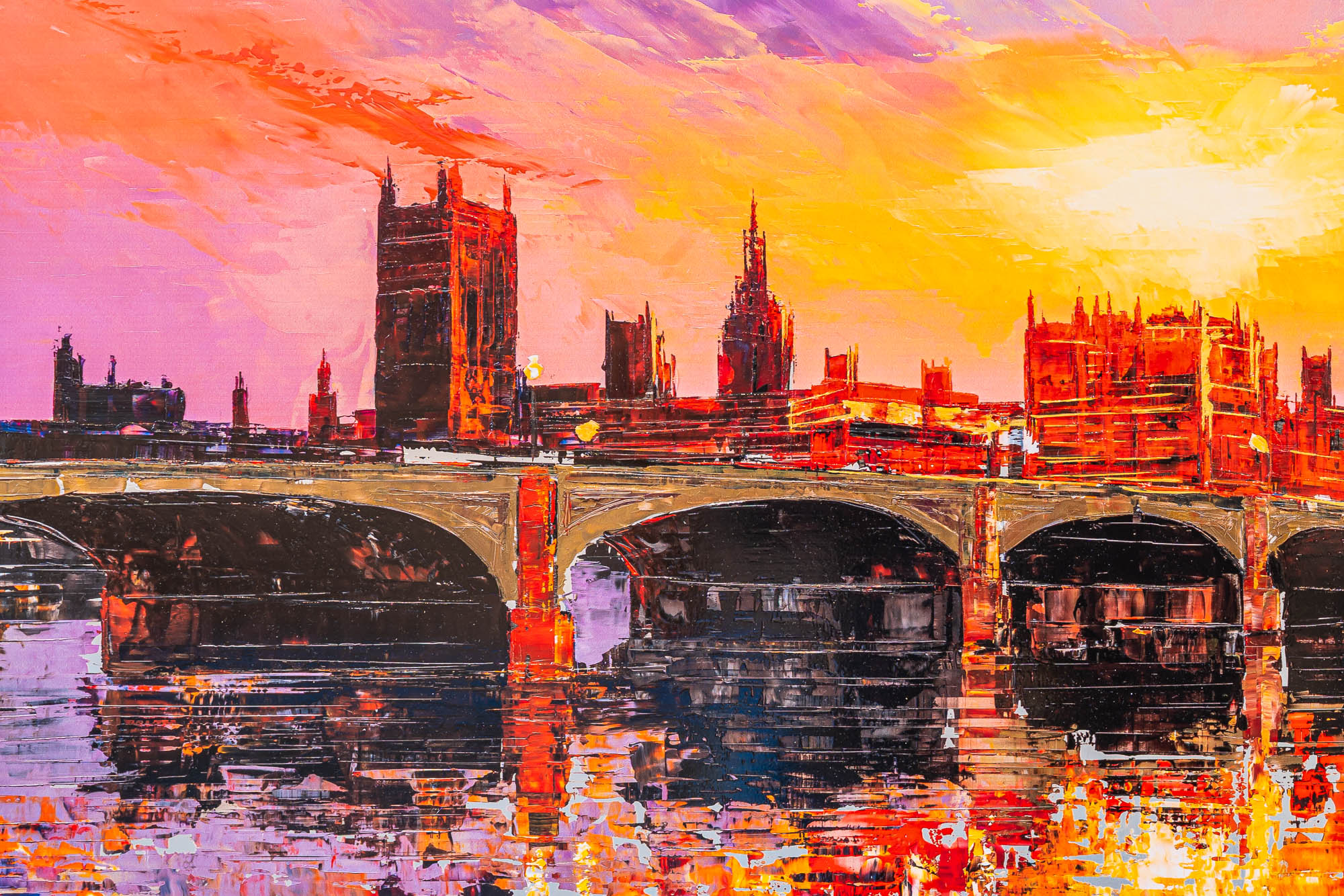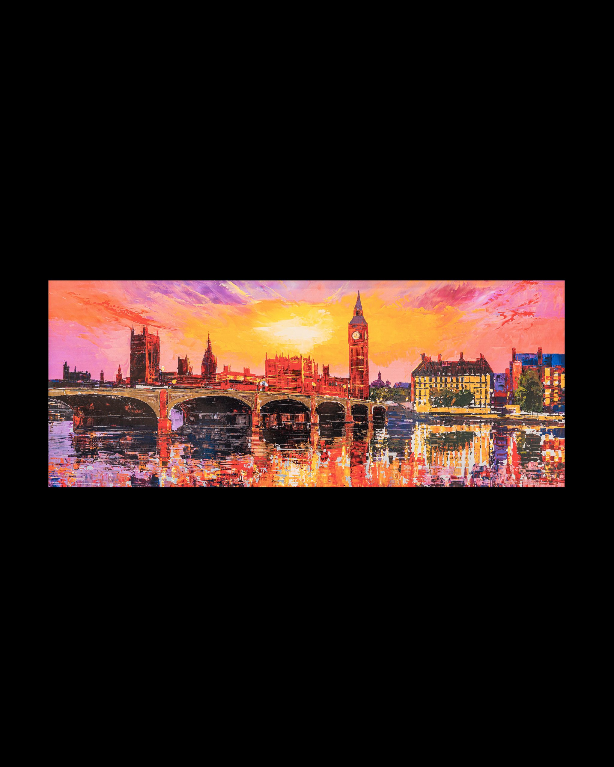 A London skyline set alight in colour, where sunset turns to spectacle and the Thames answers in reflection. Fiery reds and incandescent golds collide with cooler shadows, creating depth and rhythm across the bridge and skyline. The embellished surface intensifies the light, giving the impression that the city itself is radiating heat and motion.