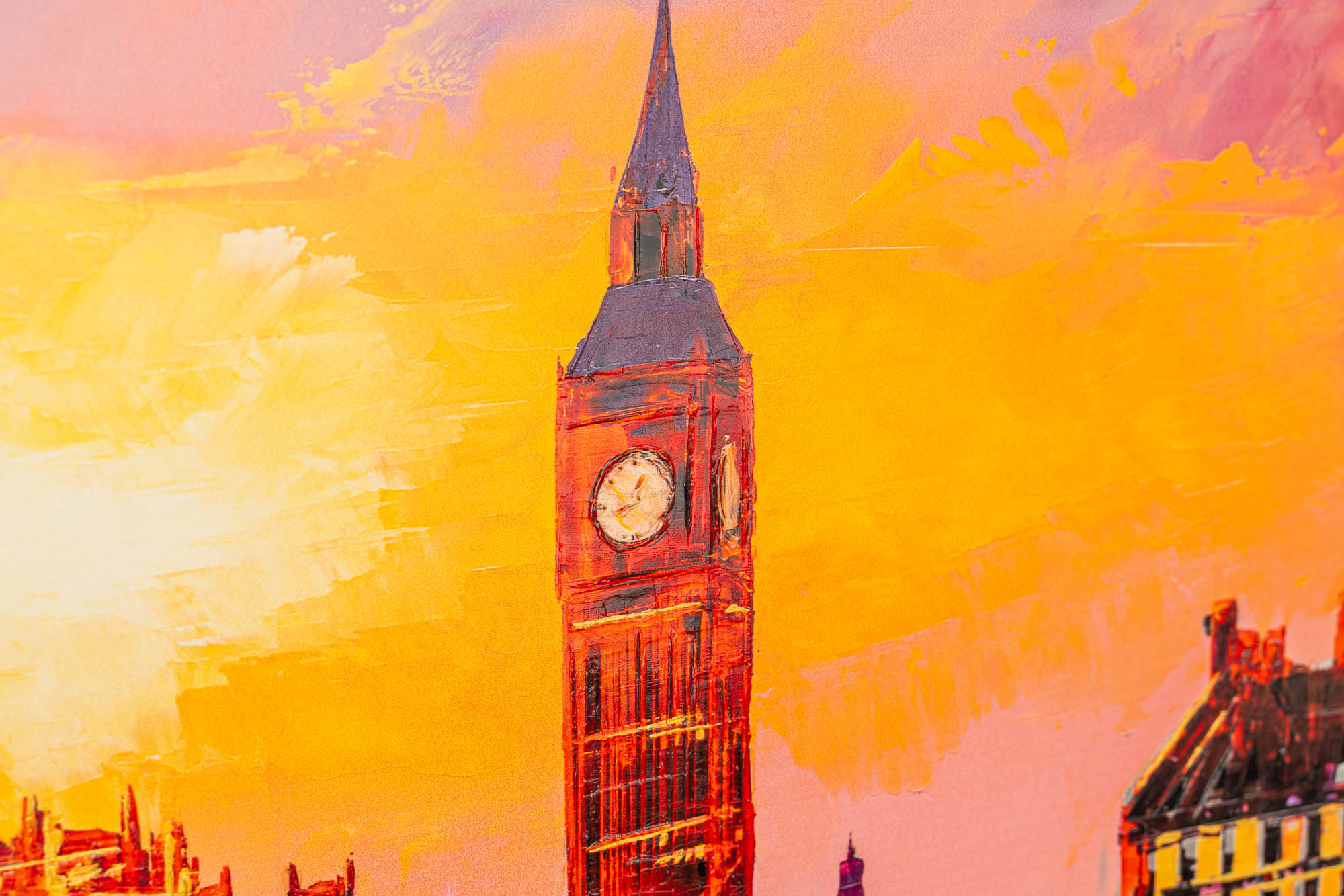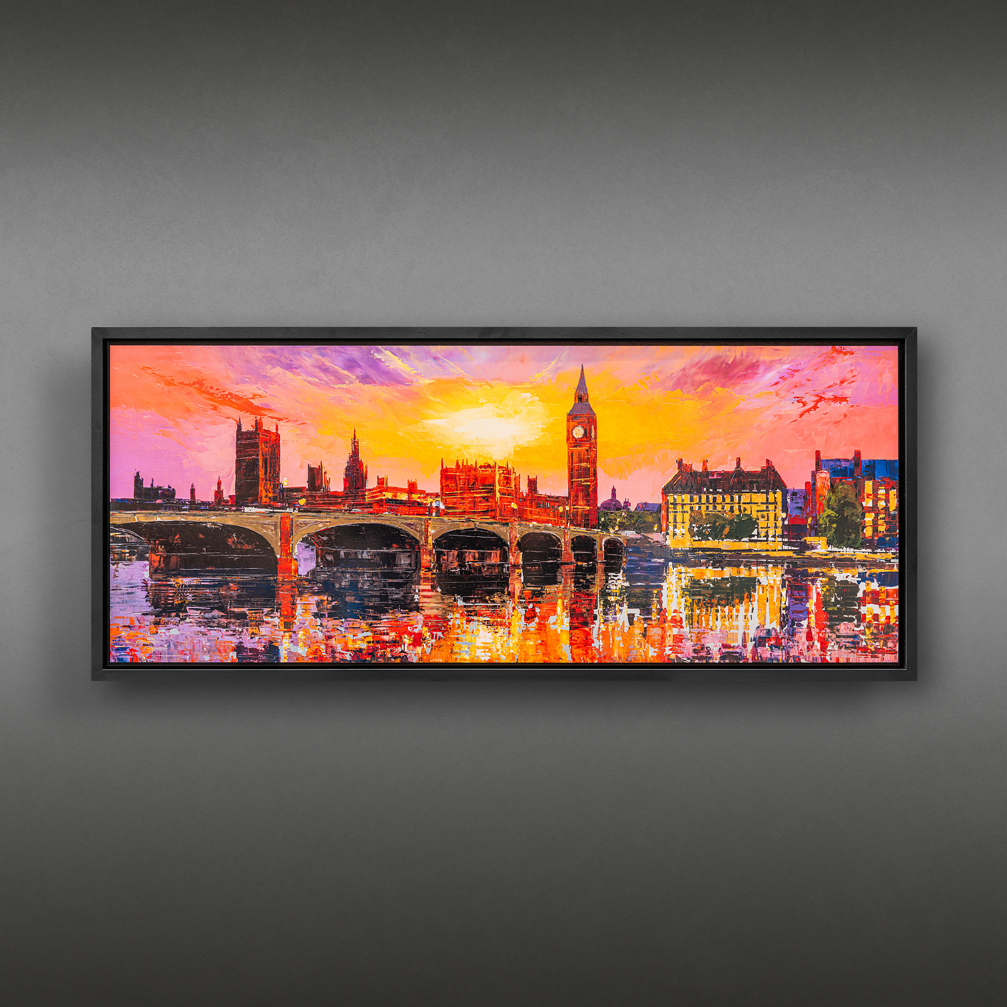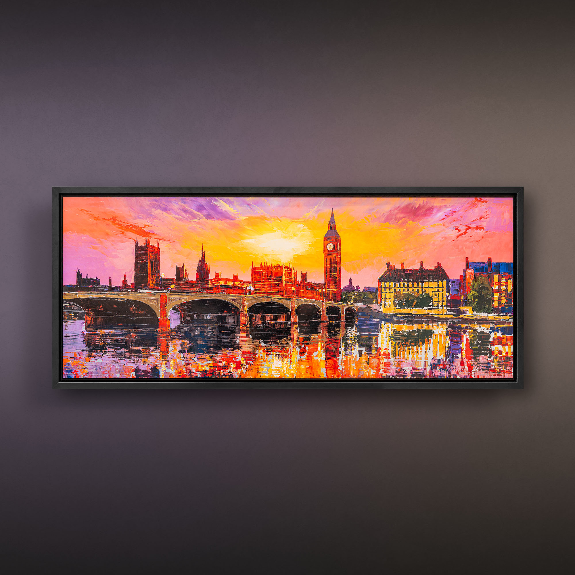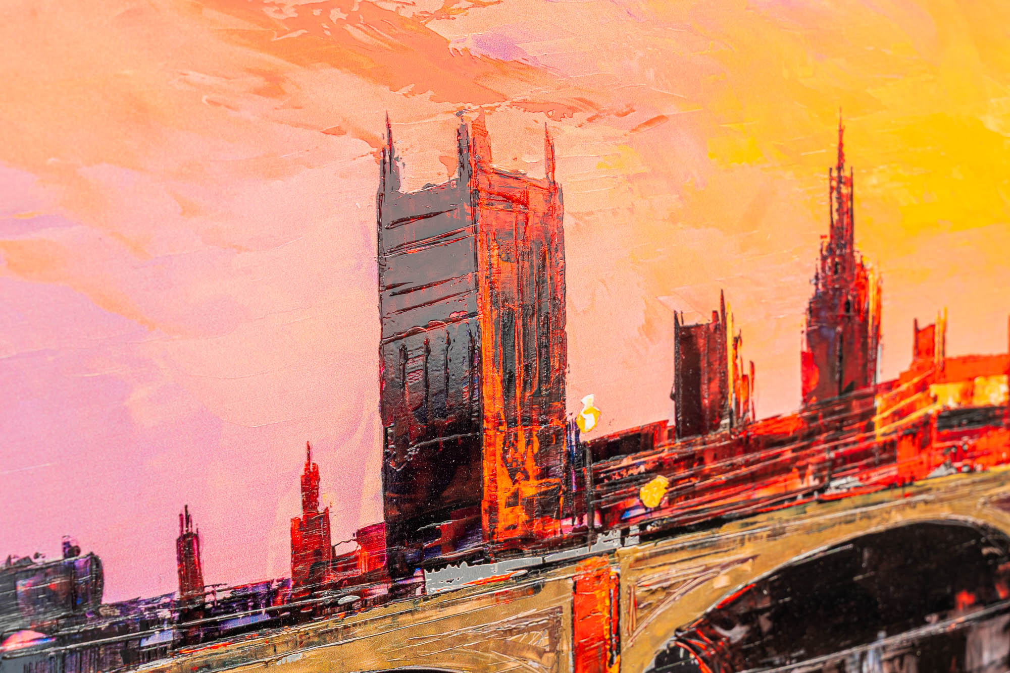 A London skyline set alight in colour, where sunset turns to spectacle and the Thames answers in reflection. Fiery reds and incandescent golds collide with cooler shadows, creating depth and rhythm across the bridge and skyline. The embellished surface intensifies the light, giving the impression that the city itself is radiating heat and motion.