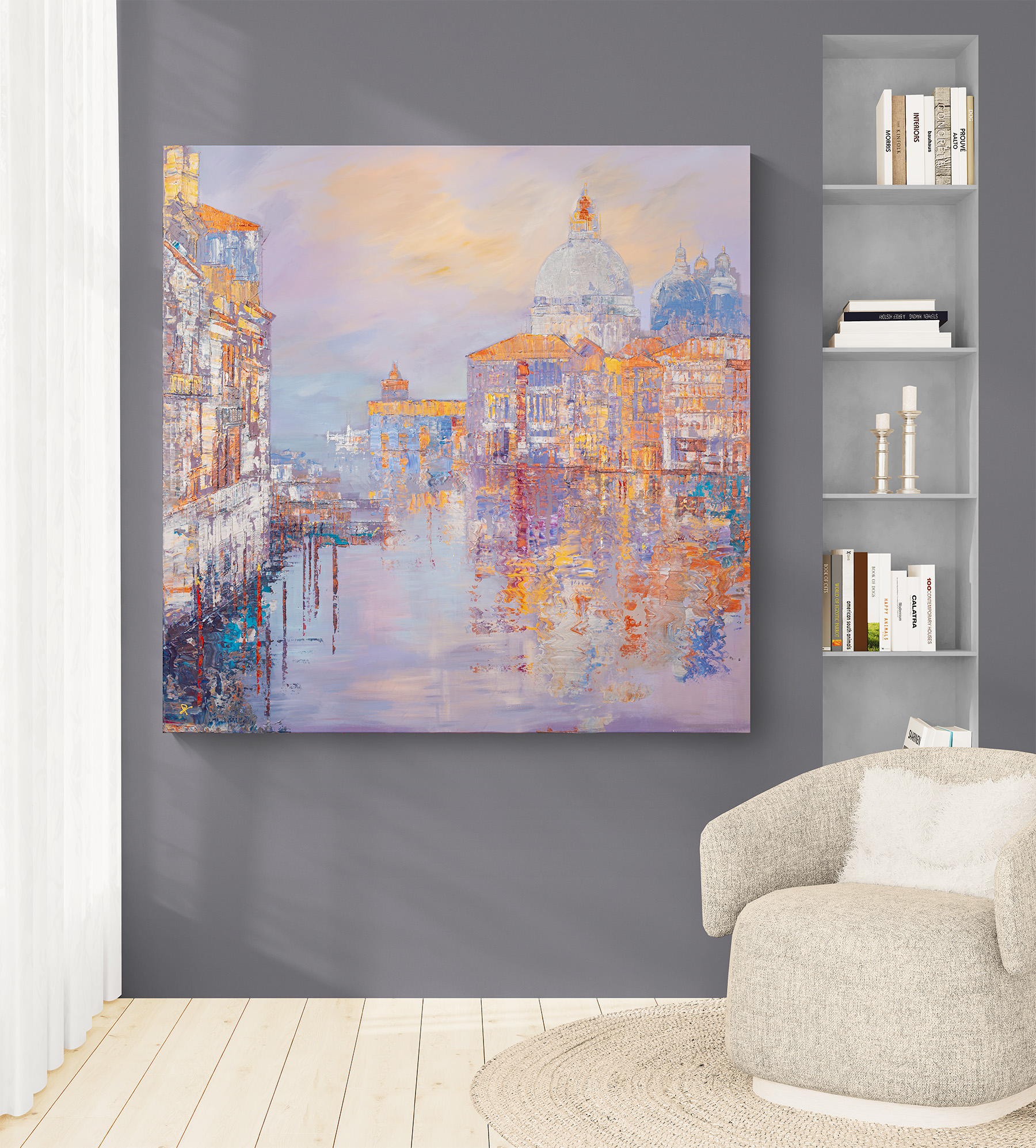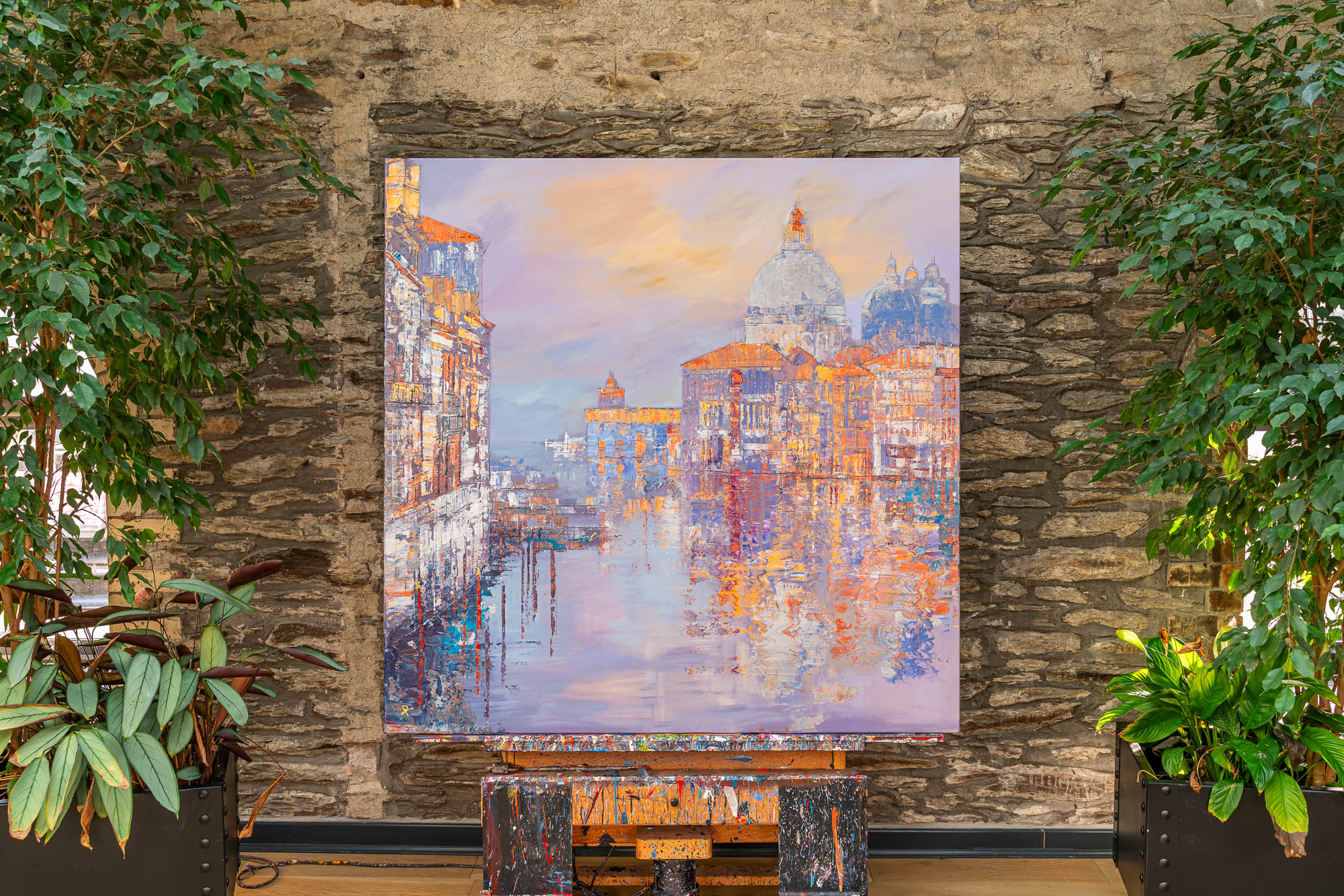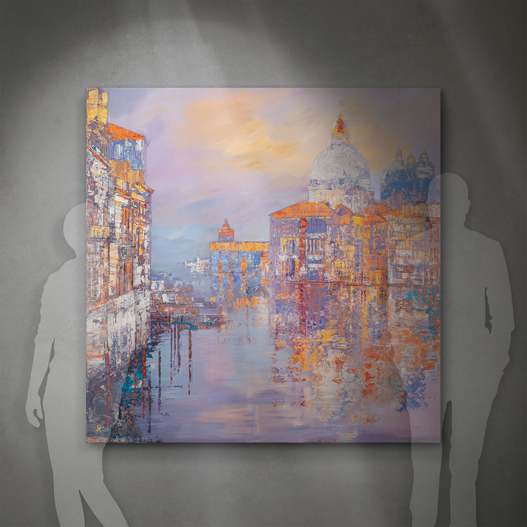 152.5 x 152.5 cm | 60 x 60 in [media]. A richly textured Venetian scene with gold, silver, and copper highlights shimmering across the water and architecture.. International Cityscape Contemporary Art Original Painting by Contemporary Cityscape Artist Paul Kenton. Available to Purchase.