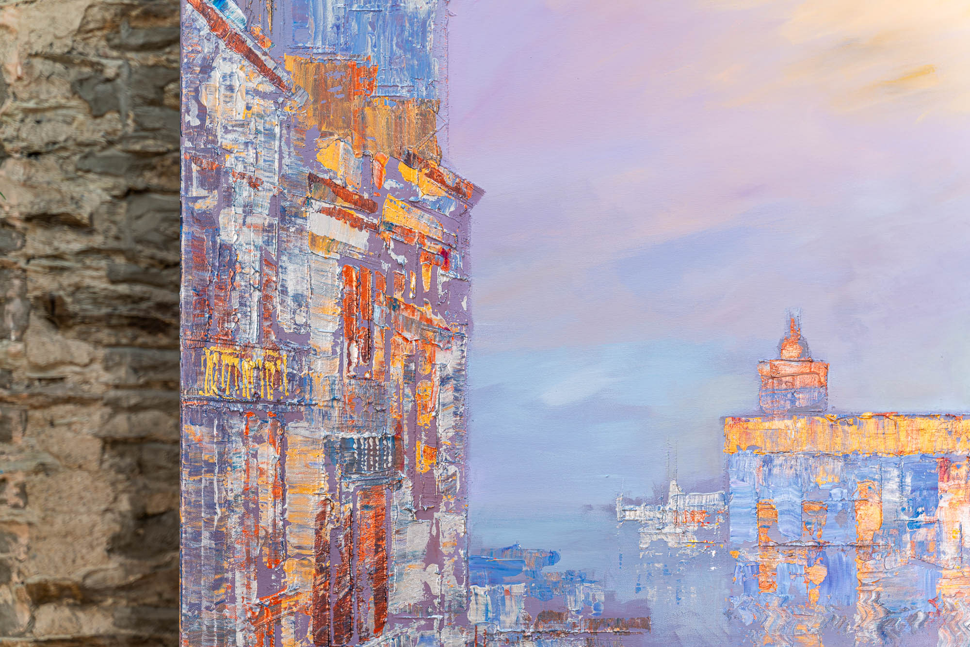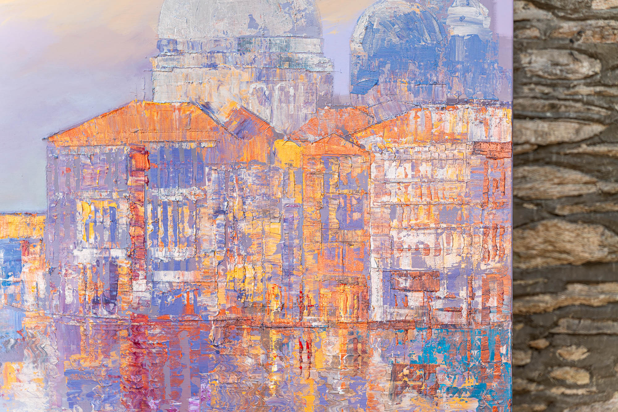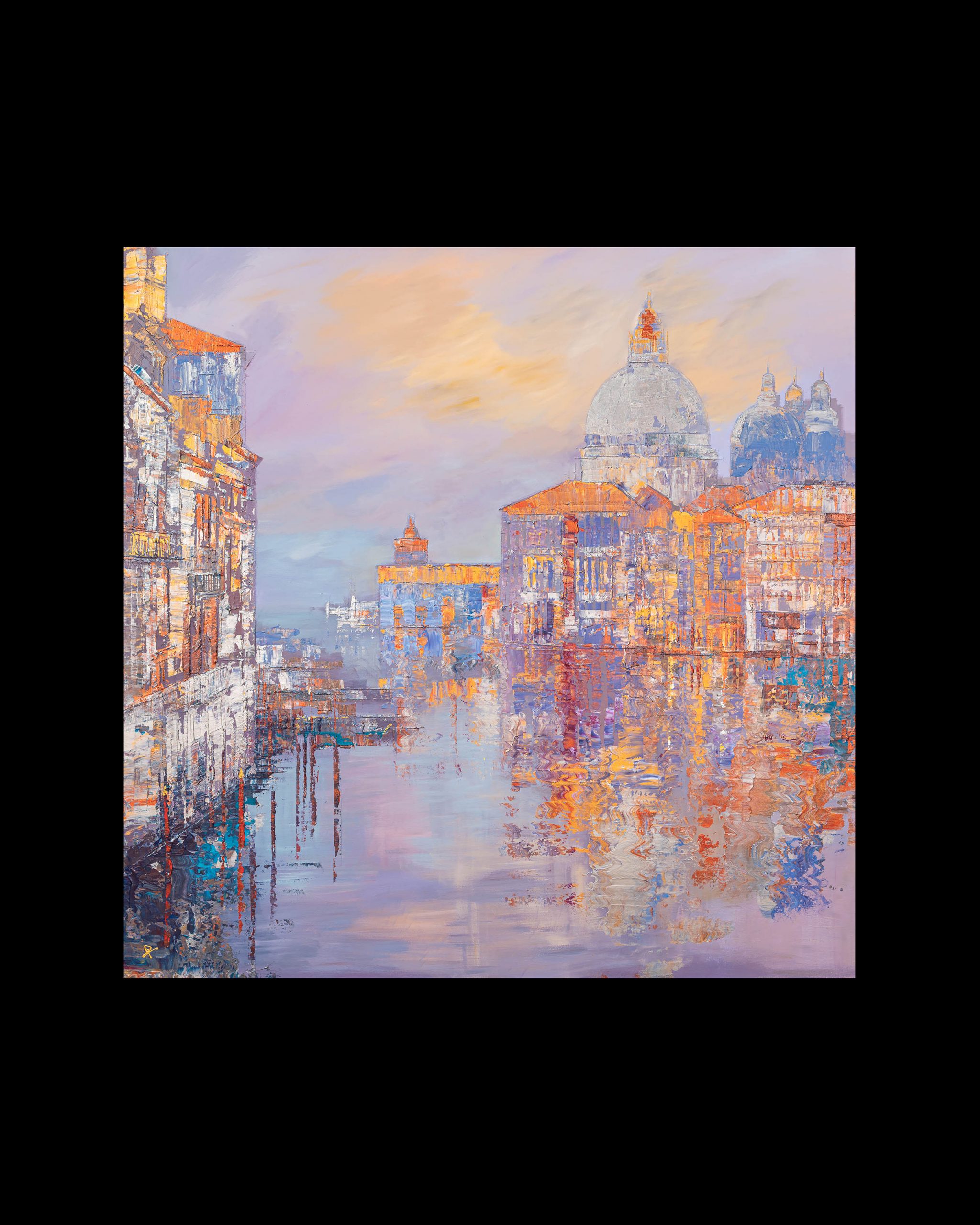 A glowing vision of Venice unfolds in shifting metallics and soft pastel tones. Paul’s thick impasto technique threads gold, silver, and copper highlights through the scene, bringing depth to the domes and canal-side architecture. Gentle rippling reflections drift across the lagoon, blending lavender, peach, and opalescent light into a calm, atmospheric cityscape.