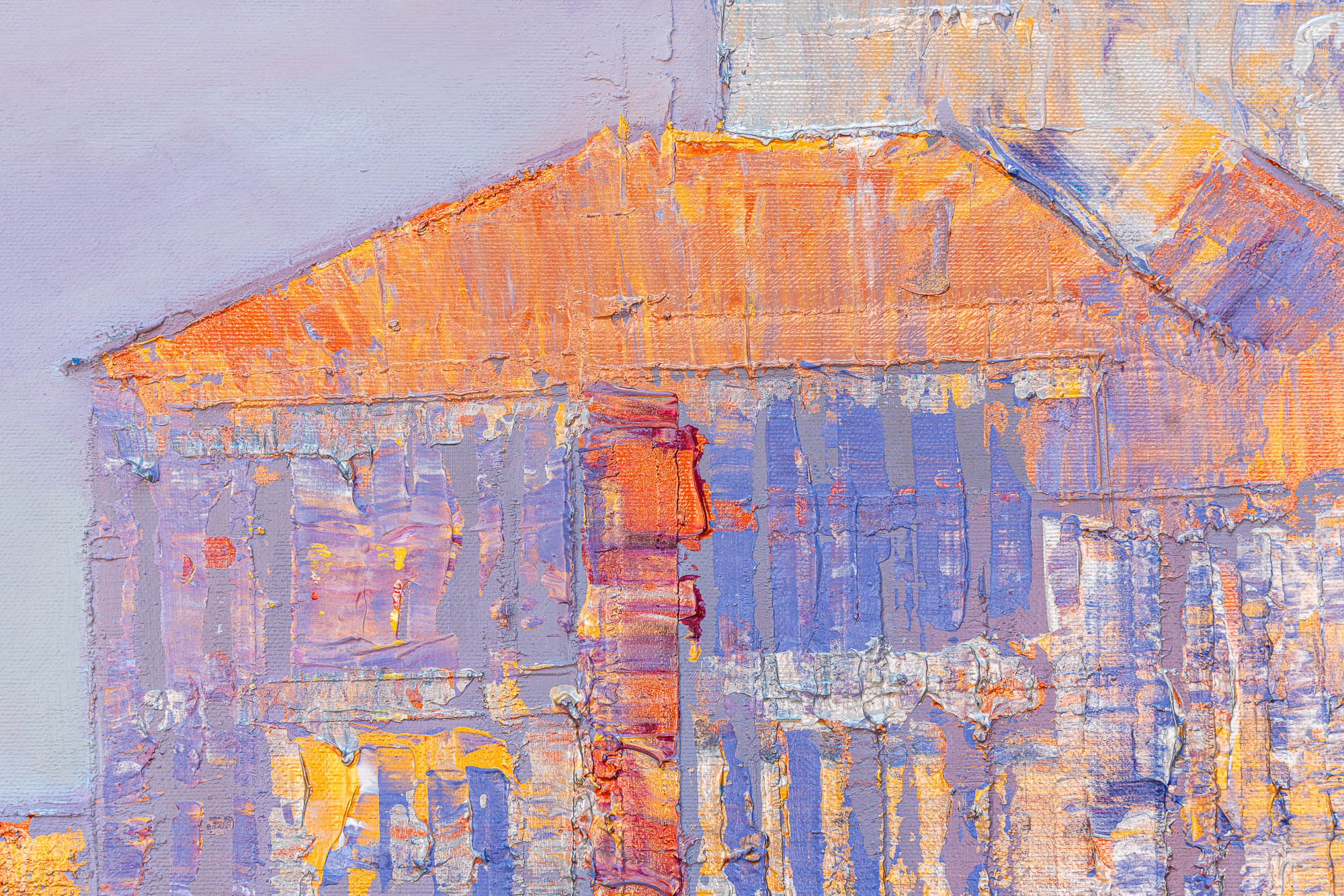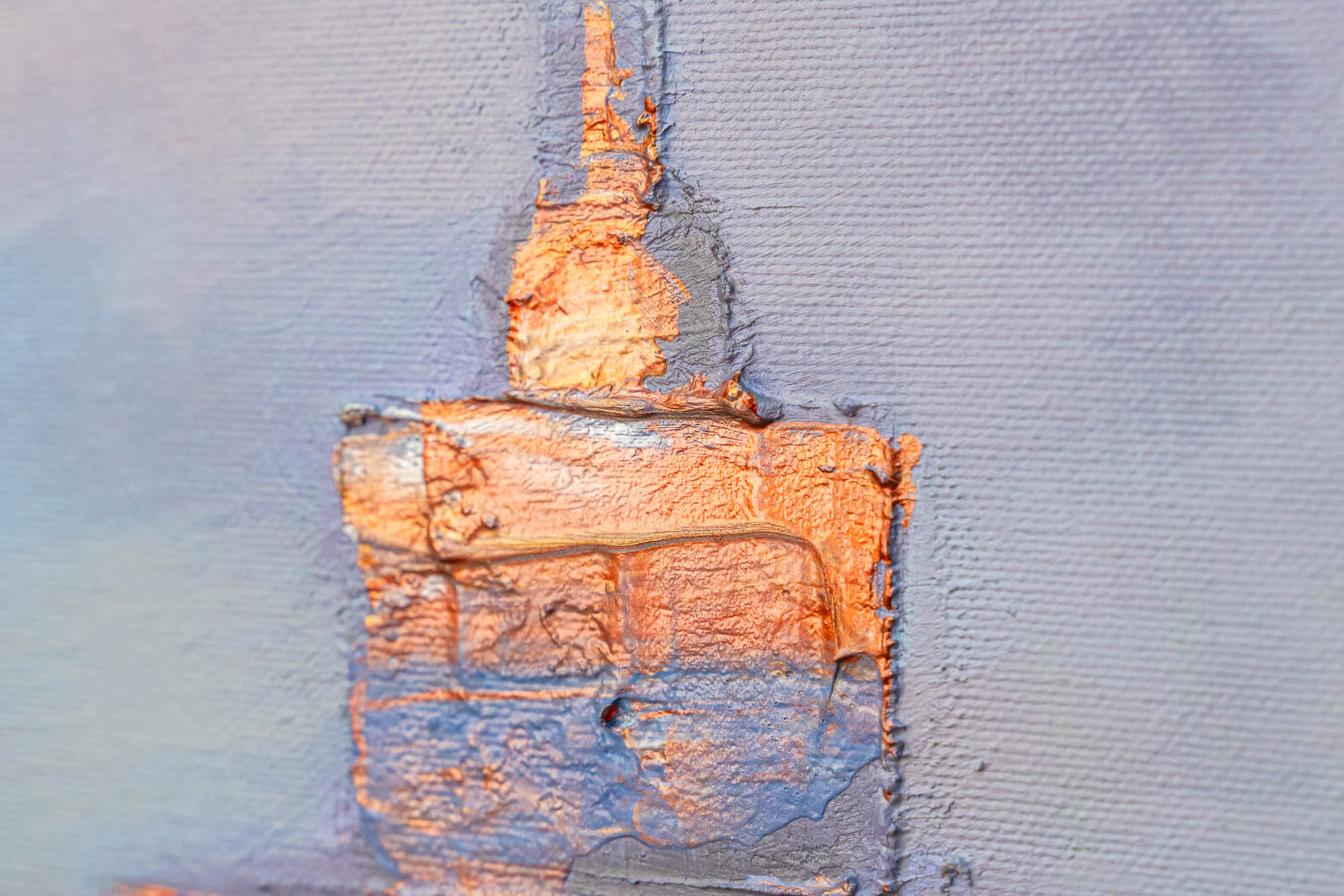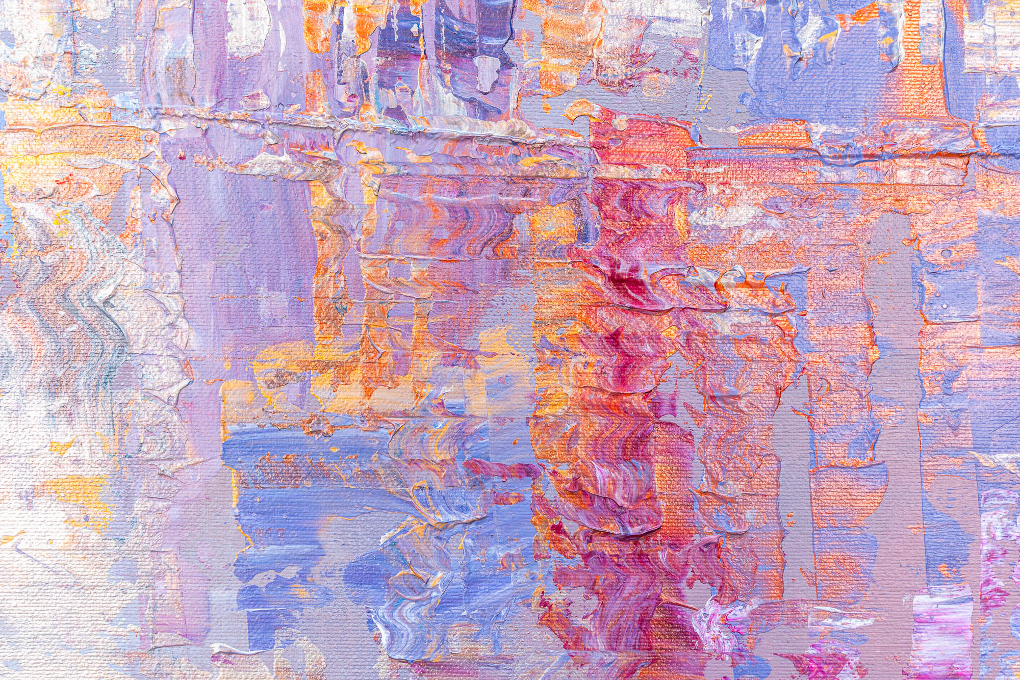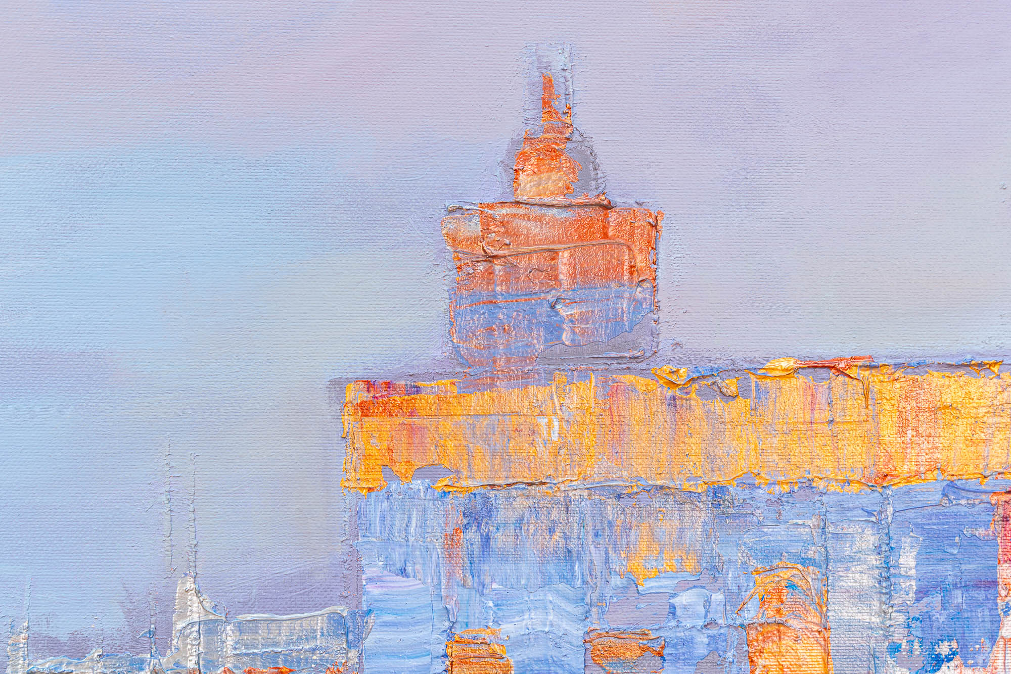 A glowing vision of Venice unfolds in shifting metallics and soft pastel tones. Paul’s thick impasto technique threads gold, silver, and copper highlights through the scene, bringing depth to the domes and canal-side architecture. Gentle rippling reflections drift across the lagoon, blending lavender, peach, and opalescent light into a calm, atmospheric cityscape.