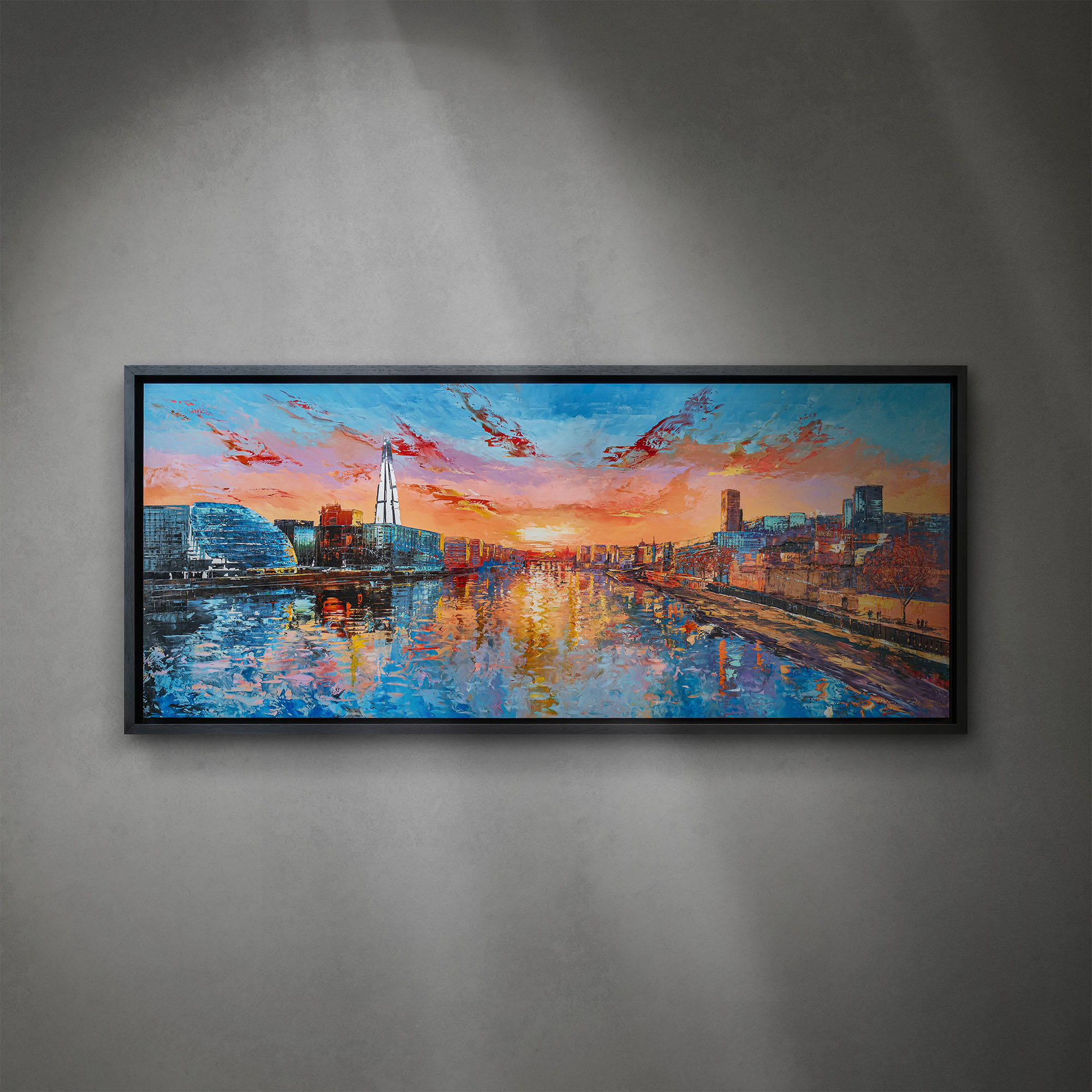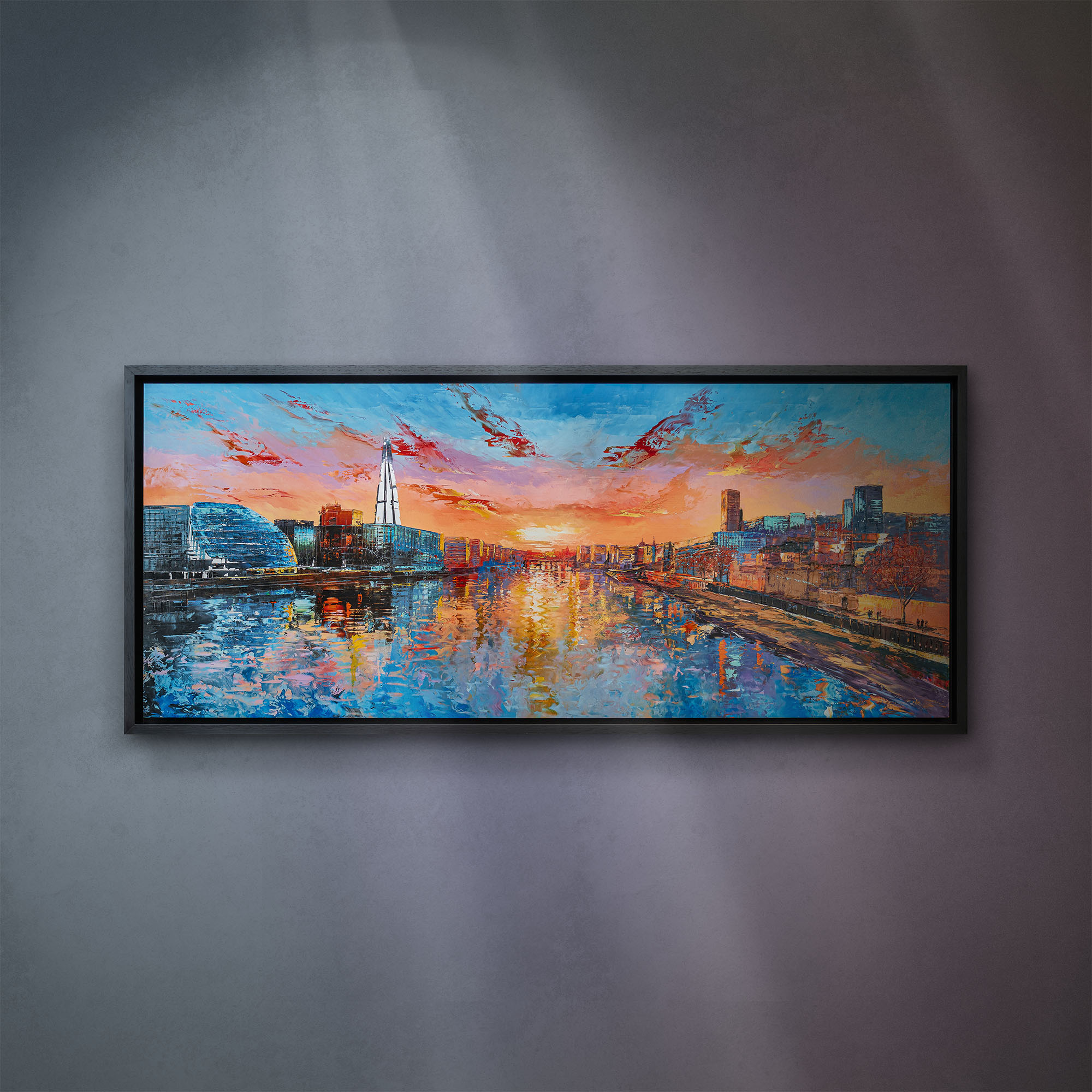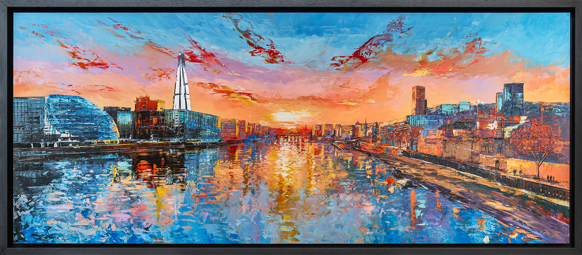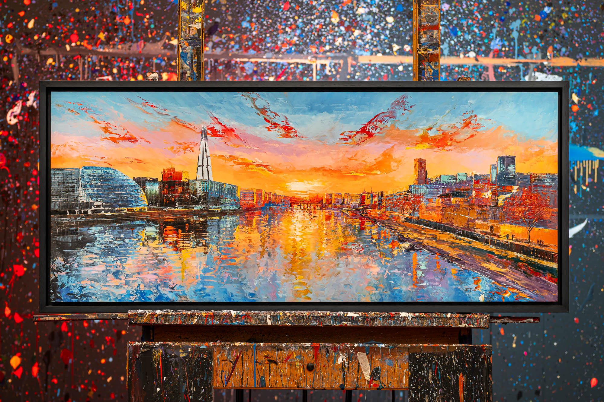 58 x 140 cm | 22.75 x 55 in [media]. Panoramic Glow” - an embellished giclée print on aluminium by Paul Kenton, limited to 195 editions, celebrating London’s skyline bathed in sunset light.. London Contemporary Art Original Painting by Contemporary Cityscape Artist Paul Kenton. Available to Purchase.