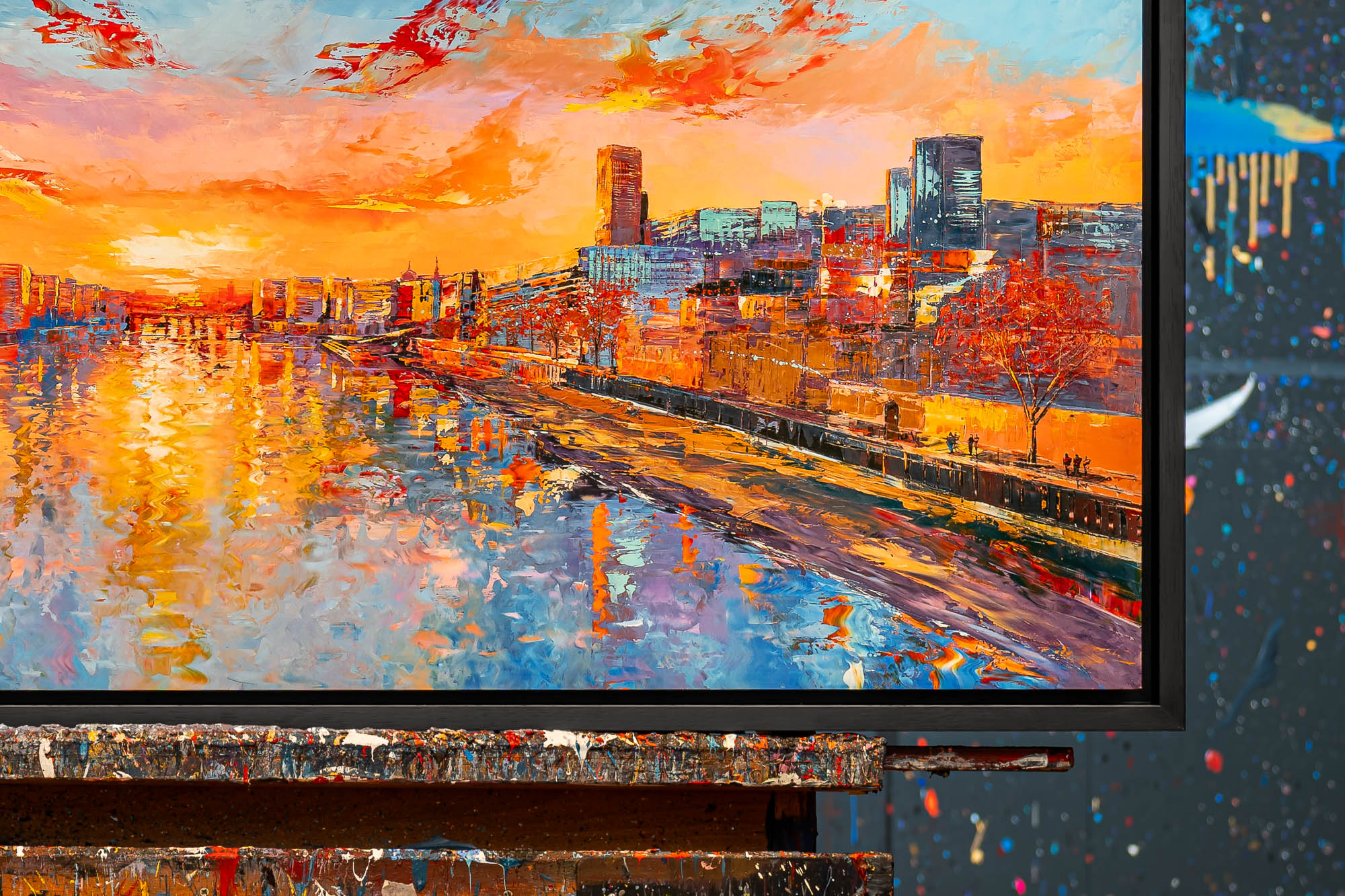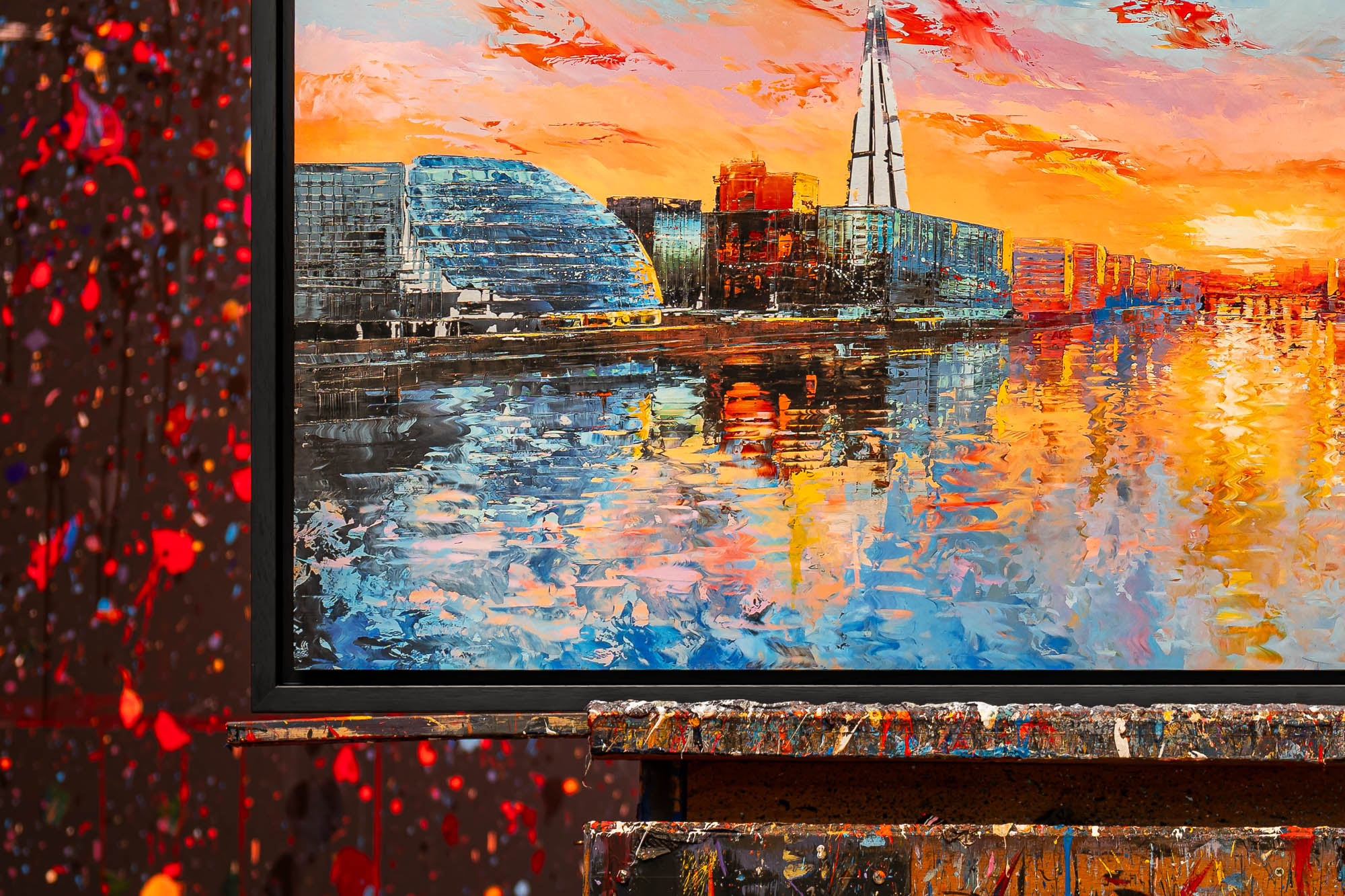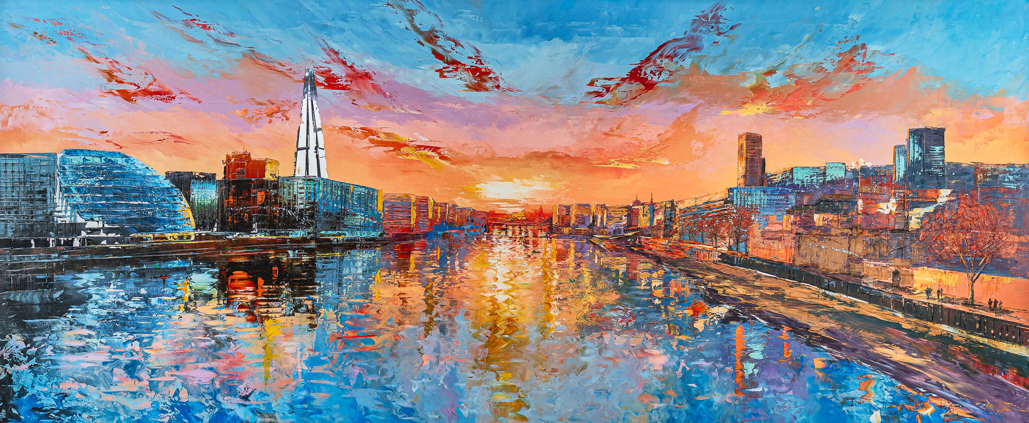 “Panoramic Glow” is a sweeping, widescreen vision of London bathed in soft evening light. Spanning the breadth of the Thames, the scene captures everything from Tower Bridge in the distance to the curve of City Hall and the rise of The Shard. Painted in mixed media on aluminium, the surface plays an active role in the composition. Exposed raw metal in key architectural elements allows natural highlights to shimmer through. These reflective touches catch and respond to ambient light, bringing an added sense of atmosphere to the scene and echoing the way the city itself glows as day begins to fade.