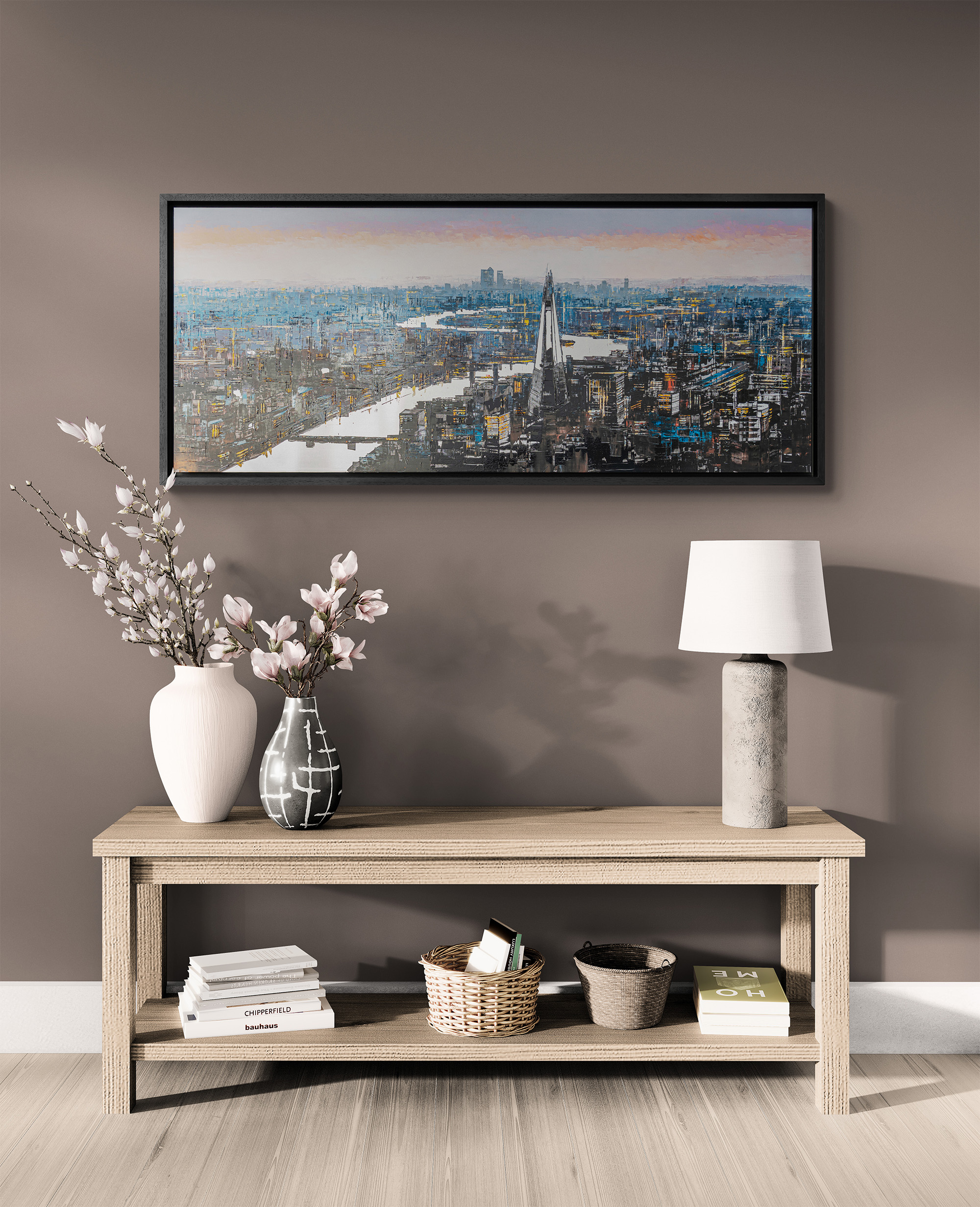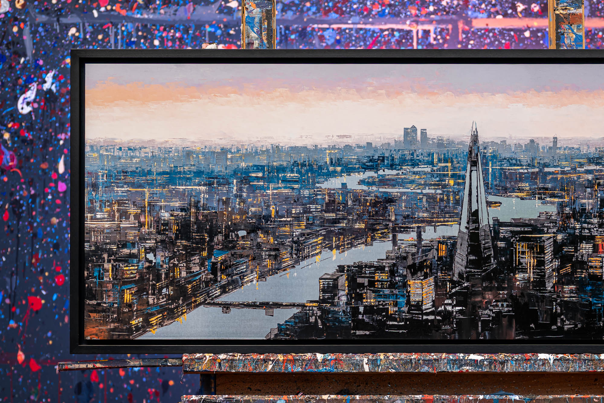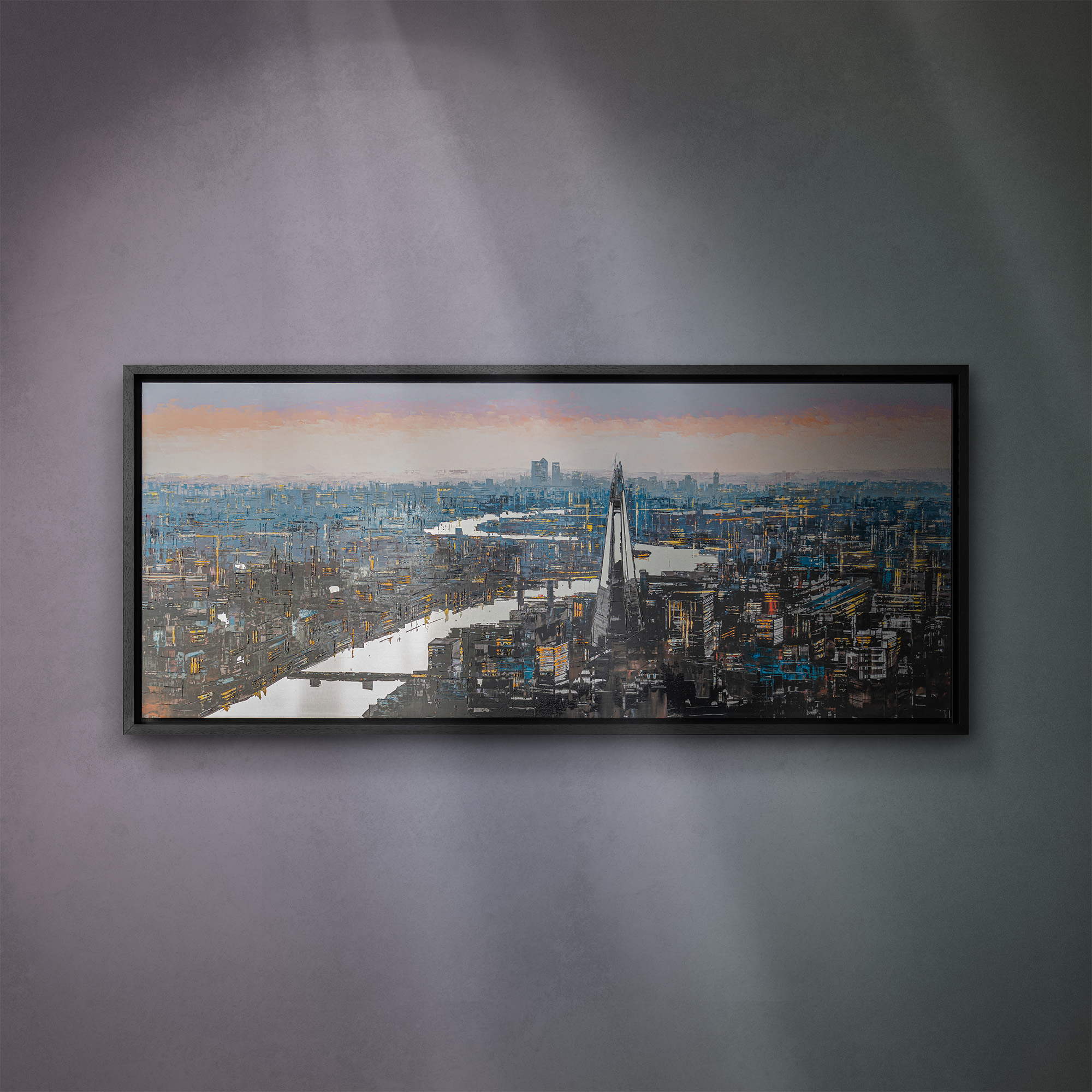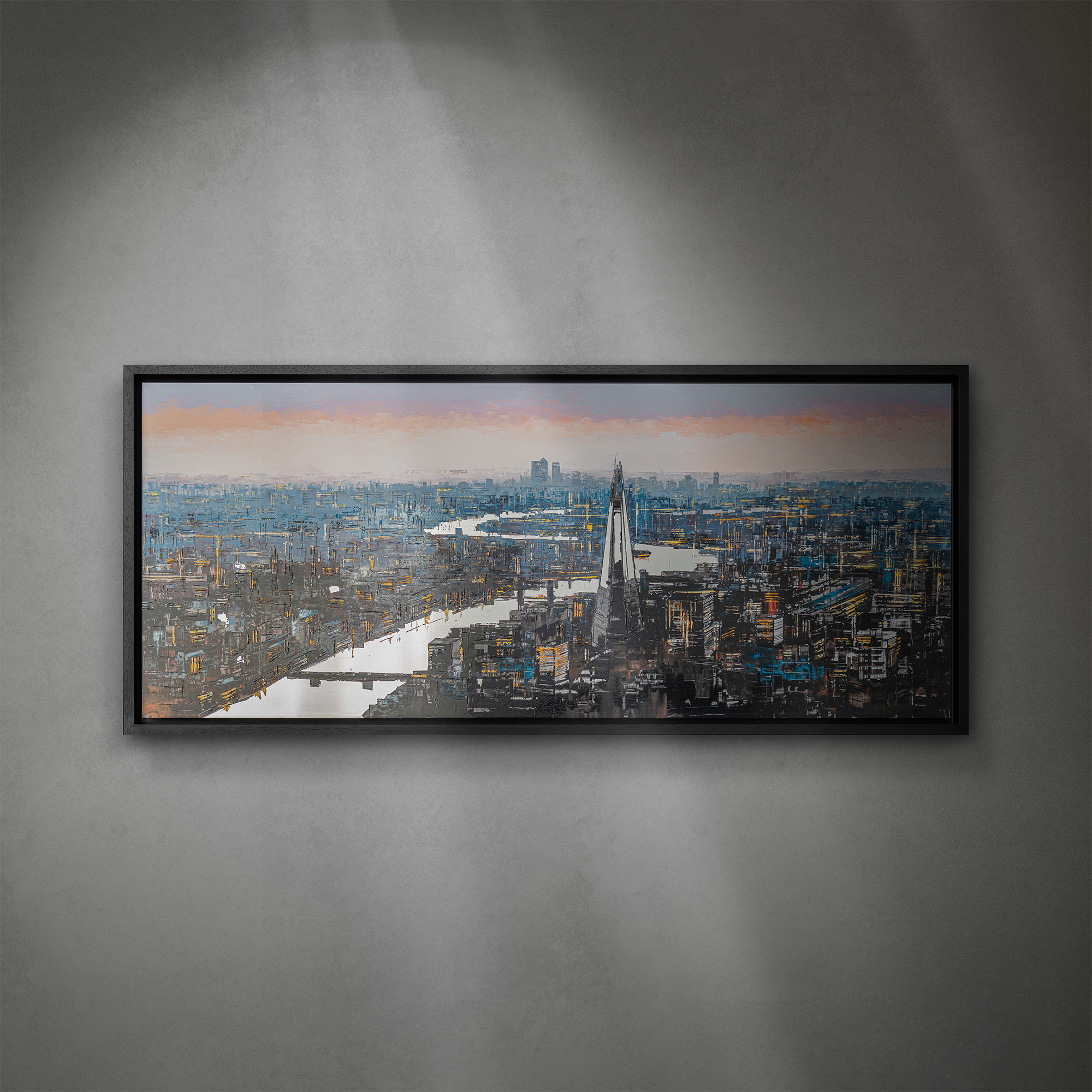 “Vista Reflections” presents a broad, elevated view across London as twilight settles over the city. From this vantage point, the Thames winds calmly through silhouetted landmarks, while soft light catches the rooftops and riverbanks below. Originally painted in mixed media on aluminium, the surface plays a subtle yet powerful role in the mood of the piece. Matching the Original, in this Limited Edition Print exposed areas of metal use the raw material to define the river and sharpen architectural details. The palette is cool, drawing on blues, greys and mauves, with metallic accents shimmering like distant lights on water. Vista Reflections invites the viewer to pause and take in the scope, not just of London’s form, but of its emotional tone at day’s end.