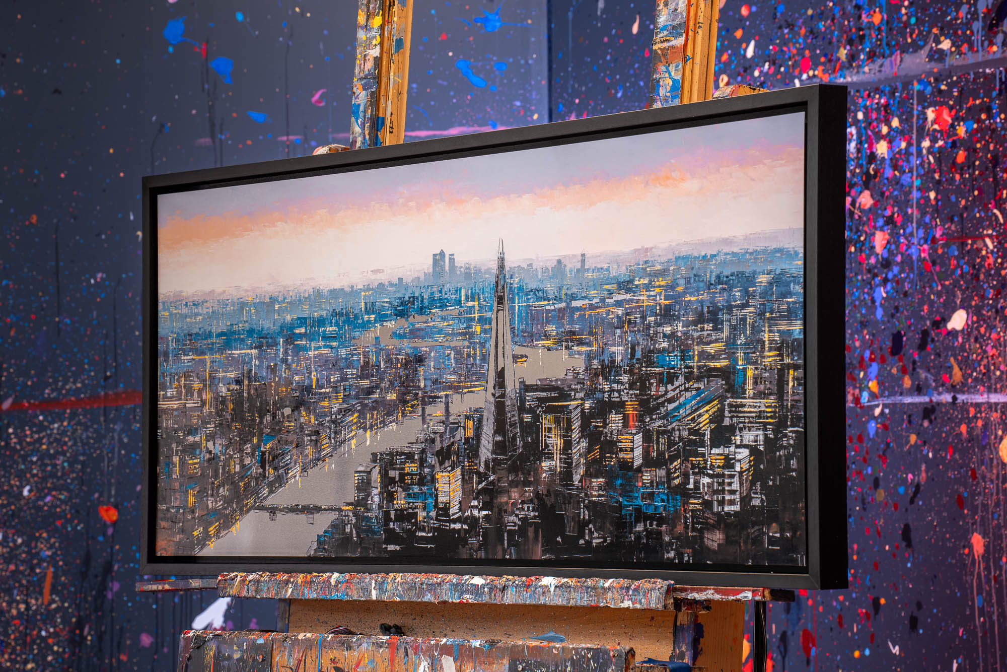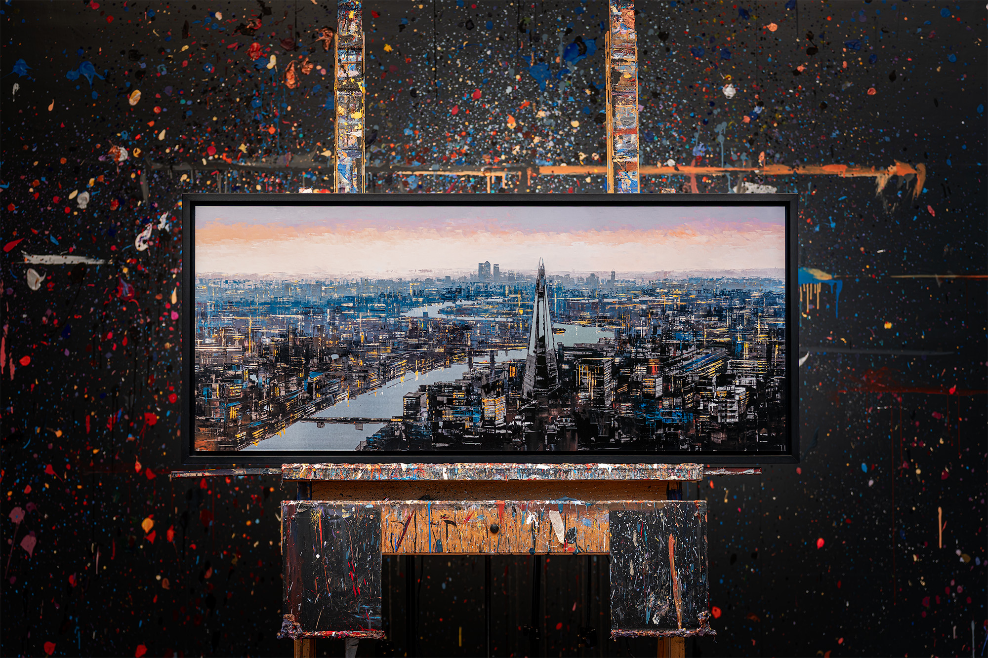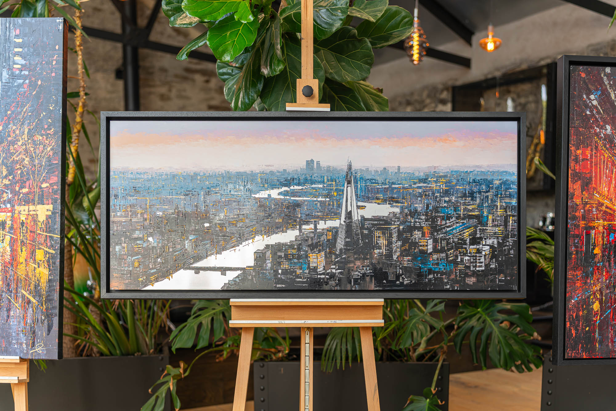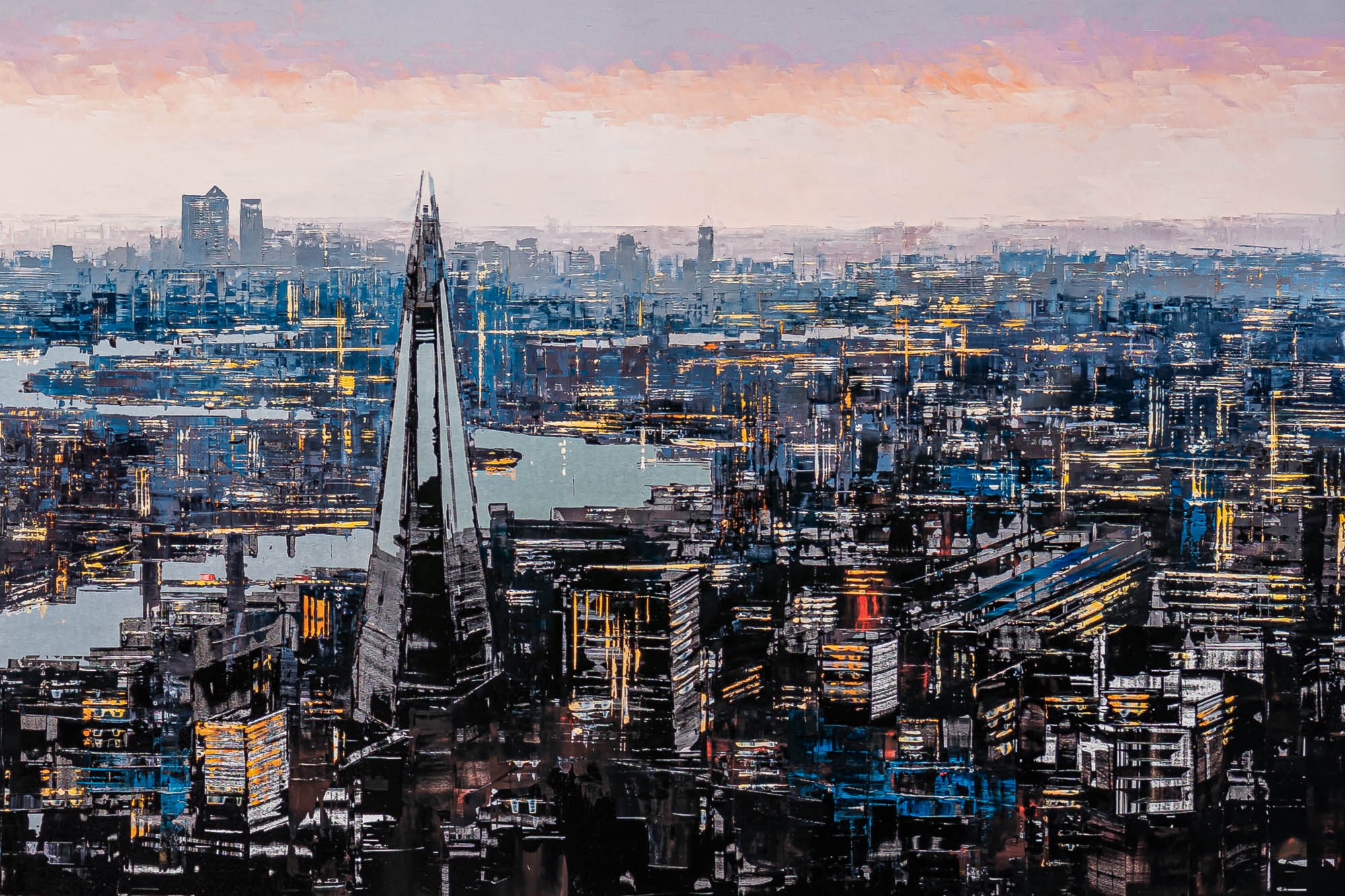 “Vista Reflections” presents a broad, elevated view across London as twilight settles over the city. From this vantage point, the Thames winds calmly through silhouetted landmarks, while soft light catches the rooftops and riverbanks below. Originally painted in mixed media on aluminium, the surface plays a subtle yet powerful role in the mood of the piece. Matching the Original, in this Limited Edition Print exposed areas of metal use the raw material to define the river and sharpen architectural details. The palette is cool, drawing on blues, greys and mauves, with metallic accents shimmering like distant lights on water. Vista Reflections invites the viewer to pause and take in the scope, not just of London’s form, but of its emotional tone at day’s end.