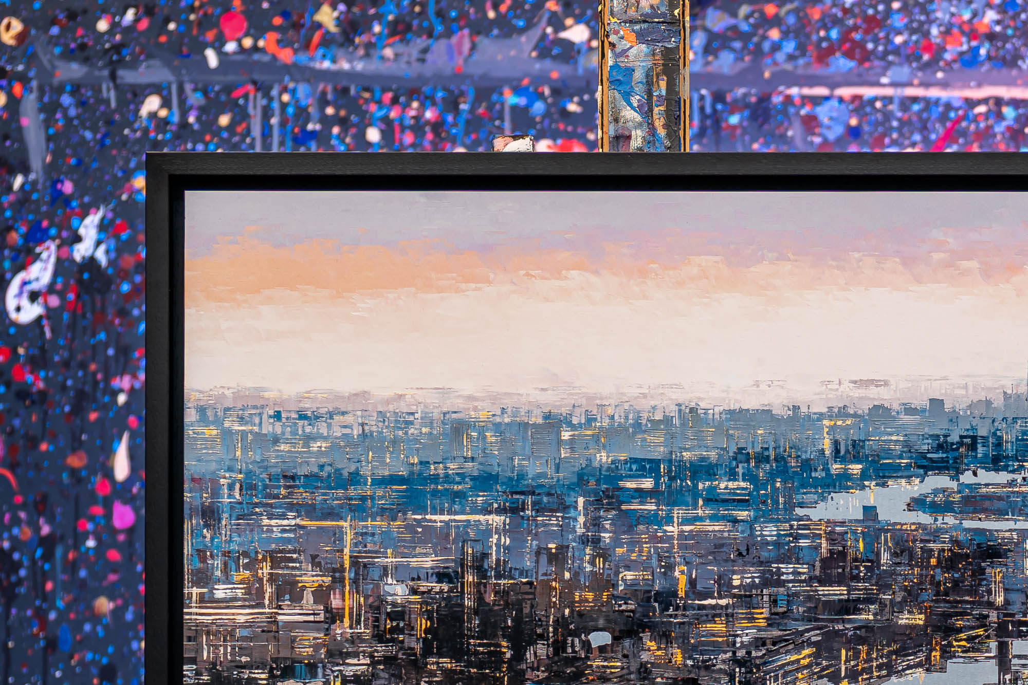 “Vista Reflections” is an Limited Edition Print of a London Cityscape Painting by Paul Kenton. Vista Reflections” – an embellished giclée print on aluminium by Paul Kenton, limited to 195 editions, of an expansive London cityscape in cool tones, reflecting the soft light and calm of dusk.