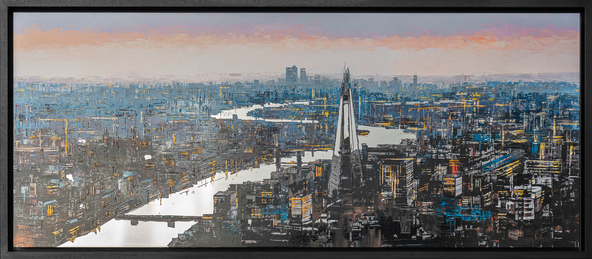 58 x 140 cm | 22.75 x 55 in [media]. Vista Reflections” - an embellished giclée print on aluminium by Paul Kenton, limited to 195 editions, of an expansive London cityscape in cool tones, reflecting the soft light and calm of dusk.. London Contemporary Art Original Painting by Contemporary Cityscape Artist Paul Kenton. Available to Purchase.