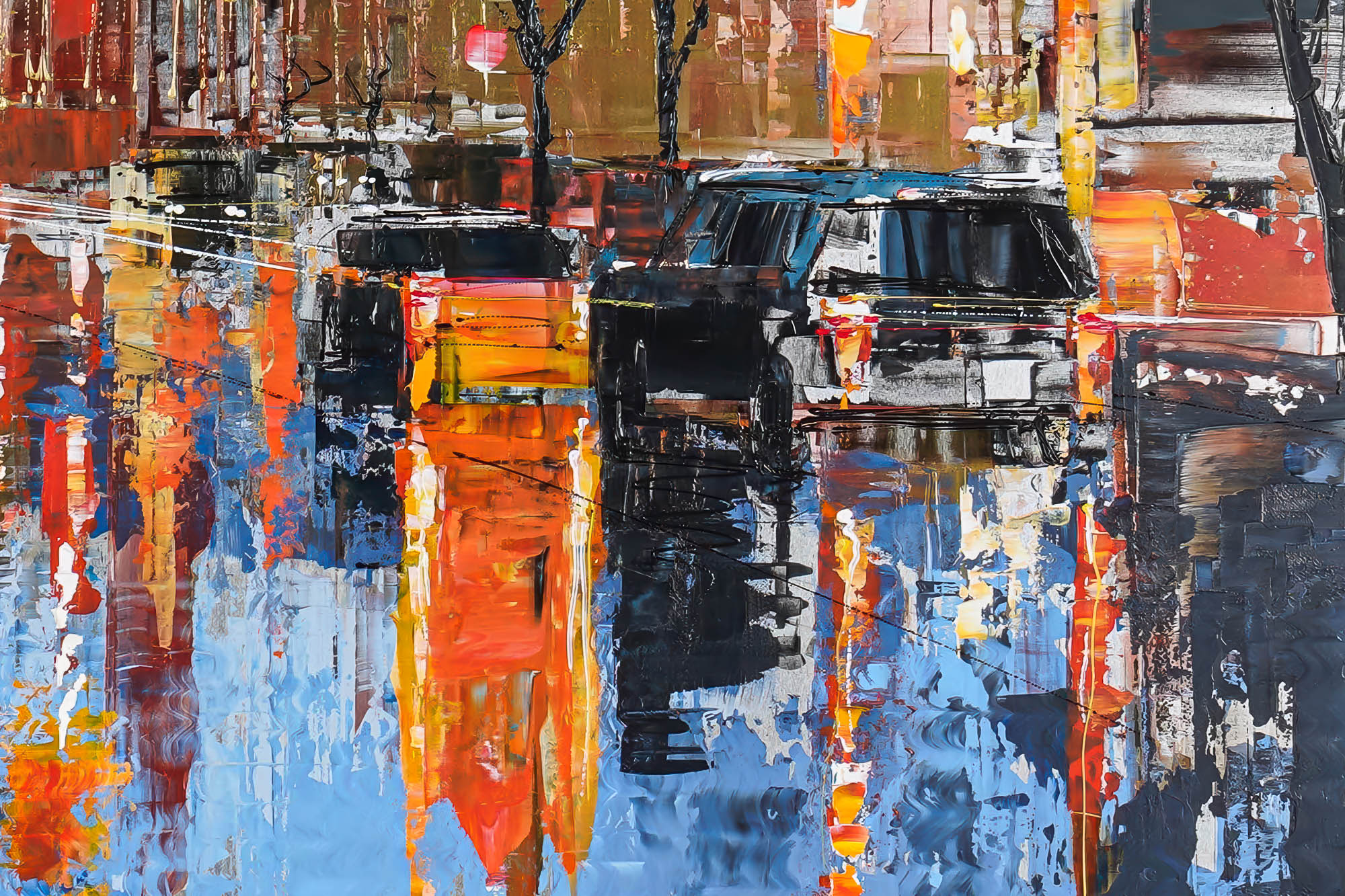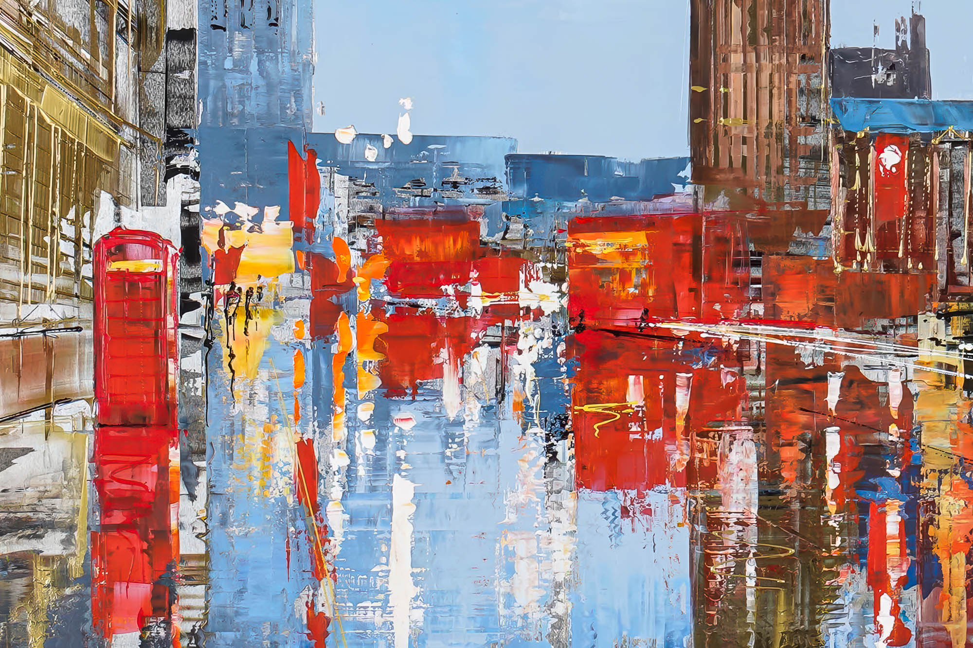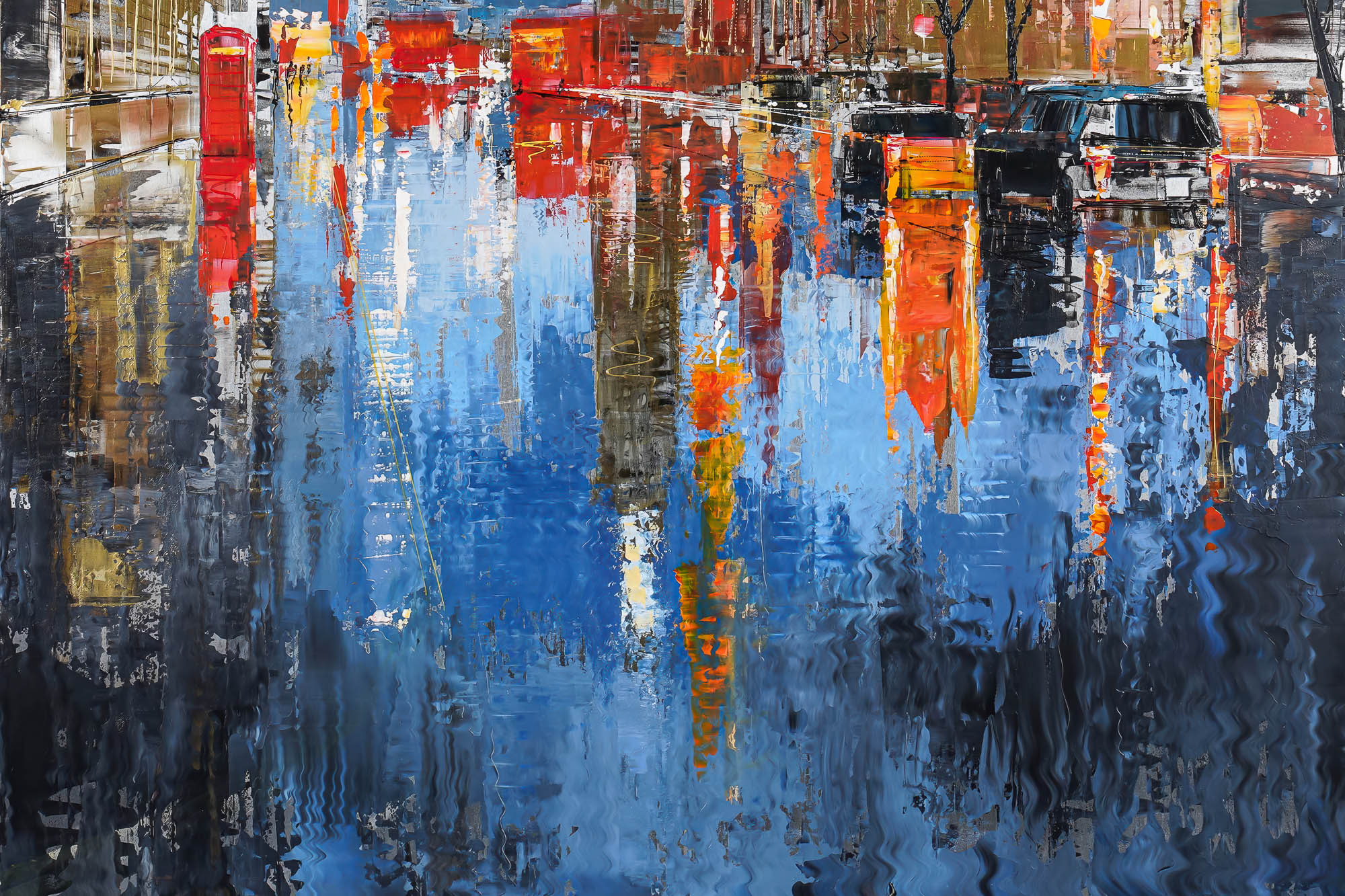 68 x 55 cm | 26.75 x 21.75 in [media]. An evocative London evening scene where reflections and light bring Westminster to life.. London Contemporary Art Original Painting by Contemporary Cityscape Artist Paul Kenton. Available to Purchase.