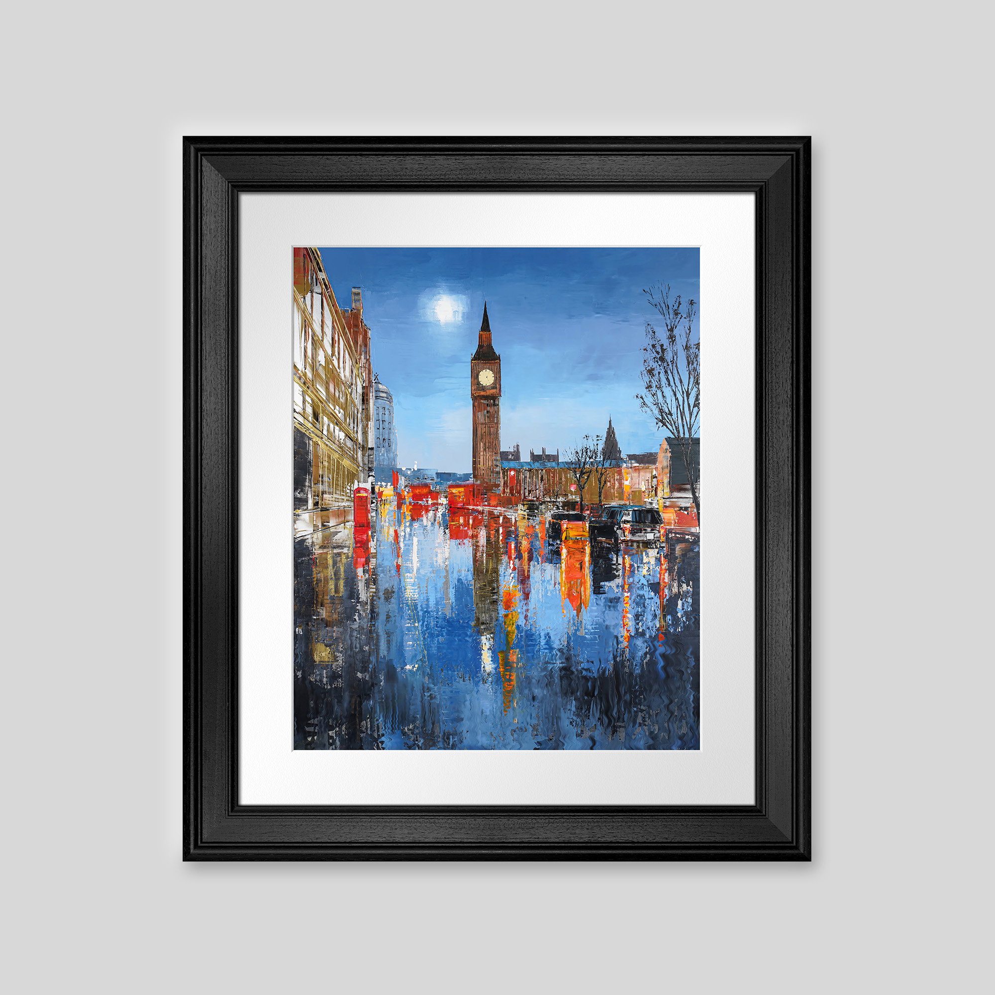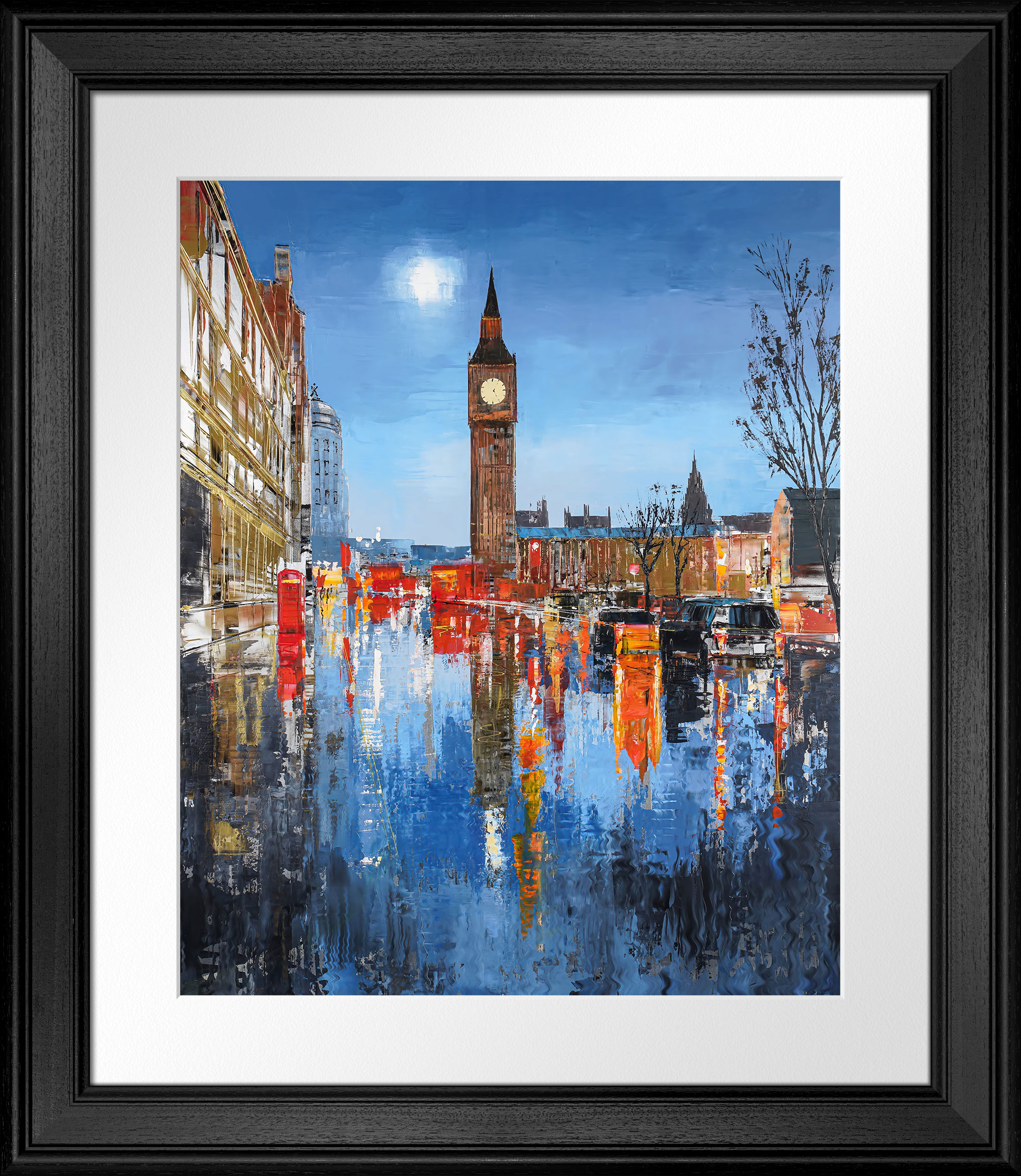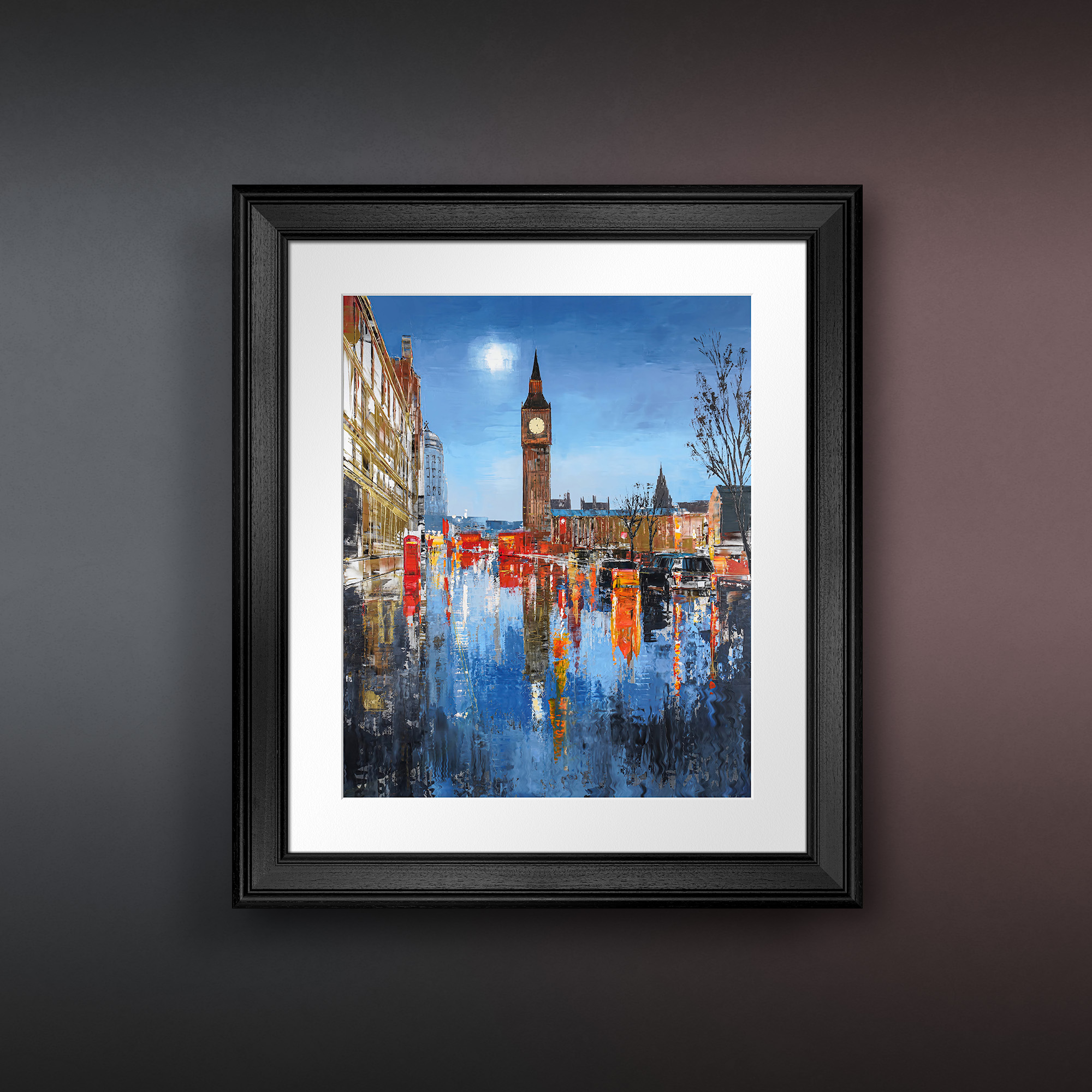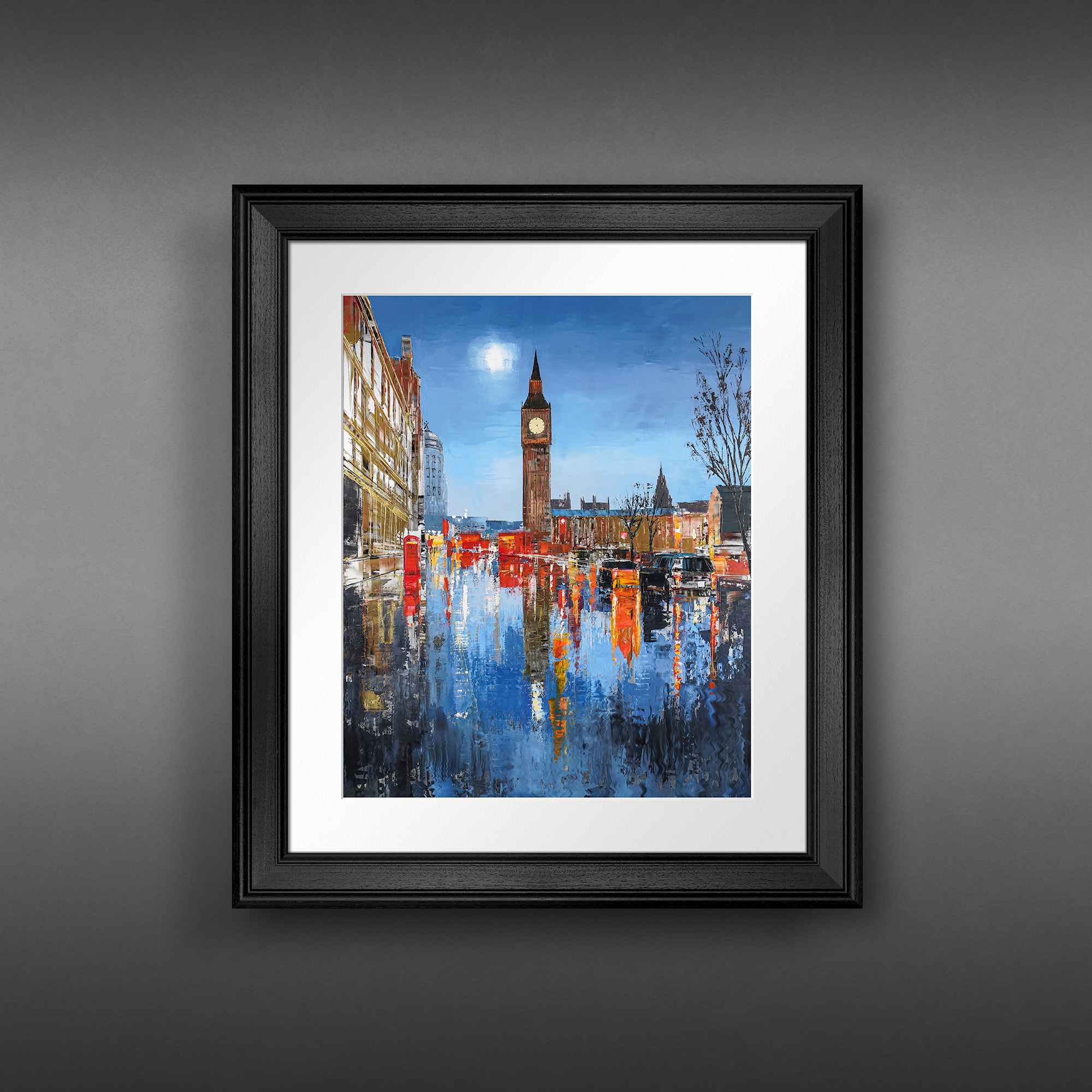 “Westminster Illuminates” is an Limited Edition Print of a London Cityscape Painting by Paul Kenton. An evocative London evening scene where reflections and light bring Westminster to life.