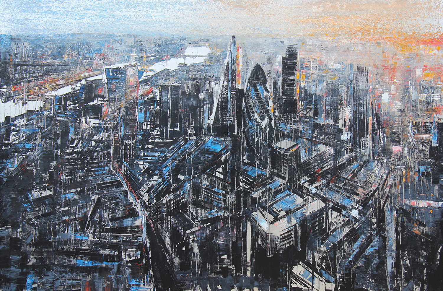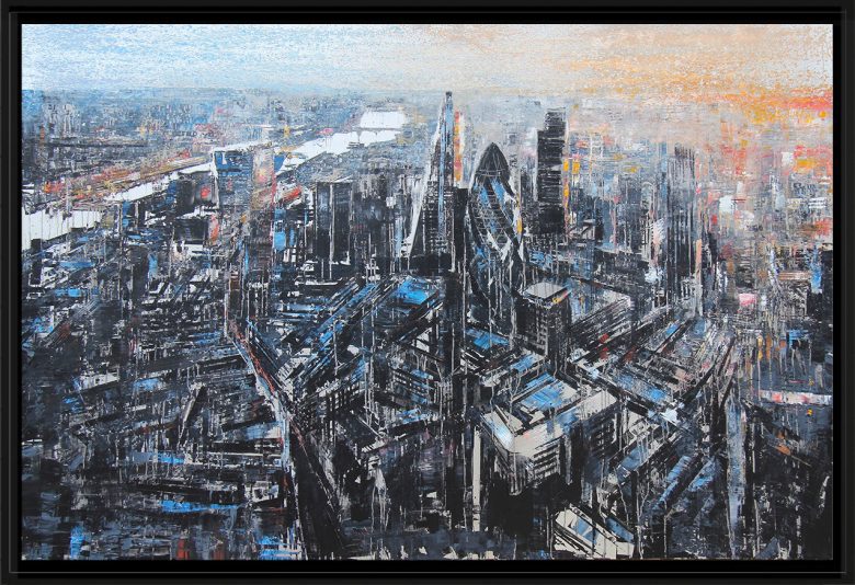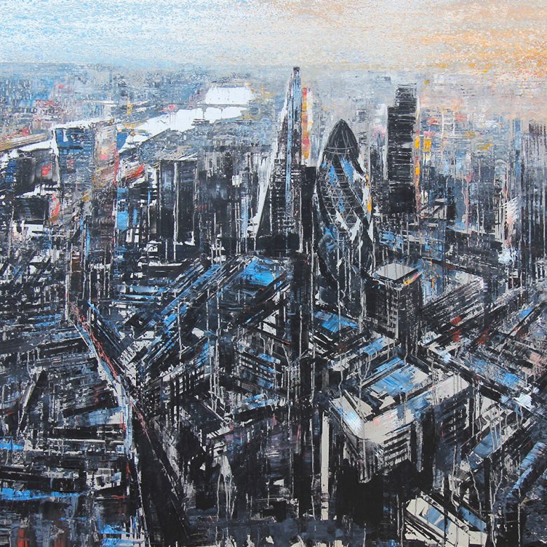This loosely-painted London cityscape allows the viewer to look down into the depths of the city and to the distance, where the sunset offers a moment of tranquillity.