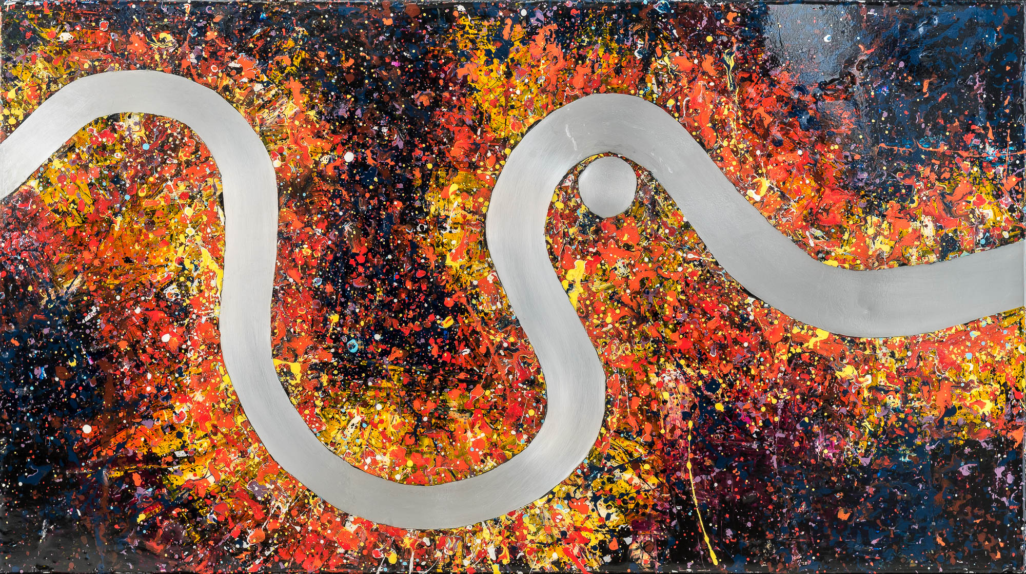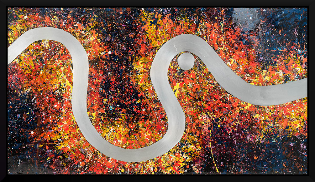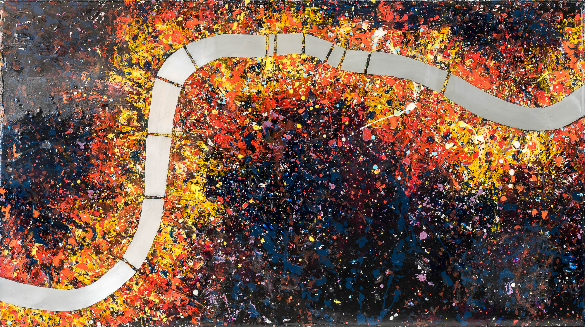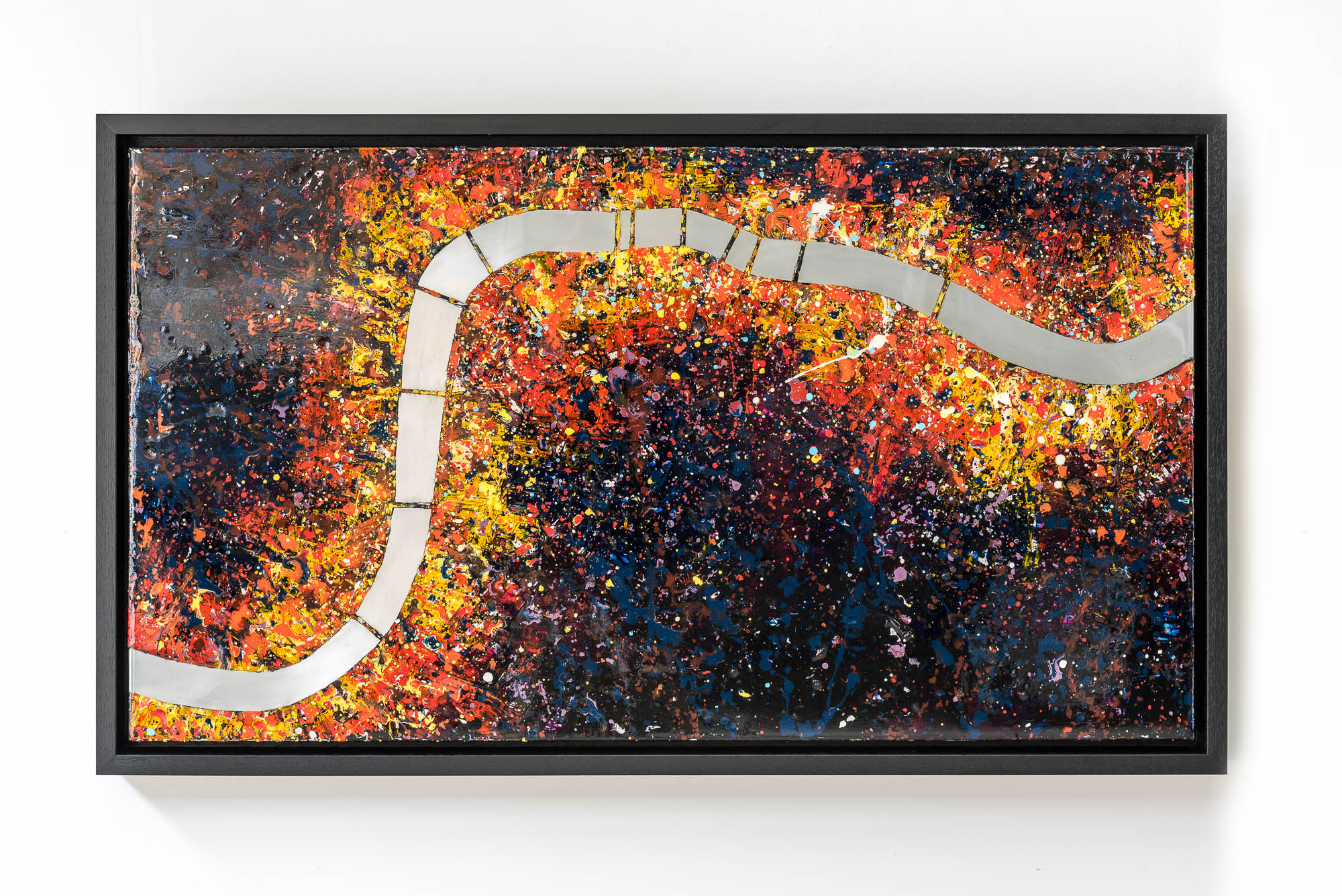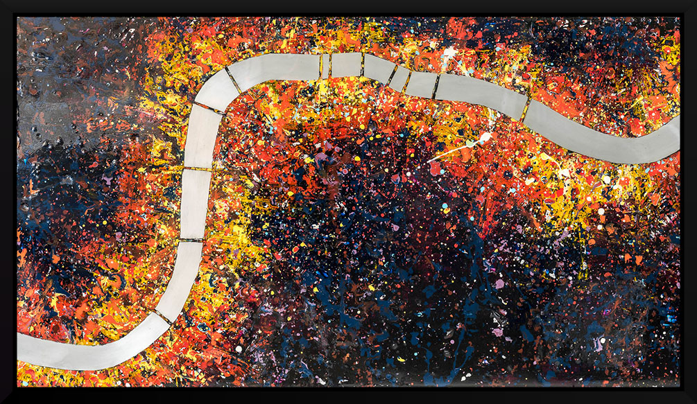 A gleaming aluminium Thames cuts a calm path through energetic splatters of vibrant paint, emulating the relentless melting pot of activity and movement within the capital.