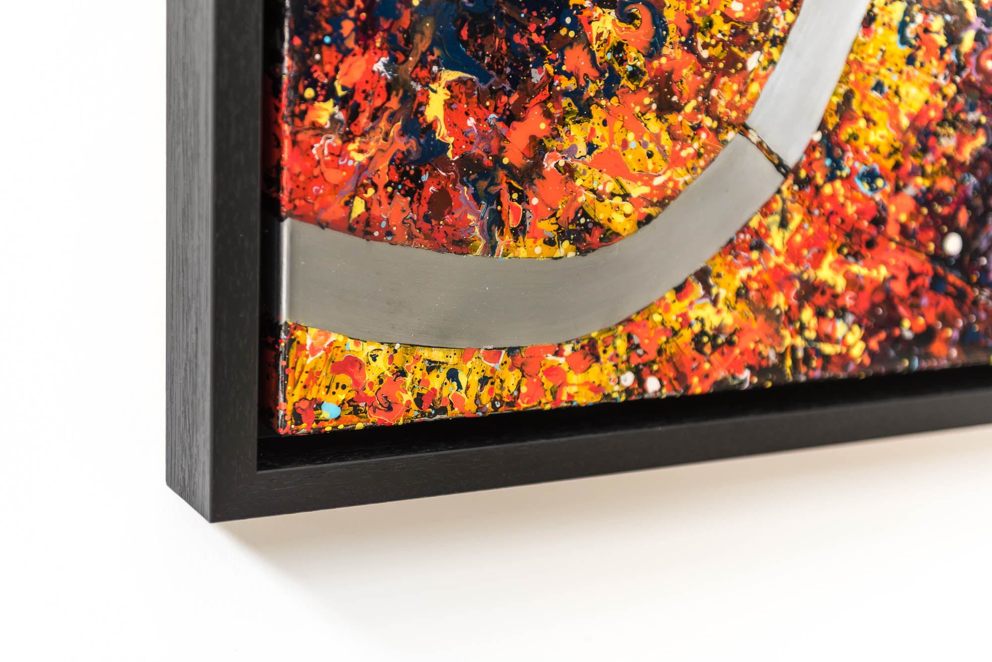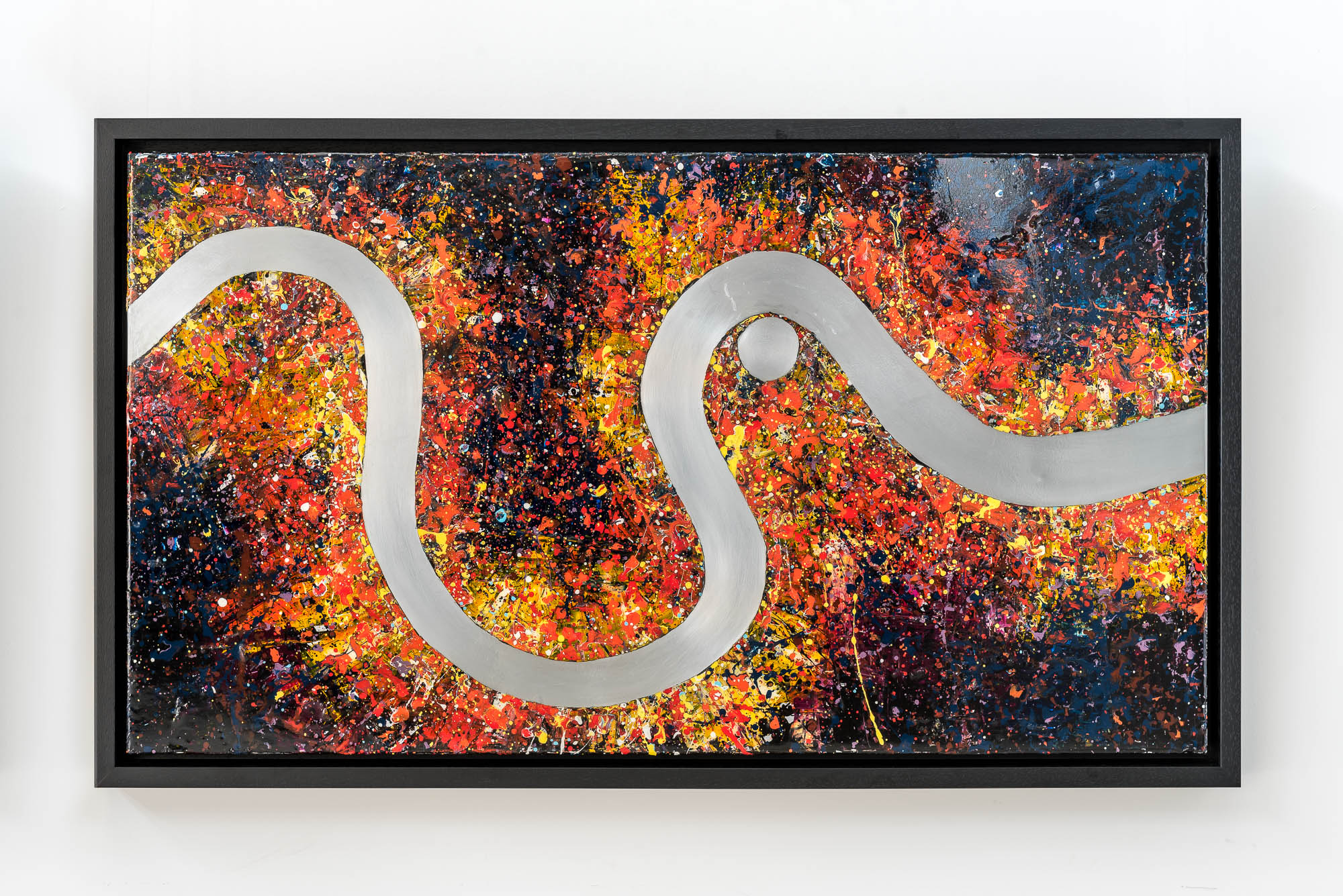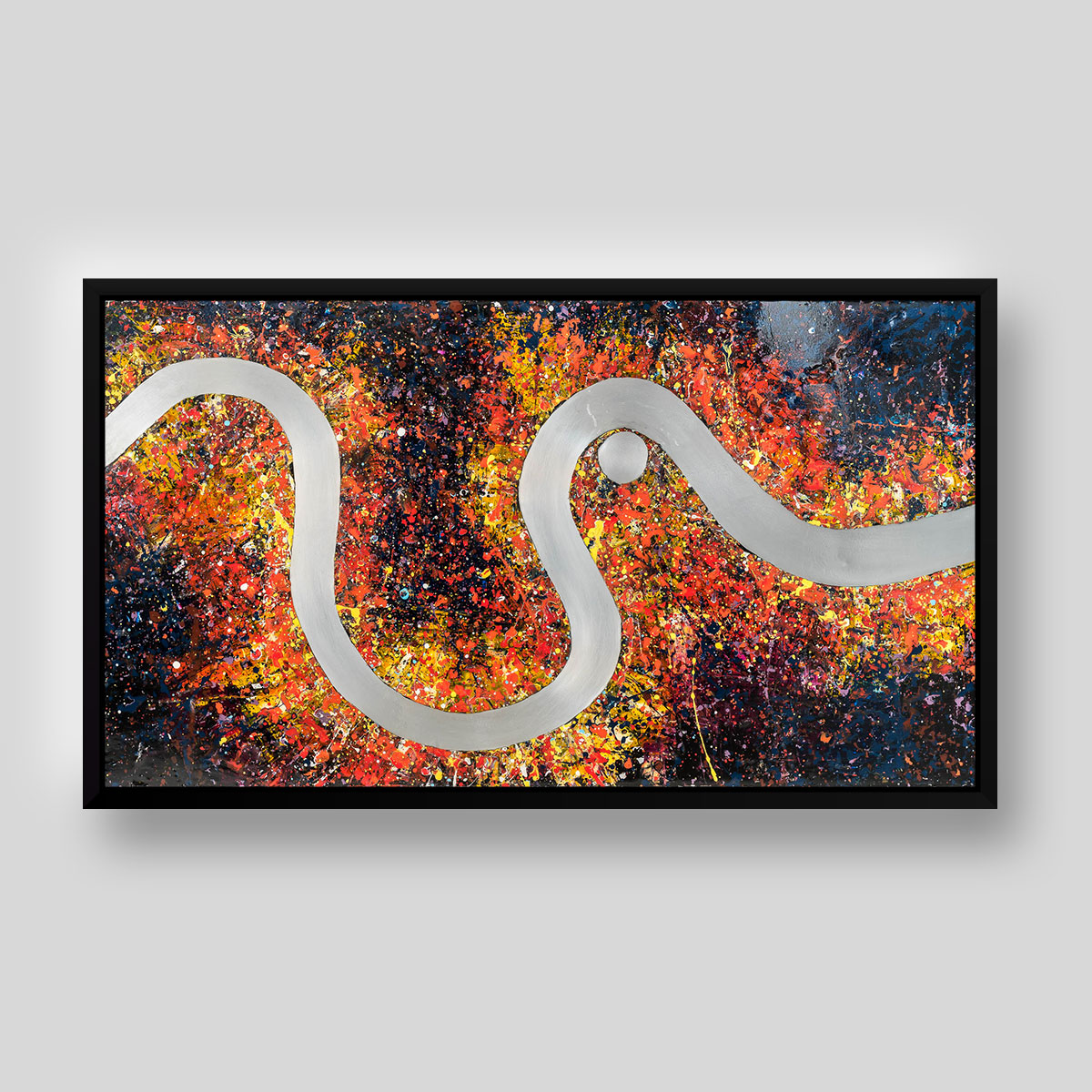 A gleaming aluminium Thames cuts a calm path through energetic splatters of vibrant paint, emulating the relentless melting pot of activity and movement within the capital.