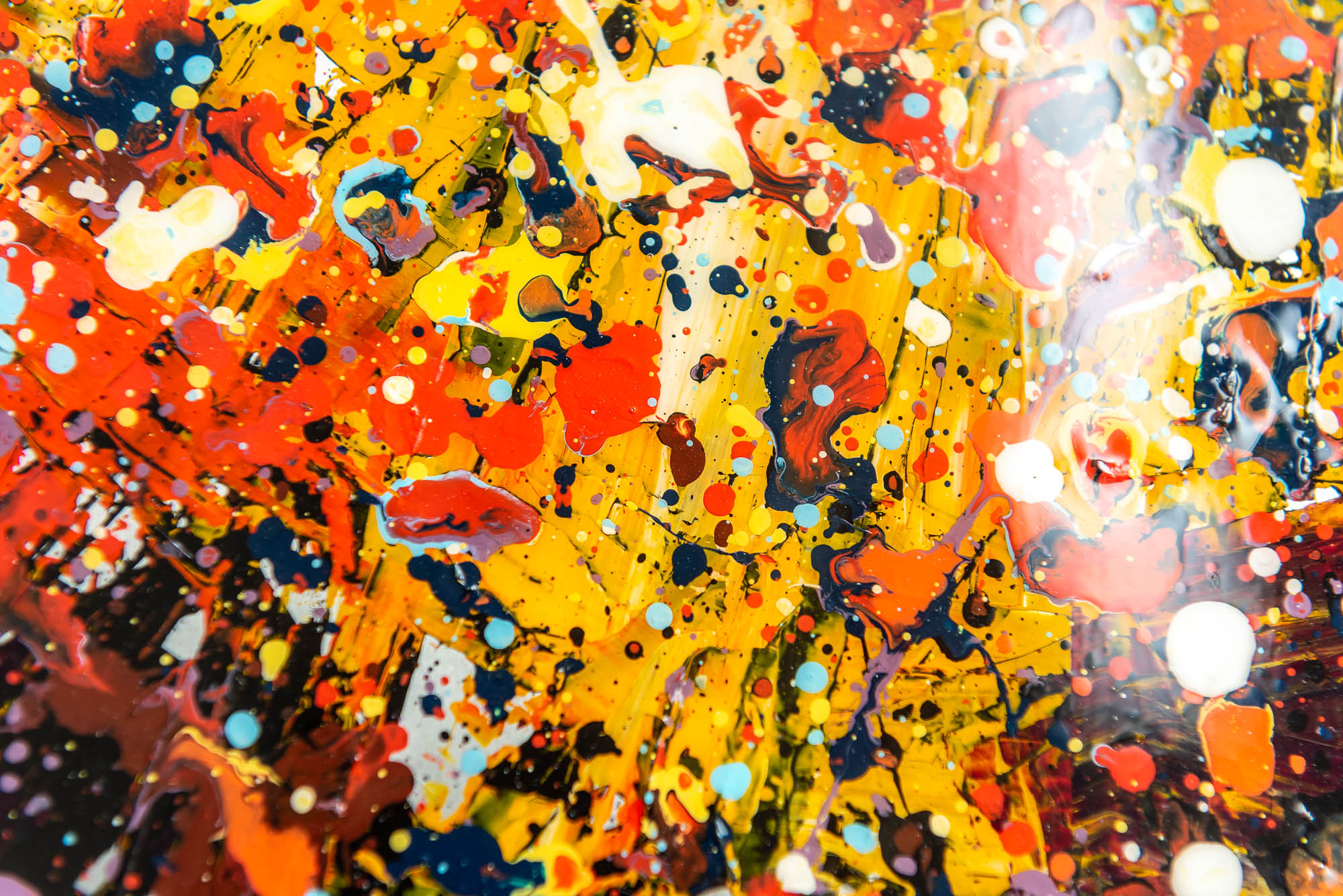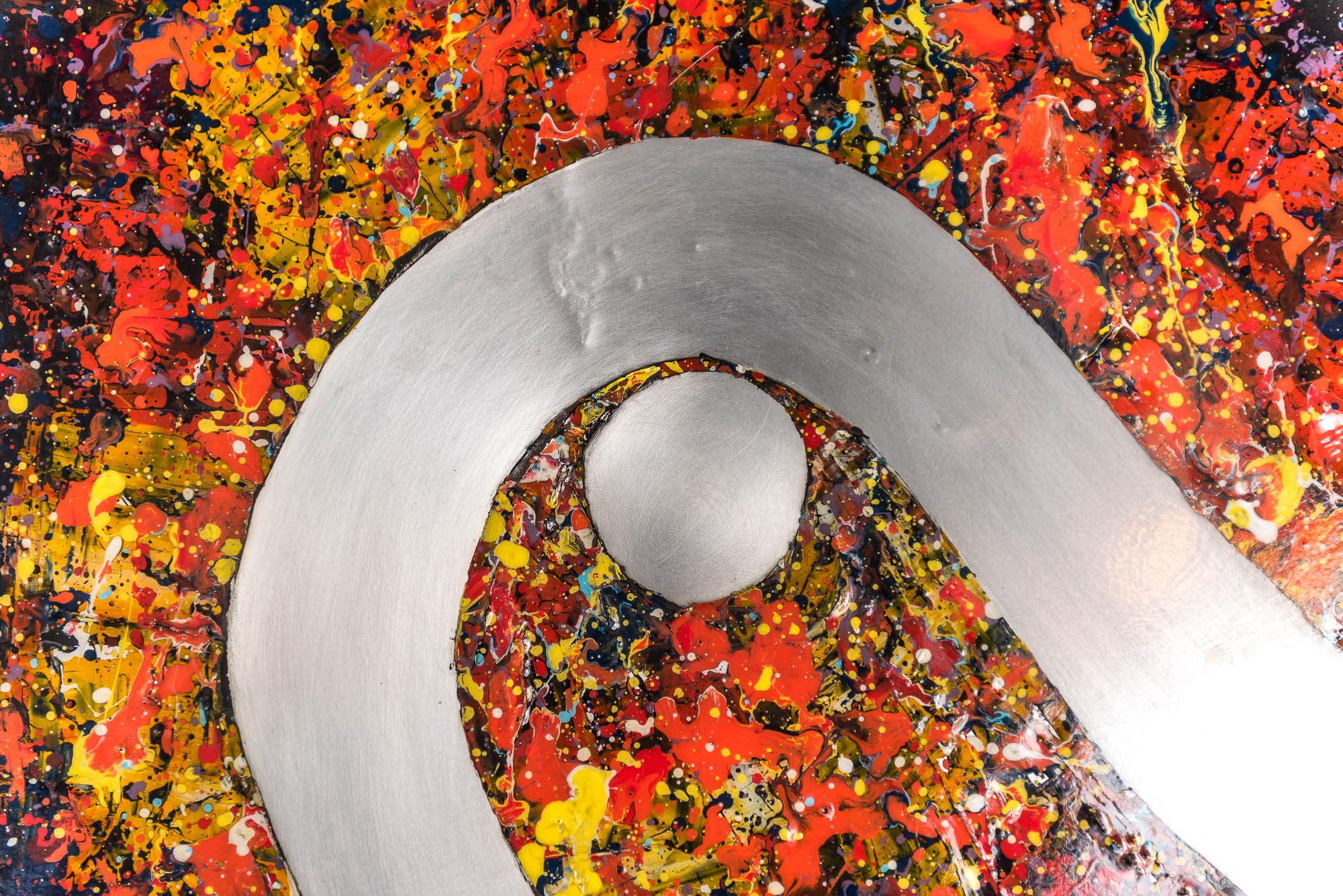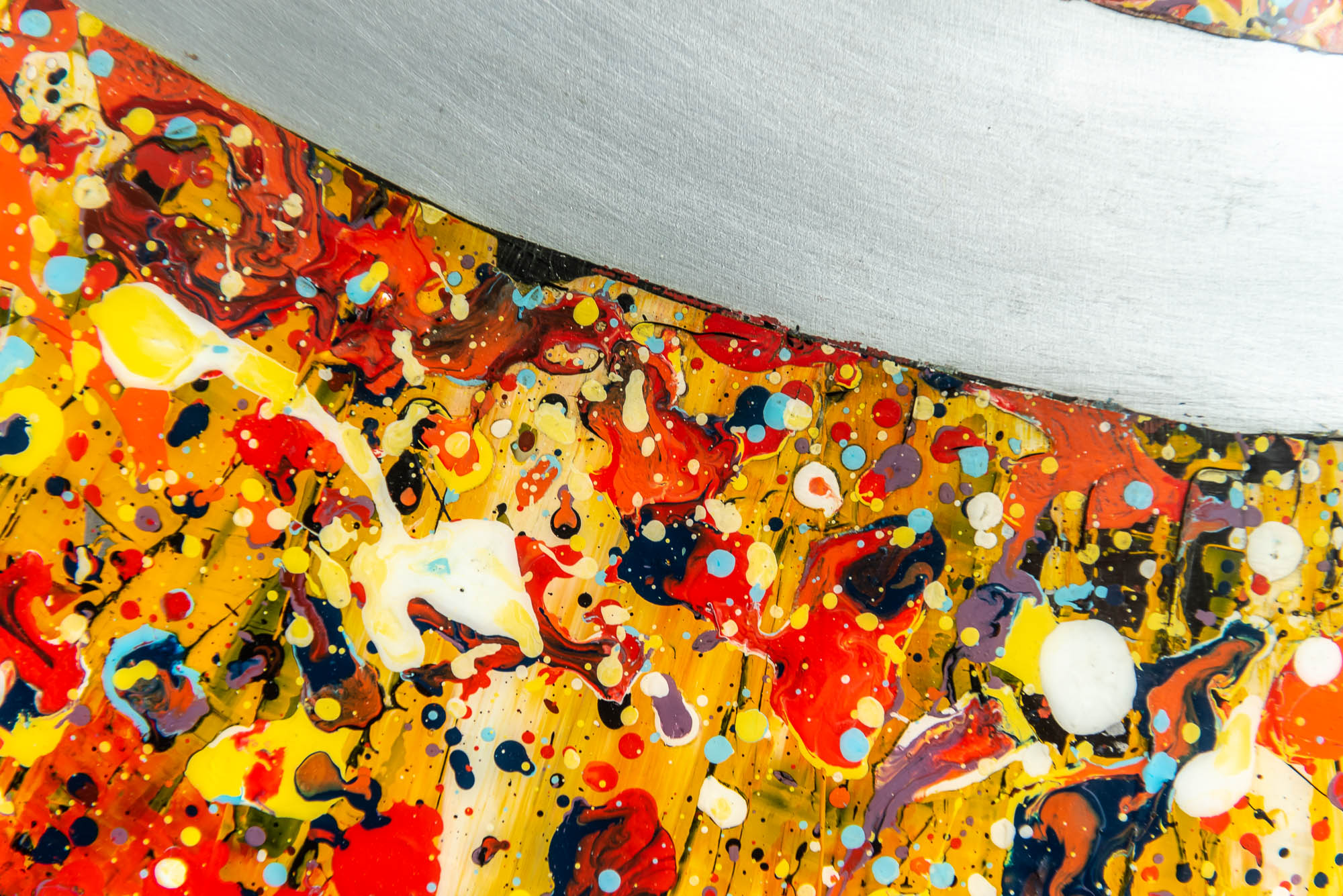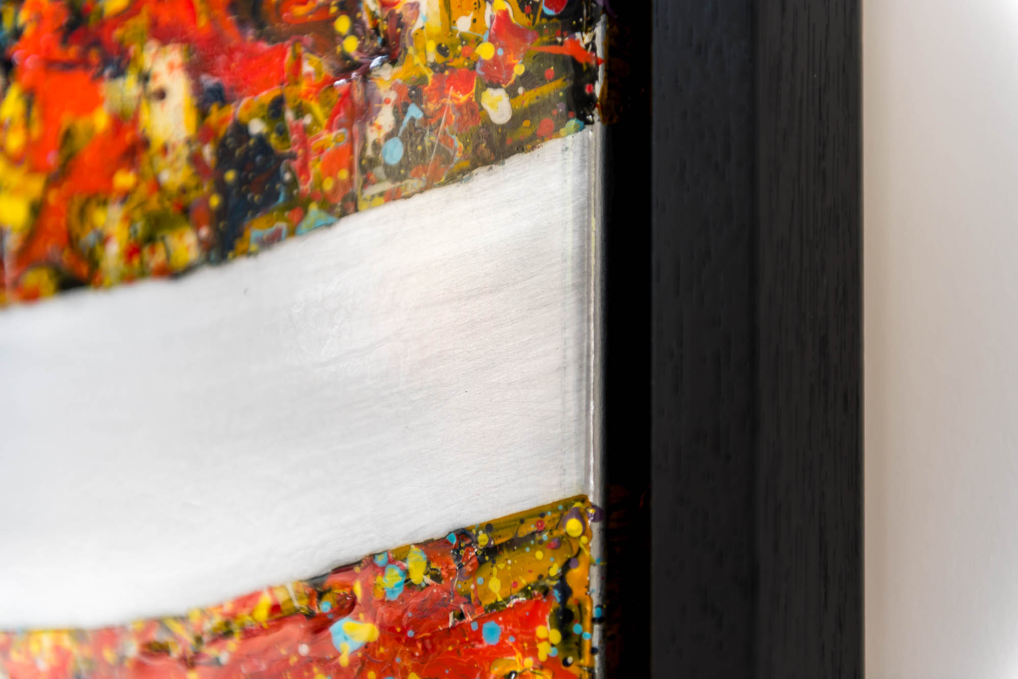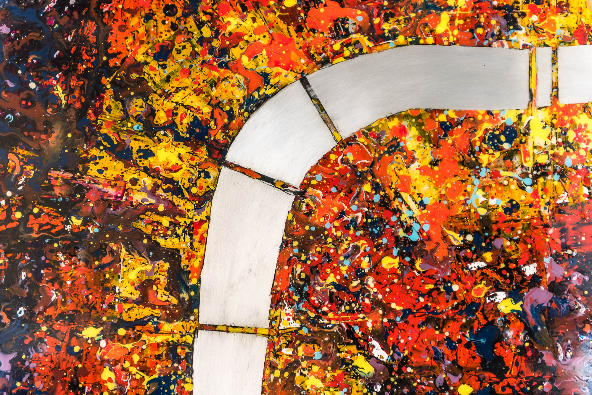 When viewed up-close you can appreciate the striking contrast between the sublime elegant curve of the Thames and the bustling layers of bright paint splashes.